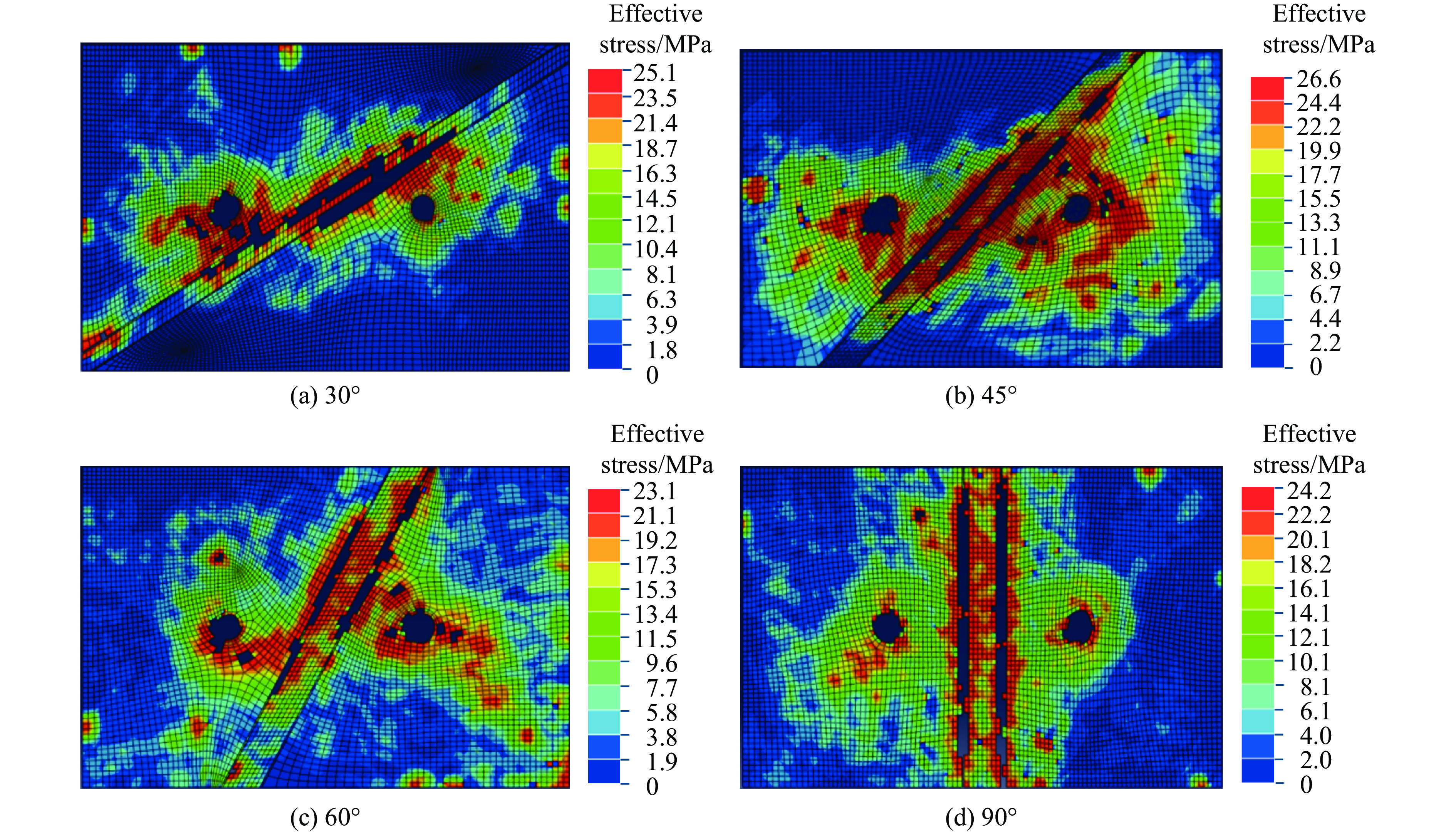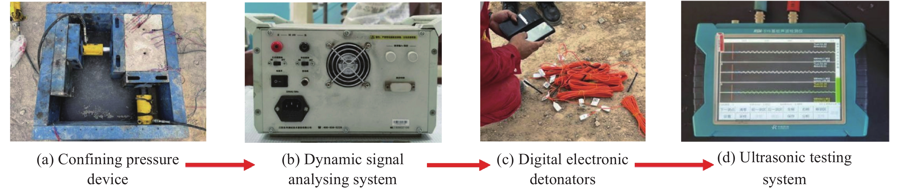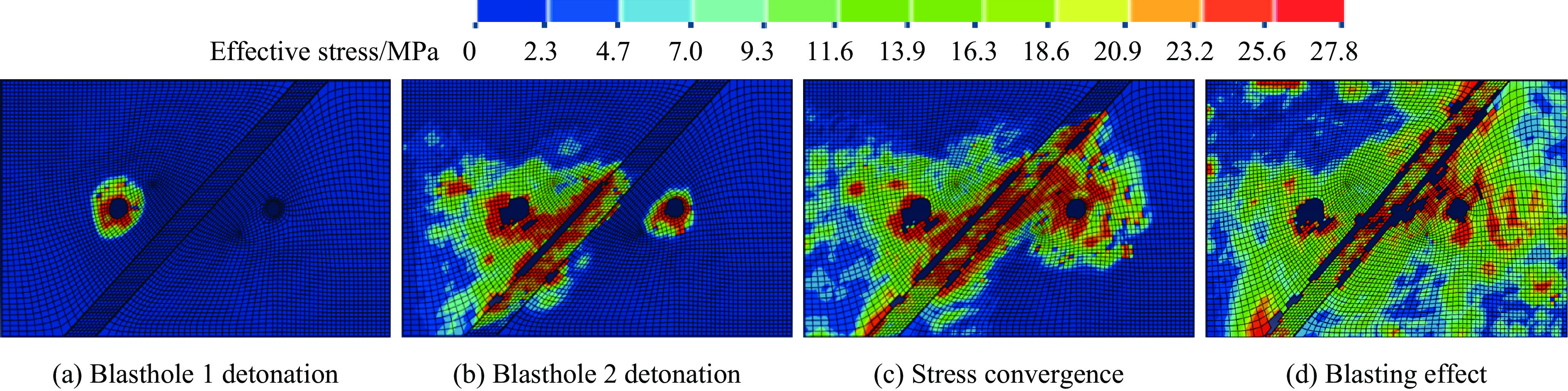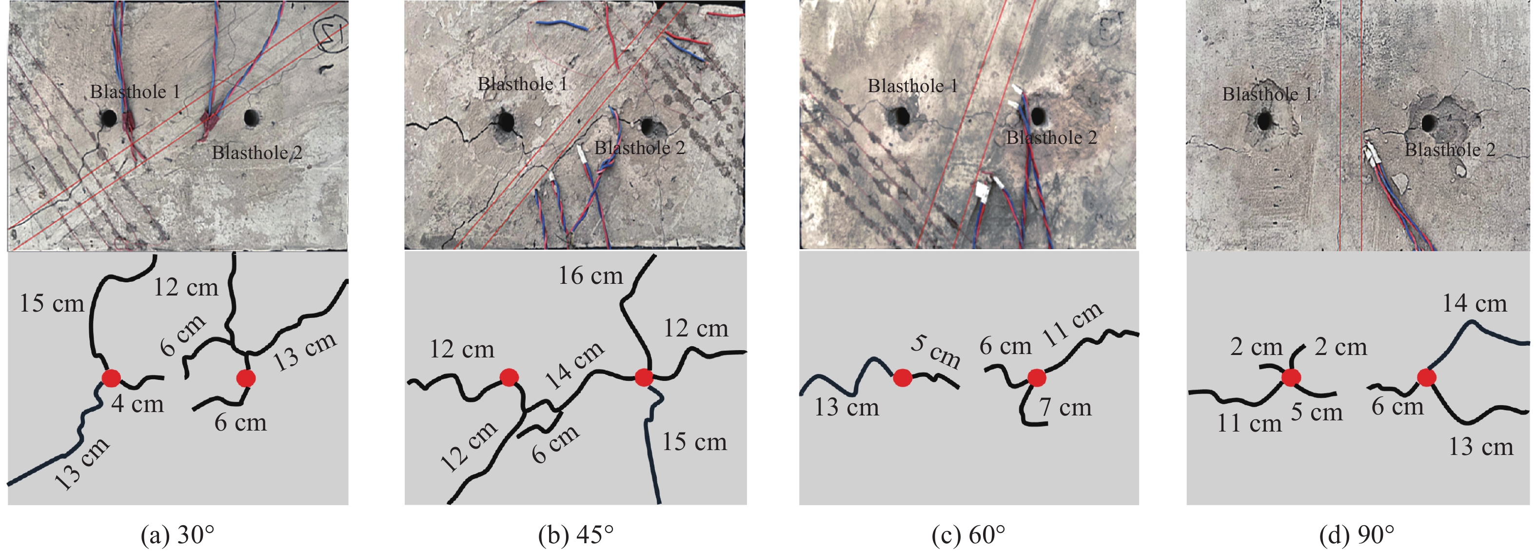In the construction process of drilling and blasting method for layered rock tunnel, the unbalanced distribution of explosion energy was easy to cause serious over- and under-excavation. The joint dip angle, inter-hole delay, and hole spacing were the main influencing parameters. The simulated rock mass samples with different joint dip angles were prepared by the layered pouring method, and the blasting test of layered rock mass was carried out. Based on the ABAQUS simulation software, the blasting crack propagation and stress wave propagation characteristics of layered rock mass under different joint dip angles were analyzed. The results show that the joint dip angle has a significant guiding effect on the stress wave propagation. By affecting the stress distribution, the peak strain and damage degree at different positions are different, which in turn promotes the crack propagation at the joint surface or around the blast hole. The inter-hole delay plays a key role in regulating the crack propagation path. With the increase of delay time, the stress wave superposition area of the pre-blasting hole and the post-blasting hole gradually shifts from the joint center to the surrounding of the post-blasting hole, resulting in the peak strain and damage value of the joint center increasing first and then decreasing, and the failure area of the rock mass shifts to the post-blasting hole accordingly. However, too long delay weakens the synergistic effect of the double-hole stress wave. The increase of hole spacing weakens the stress superposition in the center of the joint, so that the energy is concentrated around the borehole, and the crack propagation mode changes from joint penetration to radial distribution around the borehole. However, too large a hole spacing is easy to lead to the failure of crack penetration between holes due to insufficient energy attenuation and stress superposition, which significantly reduces the crushing efficiency of rock mass. The research results are helpful to the understanding of blasting crack propagation in layered rock mass.
