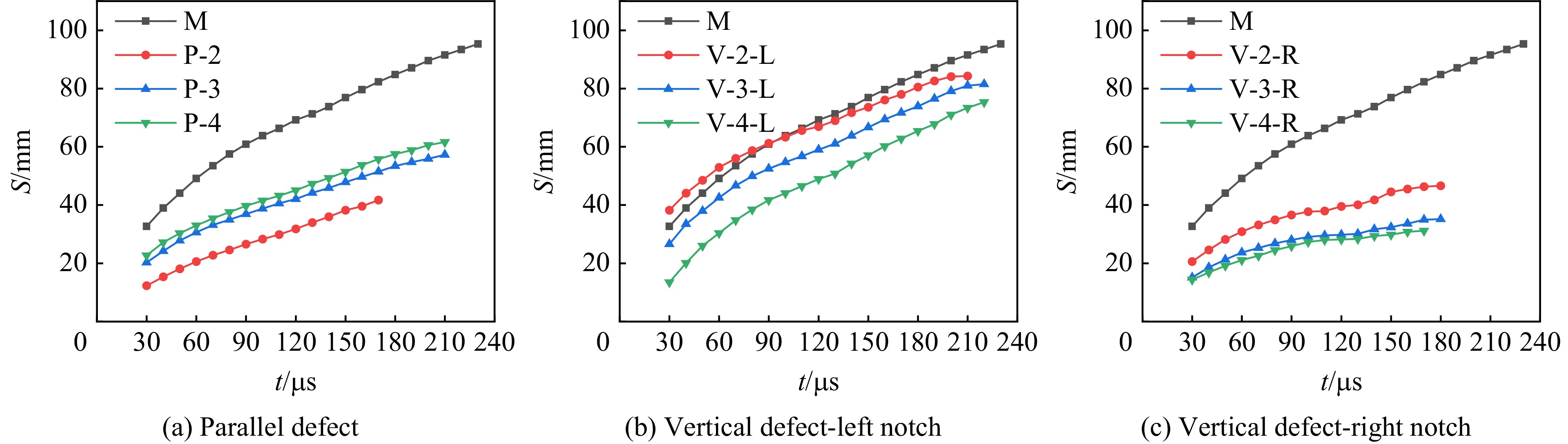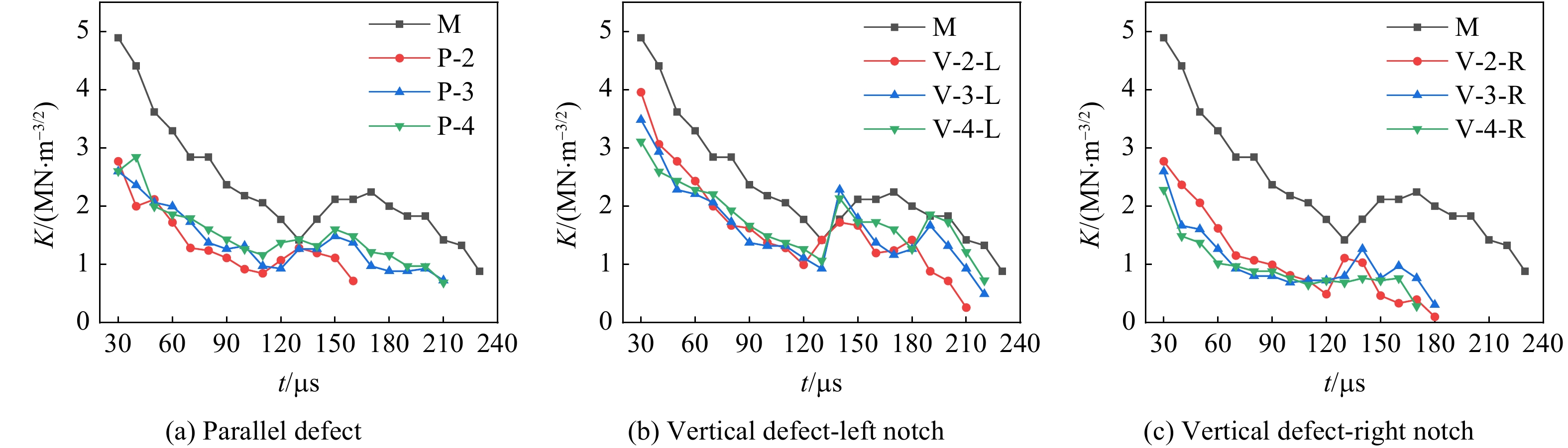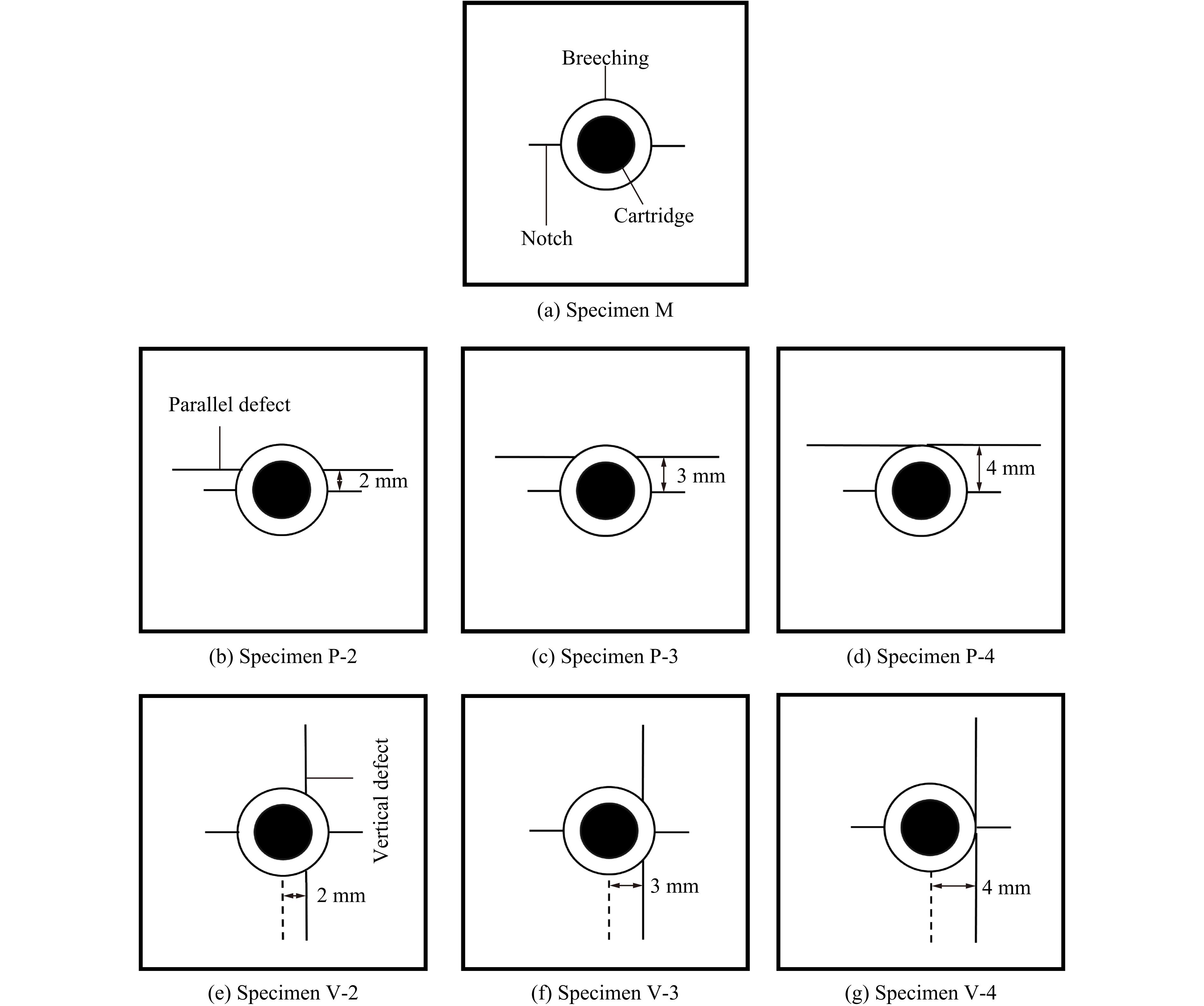 The defective cracks were prefabricated on the wall of the notch holes by using polymethyl methacrylate (PMMA) material, which were parallel or vertical to the notch, and the distance from the defective cracks to the hole center was 2, 3, and 4 mm. The influence of notch hole wall defects on the crack propagation of notch blasting was investigated by using a digital dynamic caustic experimental system with numerical simulation. At the same time, triacetone triperoxide (TATP) explosives were employed as a charge, which served to mitigate the effect of gun smoke on the dynamic caustic experimental system and to improve the experimental design. The results demonstrate that the reflection of the stress wave at parallel defects results in a downward shift in the direction of crack initiation at the notch, but the refraction of the stress wave at vertical defects has no effect on the direction of crack initiation. The presence of wall defects in the hole impedes the impact of stress waves and blast gases on the cracks at the notch, resulting in a reduction in the length, expansion rate, and strength factor values of the cracks, and the degree of inhibition is contingent upon the distance of the defects from the centre of the borehole. As the distance between the parallel defects and the centre of the borehole increases, the inhibition effect of the parallel defects on both sides of the notch cracks gradually decreases. The inhibition effect of vertical defects on the far side of the notch cracks gradually decreases, while the inhibition effect on the proximal side of the notch cracks gradually enhances. The left and right notch cracks of vertical defects are more significantly affected by the boundary reflected stress wave than those of parallel defects. The notch cracks on the left side do not exhibit a clear pattern, owing to the pre-existing reflected stress wave at the defects. In contrast, the notch cracks on the right side are substantially diminished by the boundary-reflected stress wave as the vertical defects move away from the centers of the notch holes.