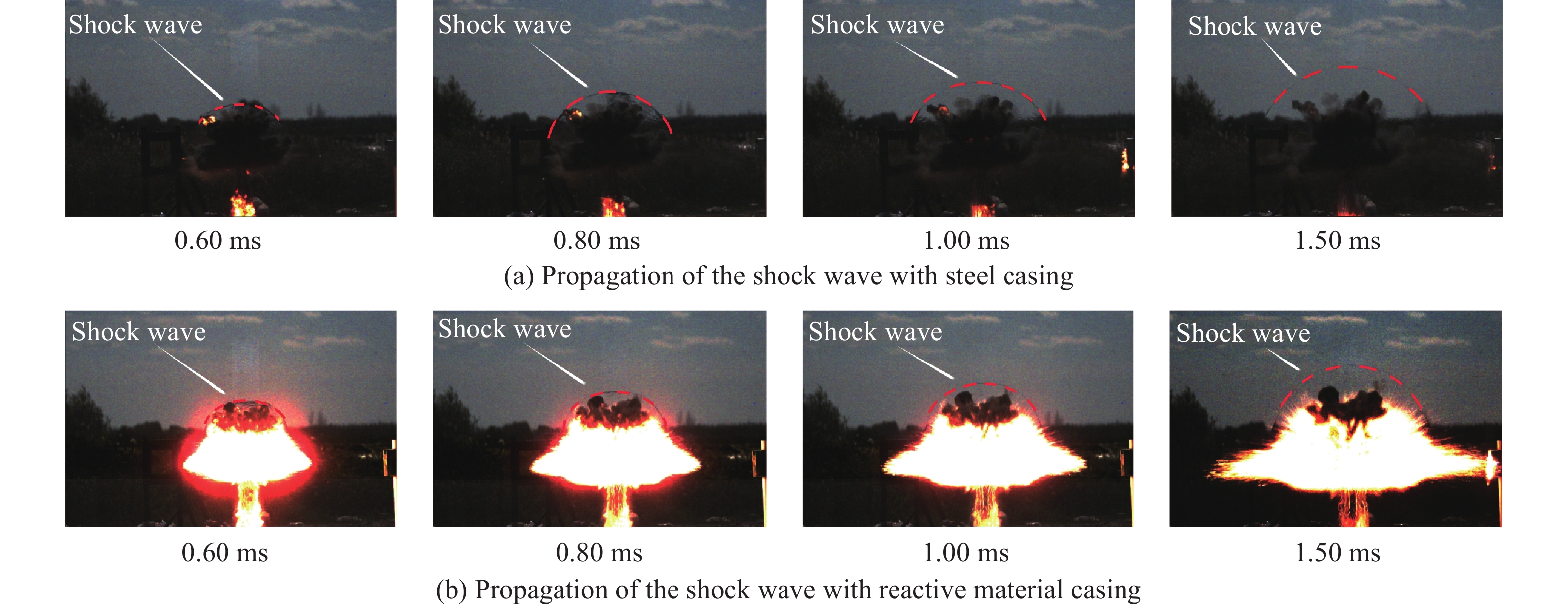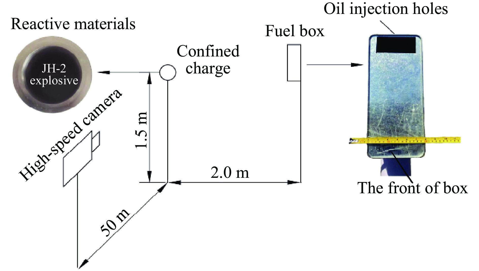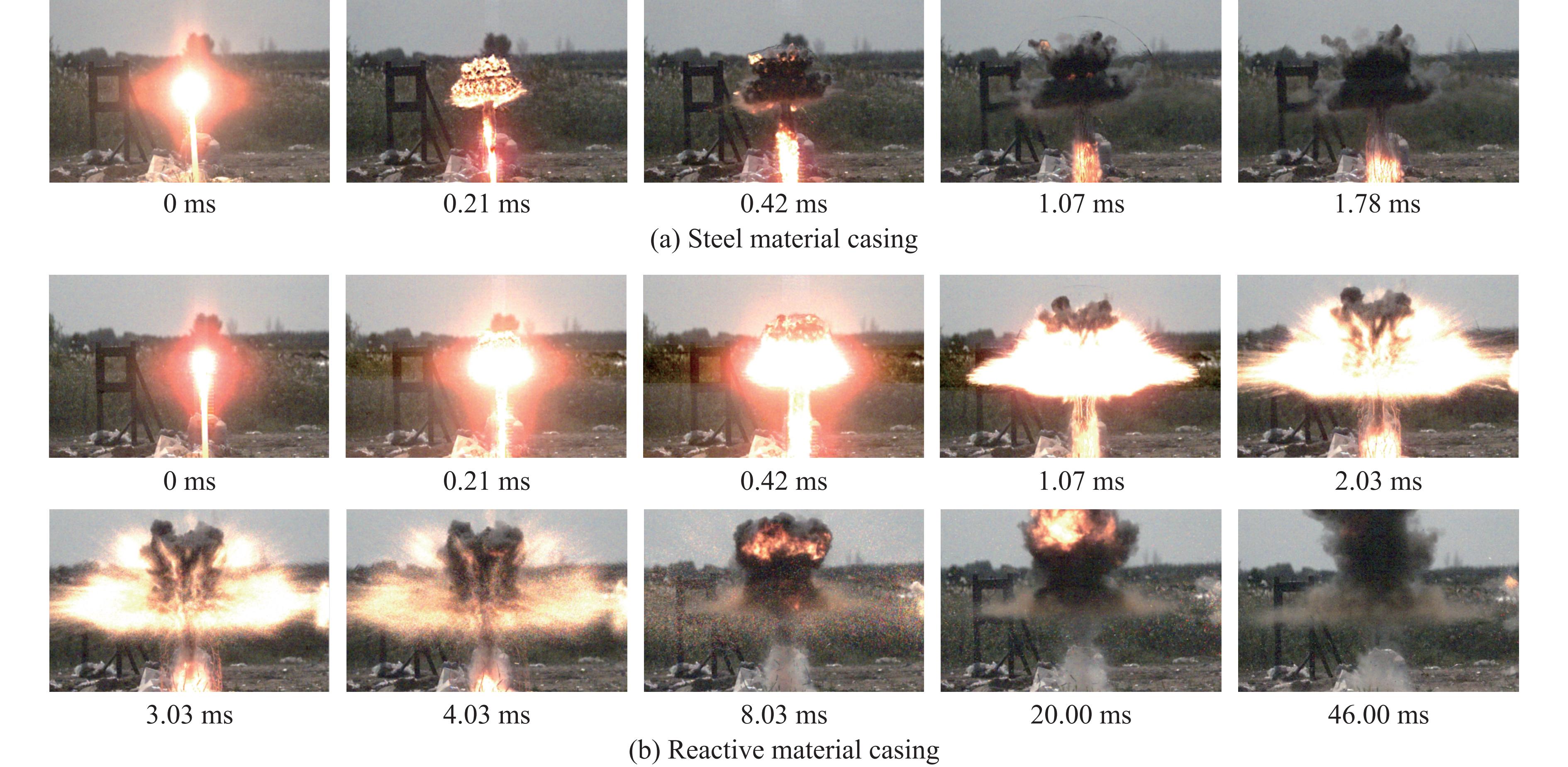 To investigate the explosive energy release of Zr-based reactive material (Zr-RM) casings and the ignition effect of fragments driven by the explosion on fuel, casings composed primarily of zirconium (Zr), copper (Cu), nickel (Ni), aluminum (Al), and ytterbium (Y) were fabricated using alloy melting and casting techniques. The casings mentioned above had an outer diameter of 40 mm, a height of 80 mm, and a wall thickness of 5 mm. For comparison of subsequent damage effects, steel casings made of 45 steel with the same dimensions and mass were also prepared. Both types of casings were filled with JH-2 explosive charges. The charged structures were placed on a polyvinyl chloride pipe stand 1.5 m above the ground, and a fuel box containing 2.5 L of gasoline was positioned 2.0 m away from the explosion center. During the explosion-driven tests, a high-speed camera was utilized to capture the formation and propagation of the explosion fireball, the shockwave, and the impact process of casing fragments on the fuel tank. The fireball duration, shockwave velocity, and fragment impact effects were measured and analyzed. Additionally, the ignition and destruction effects of the fragments on the fuel were observed and recorded. The experimental results demonstrate that, when compared to steel casings of equal mass, Zr-RM casings under explosion-driven conditions exhibit a longer duration of firelight and faster shockwave velocities. Specifically, the fireball duration of Zr-RM casings is approximately 25.84 times that of steel casings, and the shockwave velocity is roughly 1.17 times faster. Zr-RM casings exhibit an enhancement effect on air shockwaves under explosion-driven conditions. Fragments of different materials cause structural damage to fuel tanks, including perforation and plastic deformation. After piercing the fuel tank, the reactive material ignites the fuel inside, demonstrating the ability to ignite gasoline. On the contrary, steel casings of equal mass do not ignite the fuel within the tank. This research provides a reference for the application of Zr-RM casing warheads.