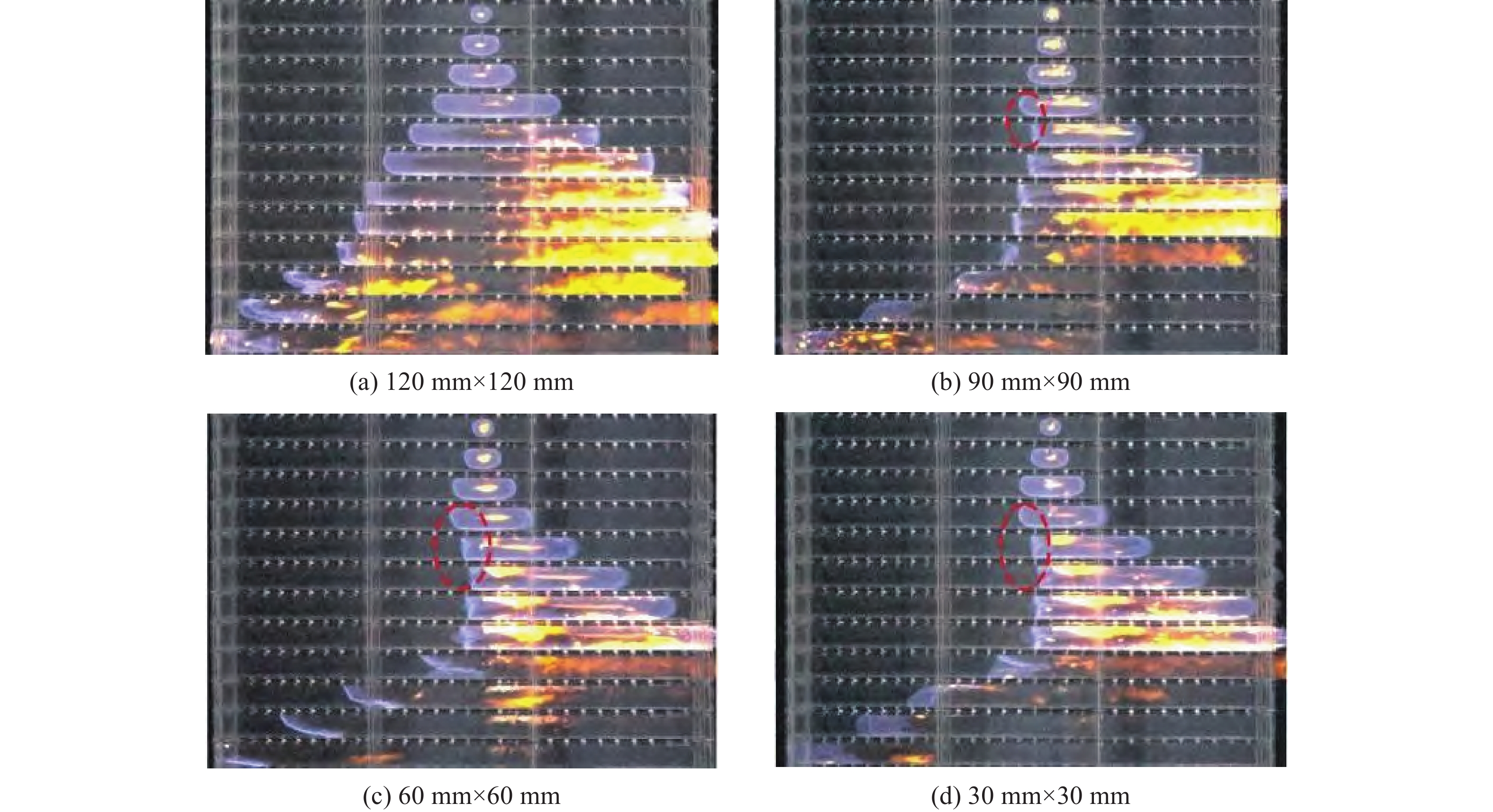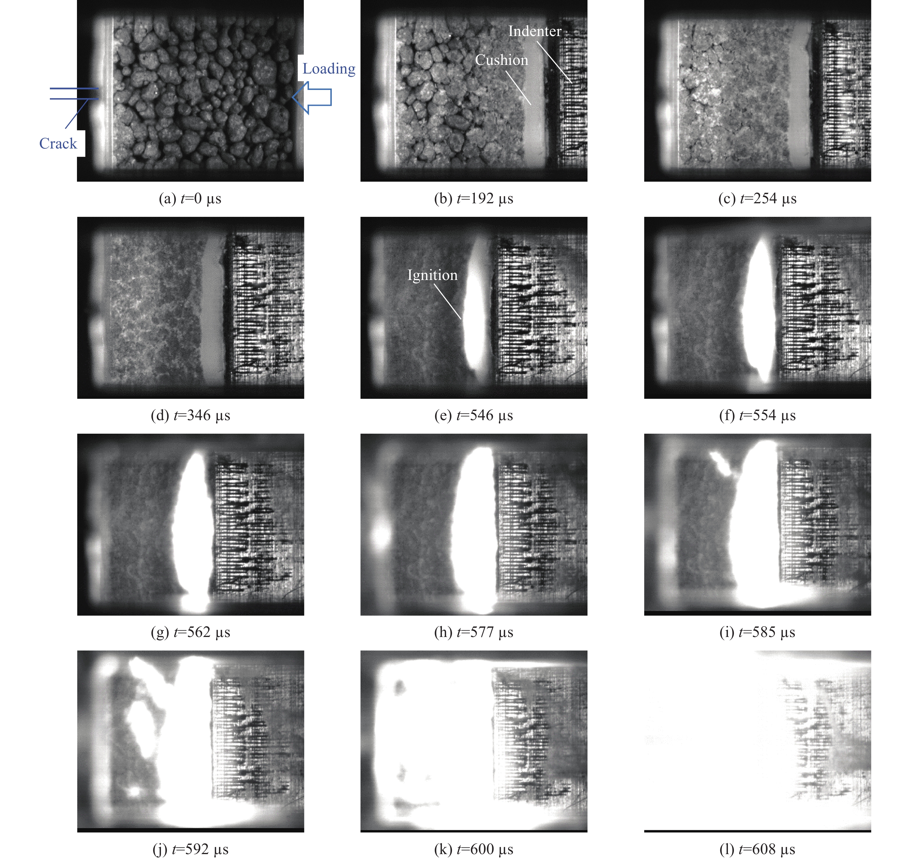 Modeling powder is used to simulate the highly fragmented state of pressed explosives resulting from collisions, and the gap extrusion ignition behavior of PBX modeling powder is studied. Experiments were designed based on the way of projectile impact method. To ensure that no flow space exists except the designed gap, the surface of the sample was covered with cushion and coated with grease for sealing. The movement and reaction of molding powder squeezing into the gap were recorded by high-speed photography. By changing the ratio of gap area to sample cross-sectional area, the influence of compaction on ignition was studied. The results show that in the absence of grease seal, PBX molding powder undergoes particle crushing and compaction, and then the compacted molding powder is extruded from the clearance near the cushion, and ignition occurs in the extrusion process. The ignition position is at the interface between explosive and cushion. In the case of grease seal, PBX molding powder does not ignite for a period of time after compaction. When the indenter moves halfway, a wedge-shaped slip zone is formed, and a slip-dead zone interface could be seen in high-speed camera photos. Then the deformation mode evolves from single-wedge slip zone to double-wedge slip zone, and the shear effect of slip-dead zone interface does not cause ignition. At the later stage of loading, the indenter travels close to the gap surface, and the wedge-shaped slip zone disappears. Before and after the collision between the indenter and the gap, the explosive ignites once in each instance. Compaction effect has an important influence on ignition behavior. After compaction, the threshold value of ignition speed is obviously reduced, with the impact speed required to cause ignition being merely 4.5 m/s.
