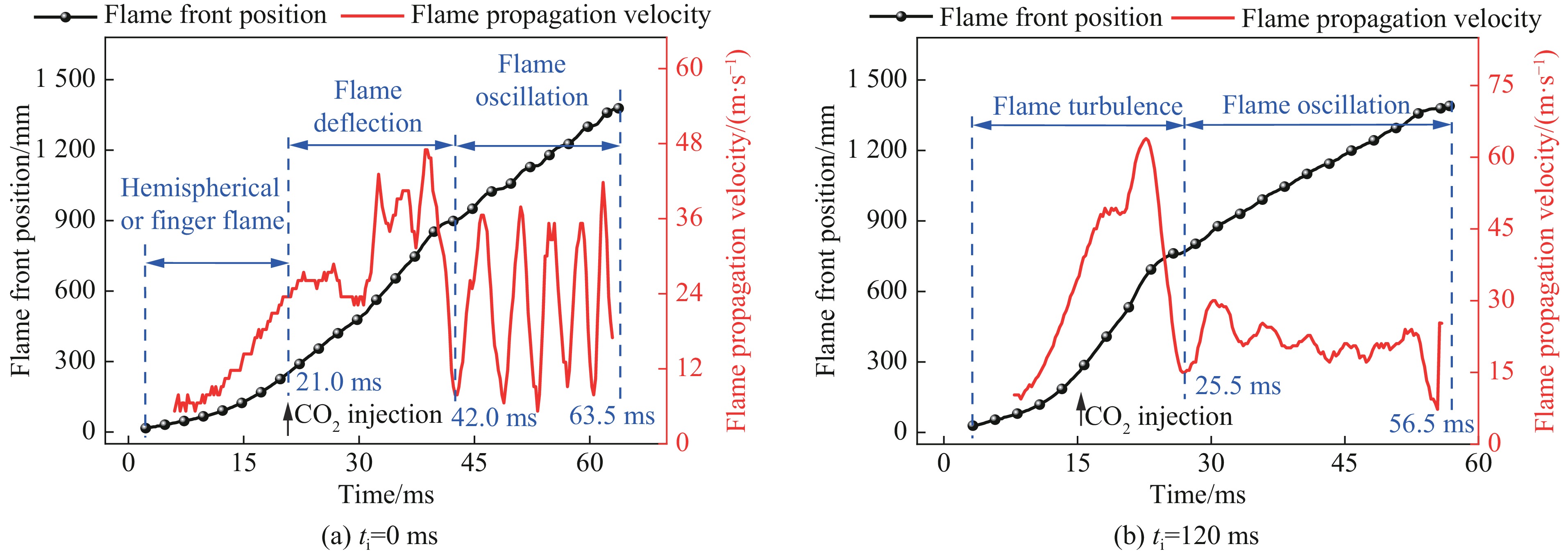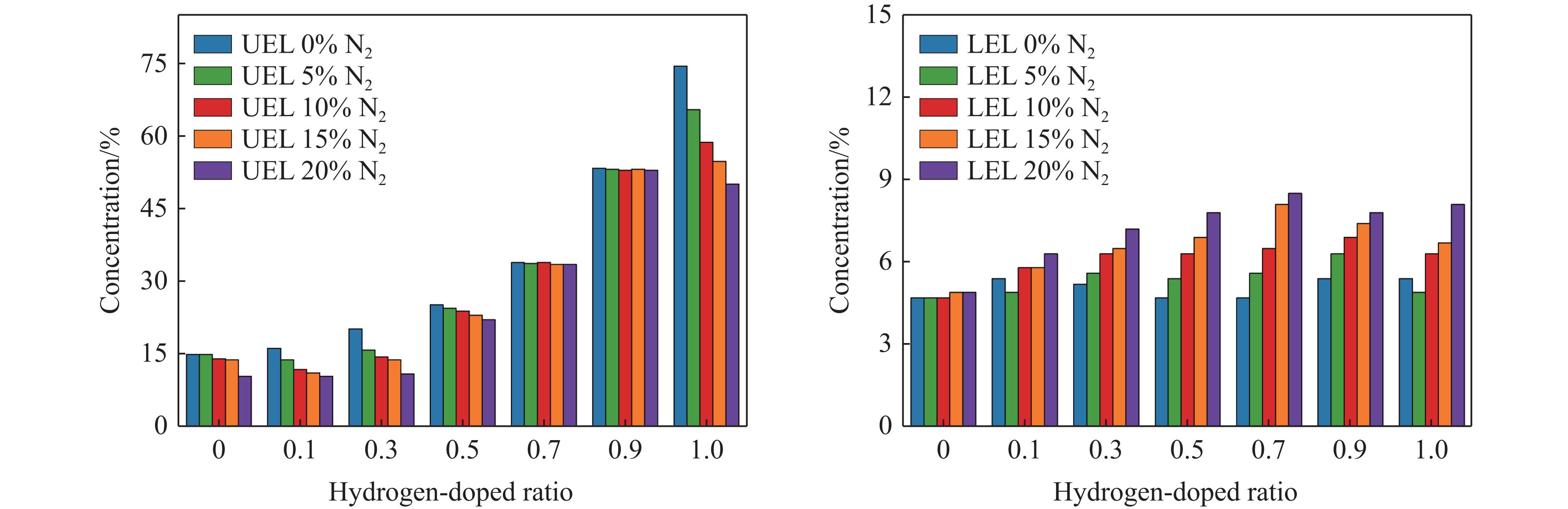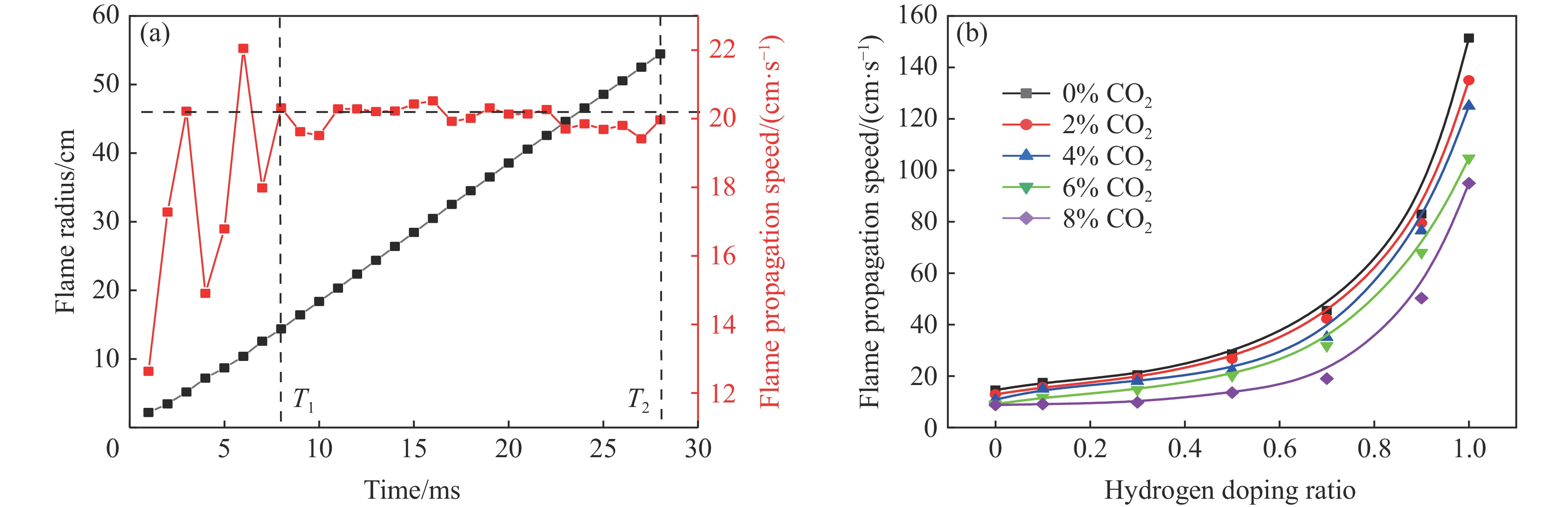Hydrogen-doped natural gas technology has been gradually used in pipeline transportation, but hydrogen-doped natural gas is suspectible to leakage and explosion accidents. The study used a 20-L spherical device to investigate the effects of hydrogen doping ratio and CO2 addition on the explosion pressure and flame propagation characteristics of hydrogen-doped natural gas, and the chemical reaction kinetics method was used to analyze the explosion mechanism. The results showed that the hydrogen doping ratio has a promoting effect on the pressure parameters of hydrogen-doped natural gas explosion and flame propagation speed. As the hydrogen doping ratio increases, the maximum explosion pressure gradually increases, while both the rapid burn time and sustained burn time decrease progressively. The maximum rise rate of explosion pressure and flame propagation speed gradually increase when the hydrogen doping ratio is lower than 0.5. When the hydrogen doping ratio is greater than 0.5, the maximum rise rate of explosion pressure and flame propagation speed rise rapidly. The addition of CO2 has an inhibitory effect on the explosion pressure and flame propagation speed of the mixed gas, but the suppression effect on pressure parameters with high hydrogen doping ratio is weak. Through reaction kinetic analysis, it can be seen that as the hydrogen doping ratio increases, the laminar burning velocity and adiabatic flame temperature gradually increase. Meanwhile the concentration of active free radicals and the product formation rate increase significantly, and the mixing of hydrogen changes the reaction path of methane. When the hydrogen doping ratio is greater than 0.5, reactions R84, R46 and R3 enter the top ten steps of the reaction, producing H and OH radicals, which promotes the reaction. CO2 can reduce the laminar burning velocity, adiabatic flame temperature, active free radical concentration and product formation raten of the mixed gas, but adding CO2 does not change the reaction path of methane.Hydrogen-doped natural gas technology has been gradually used in pipeline transportation, but hydrogen-doped natural gas is prone to leakage and explosion accidents. The study used a 20L spherical device to investigate the effects of hydrogen blending ratio and CO2 addition on the explosion pressure and flame propagation characteristics of hydrogen-doped natural gas, and the chemical reaction kinetics method was used to analyse the explosion mechanism. The results showed that the hydrogen doping ratio has a promoting effect on the hydrogen-doped natural gas explosion pressure parameters and flame propagation speed. As the hydrogen doping ratio increases, the maximum explosion pressure gradually increases, the rapid burn time and sustained burn time are gradually decreasing. The maximum explosion pressure rise rate and flame propagation speed gradually increase when the hydrogen doping ratio is less than 0.5. When the hydrogen doping ratio is greater than 0.5, the maximum explosion pressure rise rate and flame propagation speed rise rapidly. The addition of CO2 has an inhibitory effect on the explosion pressure and flame propagation speed of the mixed gas, but the suppression effect on pressure parameters with high hydrogen doping ratio is poor. Through reaction kinetic analysis, it can be seen that as the hydrogen doping ratio increases, the laminar burning velocity and adiabatic flame temperature gradually increase, the mole fraction of active free radicals and the rate of product increase significantly, and the mixing of hydrogen changes the reaction path of methane. When the hydrogen doping ratio is greater than 0.5, reactions R84, R46 and R3 enter the top ten steps of the reaction, producing H and OH radicals, which promotes the reaction. CO2 can reduce the laminar burning velocity, adiabatic flame temperature, active free radical mole fraction and rate of production of the mixed gas, but adding CO2 does not change the reaction path of methane.