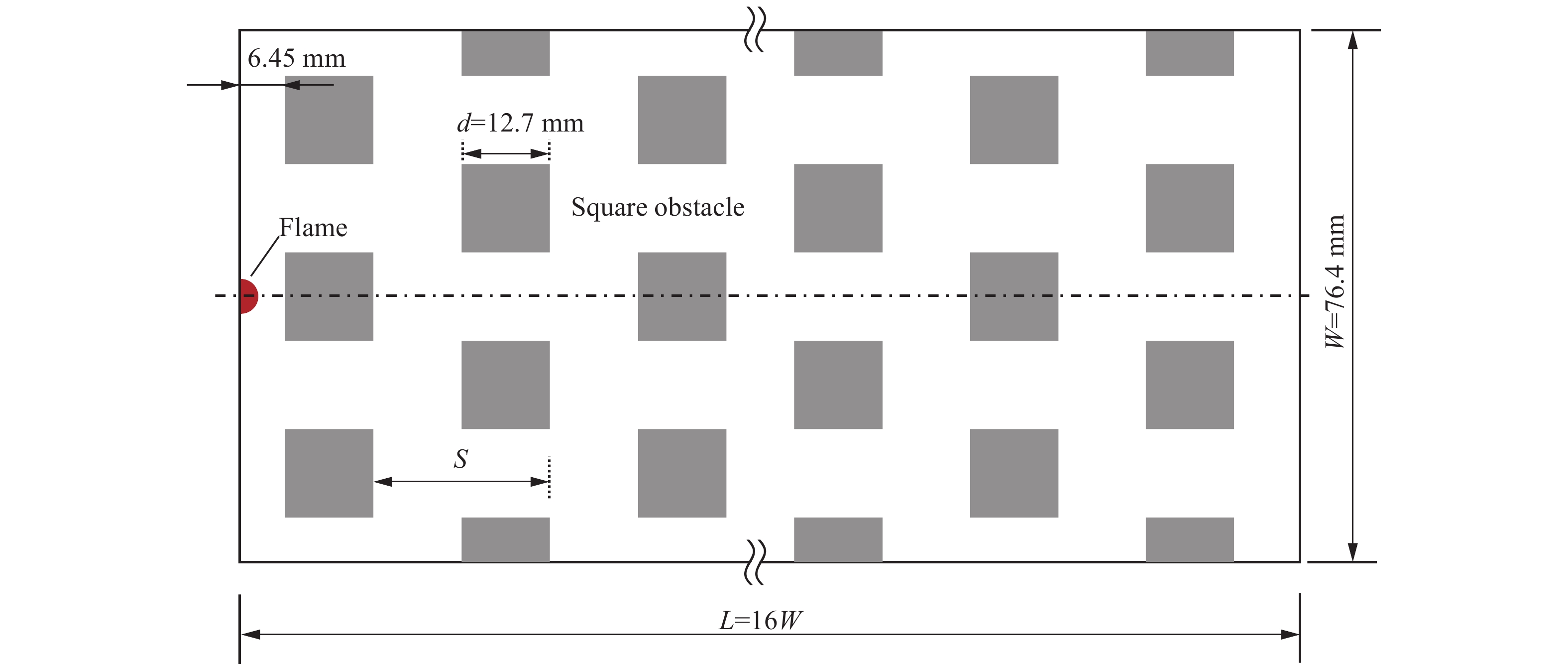 Study on gas deflagration-to-detonation transition (DDT) is of great significance for the research and development of industrial explosion prevention and detonation propulsion technology. Staggered array of obstacles is a typical obstacle layout that may be involved in the gas ignition and explosion scenario. Its existence usually significantly promotes the occurrence of DDT. In view of the lack of understanding of DDT in staggered array of obstacles, high-precision algorithm and dynamic adaptive grid were applied to solve the two-dimensional, fully compressible reactivity Navier-Stokes equations coupled with a calibrated chemical-diffusive model. Numerical investigation on the initiation process of DDT of premixed hydrogen and air in staggered array of square obstacles under different obstacle spacings was carried out. The results showed that decreasing obstacle spacing is beneficial to increase flame surface area in the early stage of flame acceleration and enhance compression of unburned gas by shock wave in the later stage, thus shortening DDT run-up time and distance. However, when the obstacle spacing is reduced to a threshold value, stuttering detonation occurs and the DDT run-up distance increases. The occurrence of DDT is mainly caused by the interaction between the flame and the shock wave reflected from the front wall of obstacle. The detonation partially decouples when it diffracts around an obstacle. Detonation re-initiation may be triggered when the decoupled detonation collides with a wall or with the shock wave or failure detonation wave from the other side of the obstacle. If the obstacle spacing is too small, the shock wave intensity decays significantly during detonation decoupling. This can easily lead to detonation failure. In addition, shock waves can be reflected off the staggered array of square obstacles in the vertical and parallel directions to the flame propagation direction, which help shock waves to act on the flame and unburned gas mixture. Therefore, DDT is more likely to be initiated in the staggered array of square obstacles than that of circular obstacles.