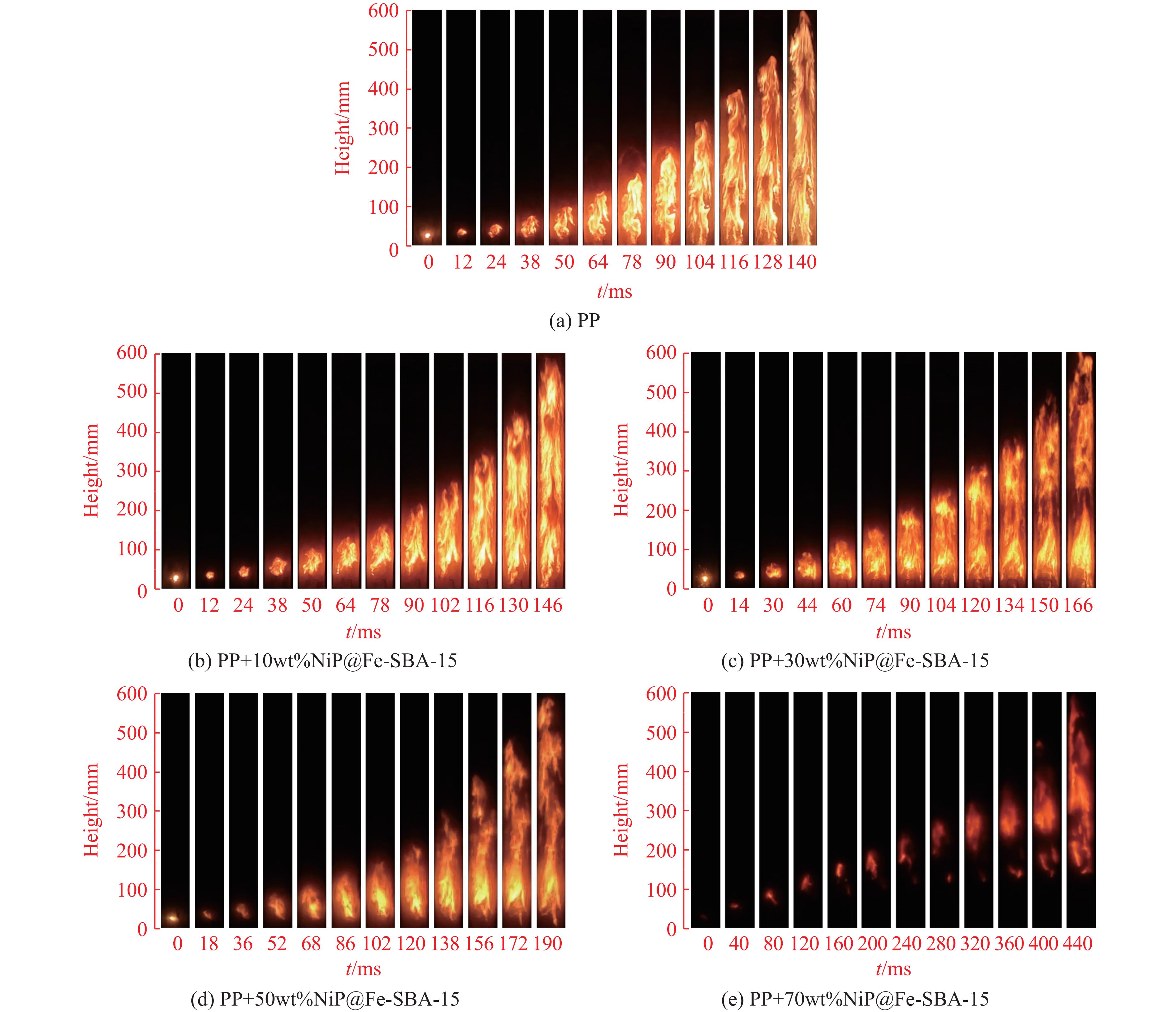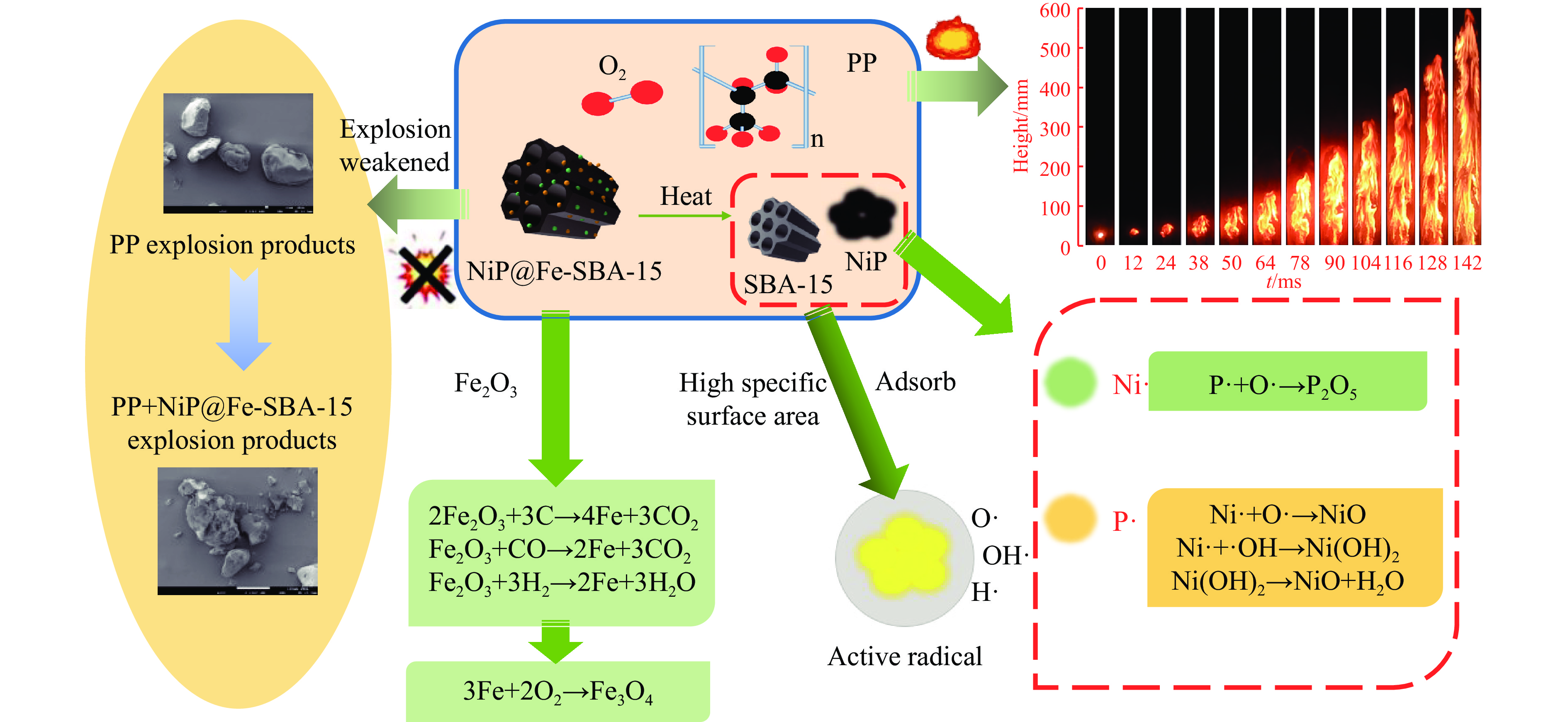 Polypropylene (PP) is widely utilized in industrial production, yet PP dust generated during its production and transportation can form explosive dust clouds, leading to severe dust explosion accidents that threaten personnel and equipment safety. To address this issue, a novel explosion suppressant, NiP@Fe-SBA-15, was synthesized to inhibit the propagation of PP dust combustion flames. The synthesis involved modifying SBA-15 mesoporous silica with Fe ions and subsequently loading NiP, resulting in a composite powder with uniformly dispersed active components and a well-preserved mesoporous structure. Characterization via SEM-Mapping and N2 adsorption-desorption experiments revealed that NiP@Fe-SBA-15 maintains a high specific surface area, exhibits a regulated pore structure, and shows no significant particle agglomeration. The Hartman tube explosive testing system was employed to evaluate the effect of NiP@Fe-SBA-15 on PP dust deflagration. Results indicated that as the NiP@Fe-SBA-15 additive increased, the flame propagation speed, brightness, and flame length of PP deflagration decreased significantly, with flame propagation almost completely inhibited by a suppressant dosage with the mass fraction of 70 %. The dual explosion suppression mechanism of NiP@Fe-SBA-15 was analyzed. Physically, NiP@Fe-SBA-15 occupies reaction space, reducing oxygen and combustible volatile concentrations, while the SBA-15 molecular sieve, exposed by thermal decomposition of the suppressant, absorbs heat and forms a physical barrier, thereby reducing combustion intensity. Chemically, NiP decomposition releases Ni· and P· radicals that consume key free radicals (H·, O·, OH·) in combustion reactions, interrupting explosion chain reactions. Meanwhile, Fe-based species rapidly oxidize to Fe3O4, reducing oxygen availability and further weakening combustion intensity. In summary, NiP@Fe-SBA-15 was proven to be an effective explosion suppressant for PP dust explosions, reducing combustion intensity through combined physicochemical synergies. This research provides a new approach to enhancing polypropylene industry safety. Future work will focus on optimizing the industrial application of NiP@Fe-SBA-15 explosion suppressants while addressing cost, environmental sustainability, and stability issues to further advance dust explosion prevention technology.