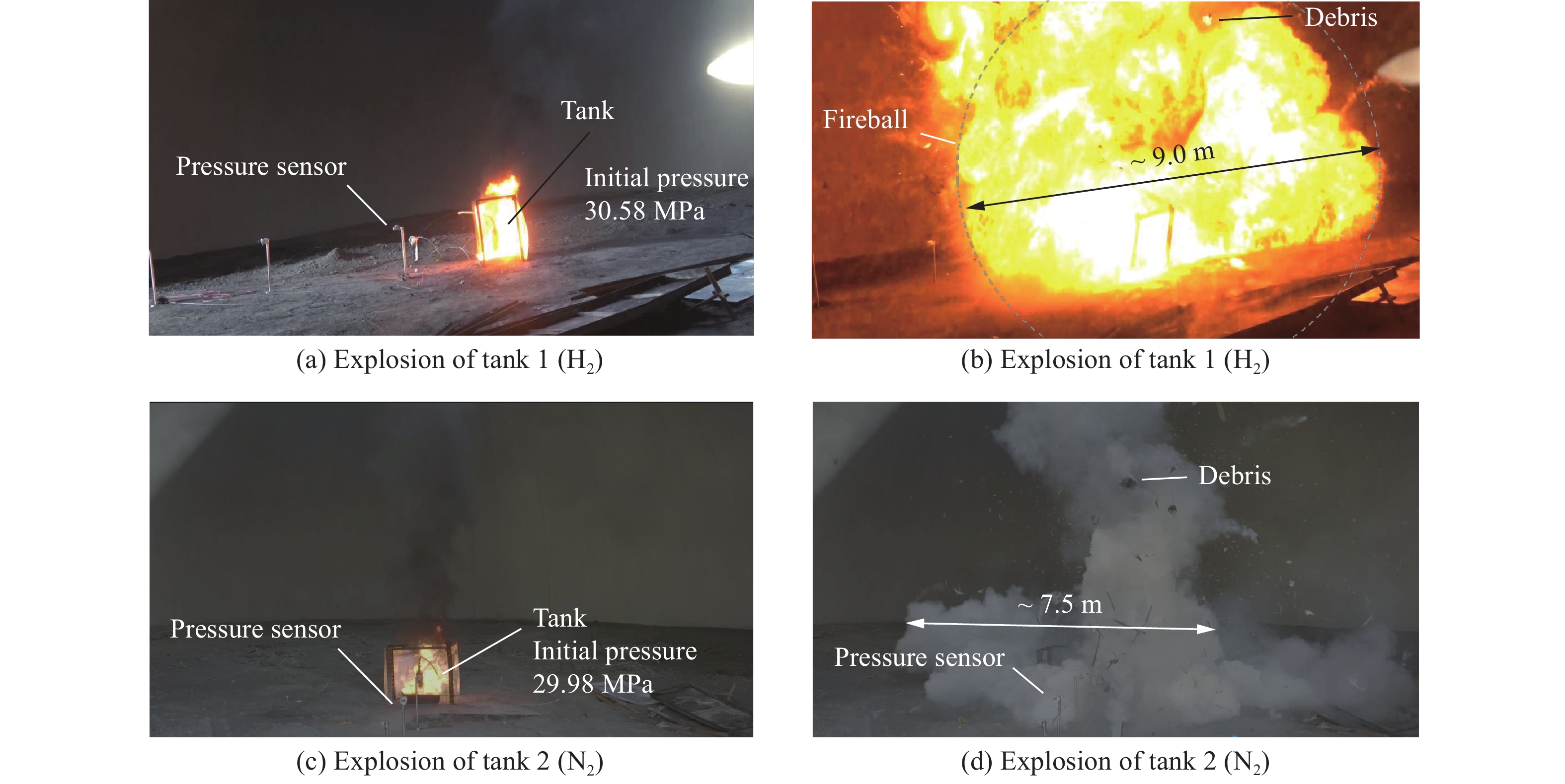 Understanding the generation, transformation, and dissipation mechanisms of energy in high-pressure tanks during fire scenarios is of critical significance for the consequence assessment of explosion accidents. This study investigates the differences in properties between high-pressure hydrogen storage tanks and nitrogen tanks under fire conditions through comparative experiments. Fire tests were conducted using 6.8L-30MPa type Ⅲ tanks. The results indicate that fire exposure can significantly impair the pressure-bearing capacity of the tanks. Specifically, the critical bursting pressure decreased from 125.1 MPa at room temperature to 46.8 MPa under fire conditions, representing a reduction of 62.6%. The explosion dynamics of hydrogen tanks were characterized by typical physical-chemical composite features. A fireball with a diameter of 9 m was formed during the explosion. The peak shockwave pressure measured at a distance of 2 m reached 882.47 kPa, with a positive pressure duration of 168.11 ms. In contrast, nitrogen tanks experienced only physical explosions, with a peak shockwave pressure of 59.42 kPa and a positive pressure duration of merely 2.17 ms. This study analyzed the energy conversion pathways during explosions of high-compressed gas tanks (H2 and N2) in open environments. A novel method for assessing the blast power of hydrogen storage cylinder explosions in unconfined spaces was developed. Initially, the physical explosion energy was calculated based on fundamental parameters such as critical burst pressure, nominal volume, and initial filling pressure of the high-pressure tanks. The applicability of five mechanical energy calculation models was compared. Subsequently, the mass of hydrogen was determined using the actual gas equation, and the total chemical explosion energy was derived by integrating the heat of combustion of hydrogen. Finally, considering the contributions of mechanical and chemical energy to the shock wave intensity, the total explosion energy was converted into shock wave energy using an open space energy correction factor. Quantitative analysis and error verification were conducted in conjunction with measured data. The findings of this research provide essential support for enhancing risk assessment of explosion accidents involving high-pressure hydrogen storage devices.
