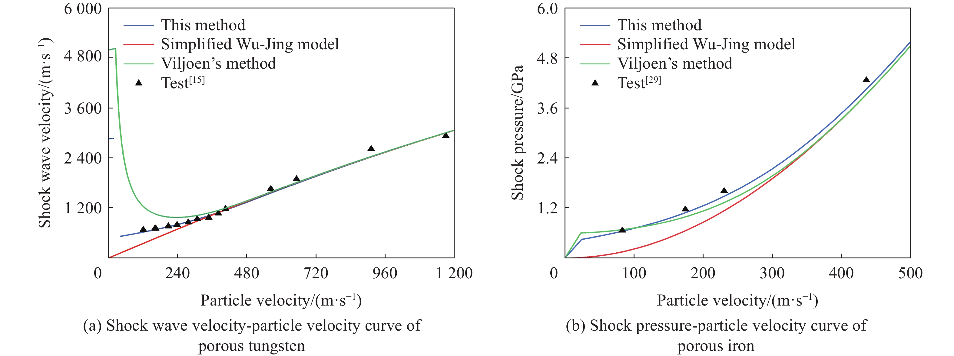 Porous materials exhibit pore collapse behavior during impact compression. Based on the shock wave structure observed in experiments carried out by predecessors, a theoretical analysis of the relationship between the shock wave formation process and the pore collapse behavior of porous materials is conducted. Firstly, considering the compression curve characteristics of porous materials and the overtaking of shock waves, it is proposed that the shock wave structure of porous materials has three modes: low-pressure single wave mode, double shock wave mode, and high-pressure single wave mode. These different shock wave modes are mainly caused by the influence of elastic-plastic mechanical behavior in pore collapse on the compression curve of porous materials. Furthermore, combined with the Wu-Jing equation of state, the calculation method of shock compression characteristics compatible with different shock wave modes is developed. The relationship between the Hugoniot curve of porous material and dense material is established, and the calculation equation of impact specific volume compatible with single shock wave mode is obtained, which can directly calculate the critical specific volume without approximate conditions. In addition, the equation of pore collapse established by Carroll is modified by taking the linear approximation of the variation of porosity with pressure in the elastic stage and the elastic-plastic stage and considering the relationship between the stress of the matrix material and the macroscopic stress in the porous material. Based on the calculation model of shock compression characteristics considering pore collapse behavior, the Hugoniot data of the material are calculated, and the influence of pore collapse behavior on the shock compression characteristics of porous materials is discussed. The results show that the shock compression characteristics of the material are significantly affected by the pore collapse behavior at lower pressures, and the model in this paper can predict the shock wave parameters of porous materials more accurately.