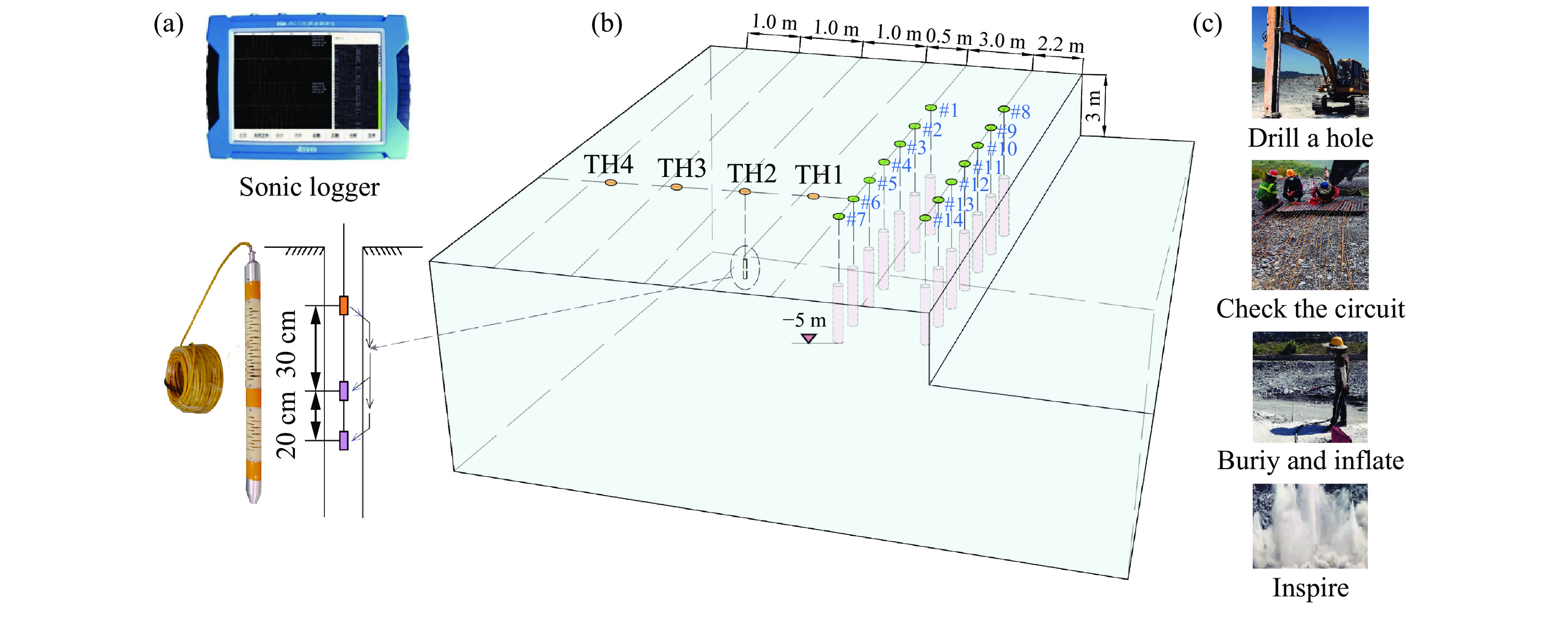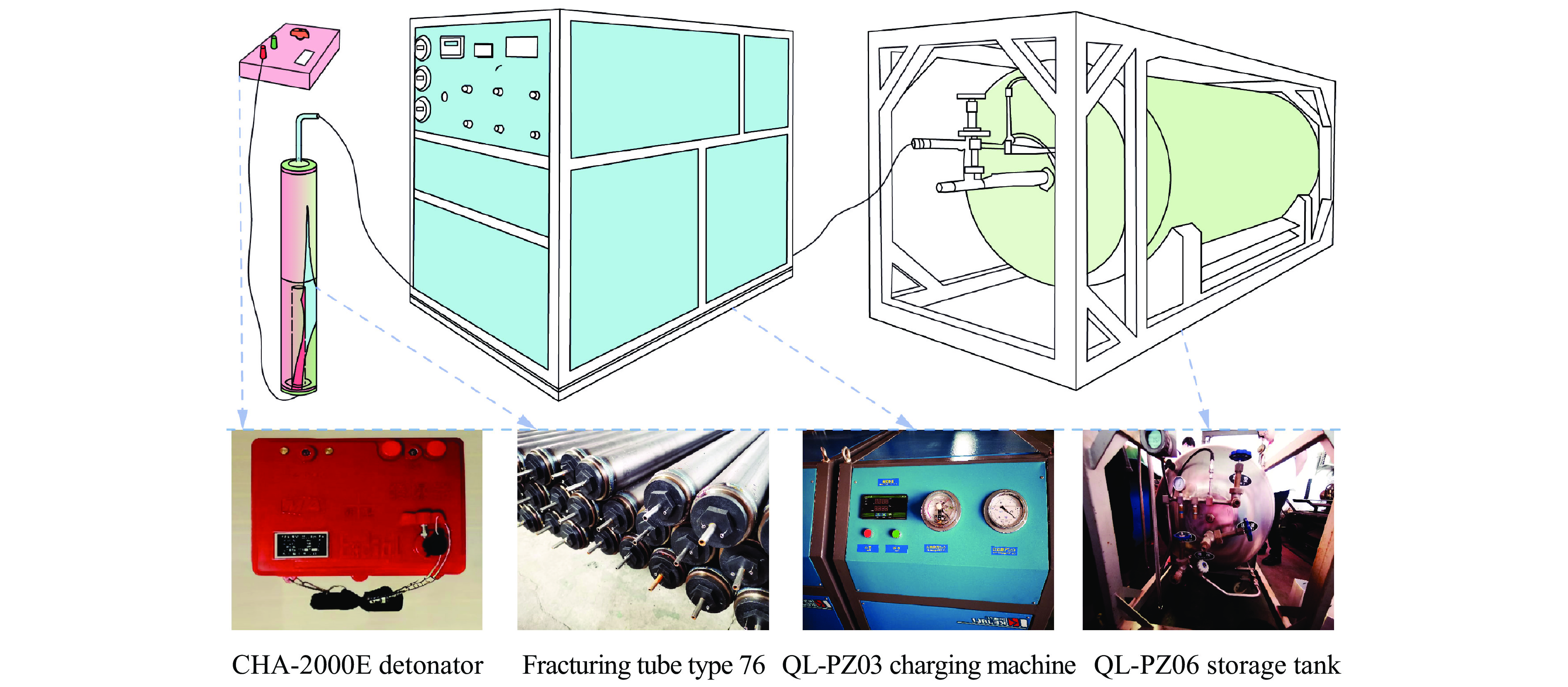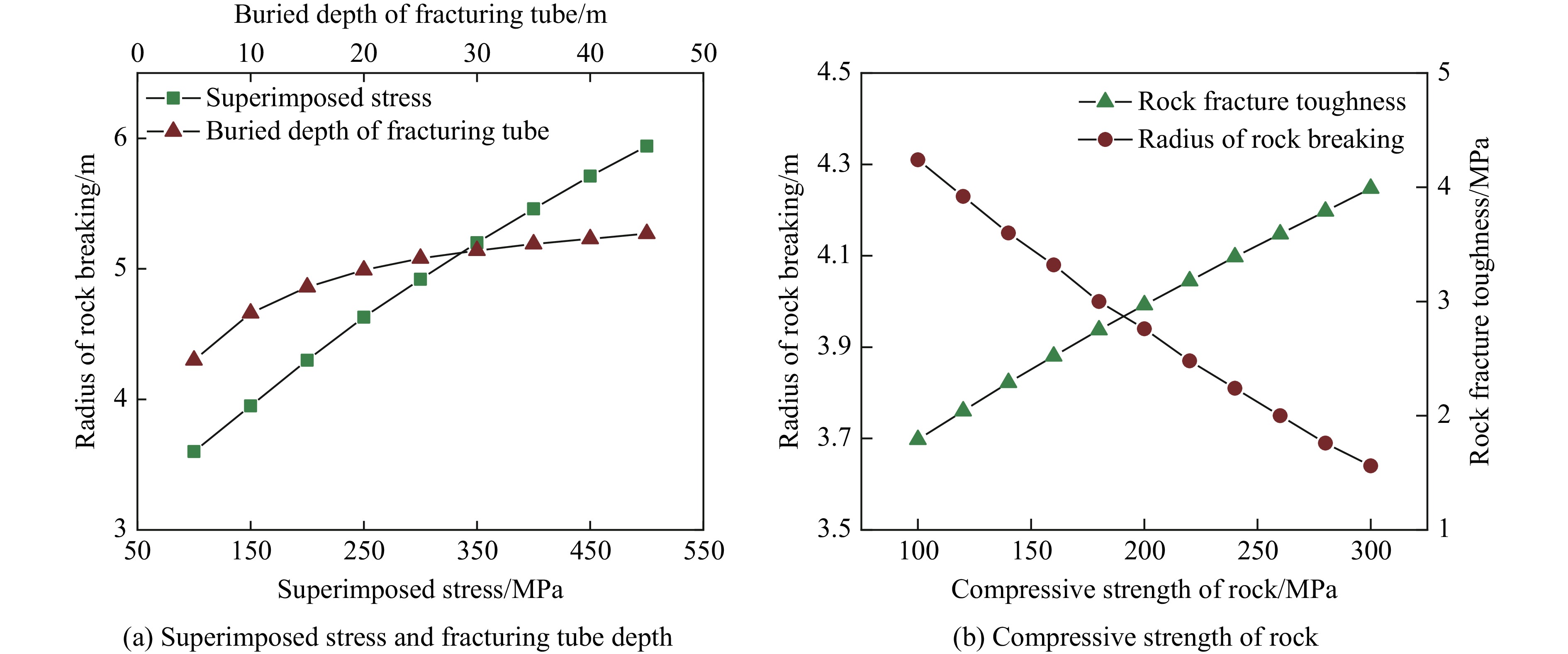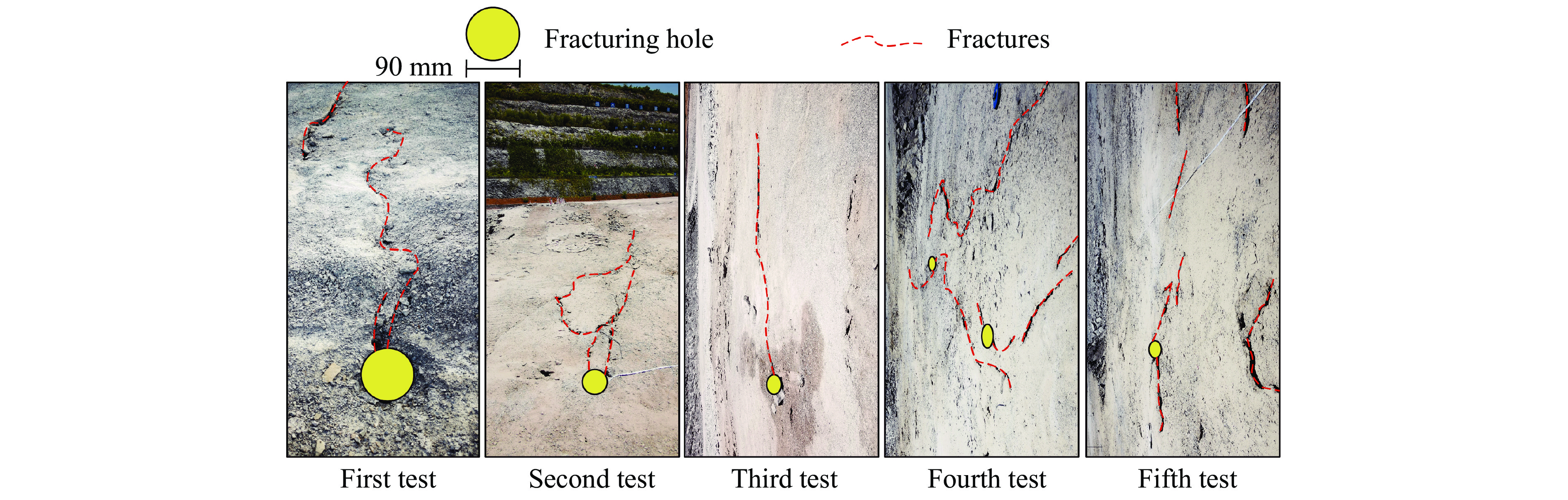 Supercritical CO2 phase transition rock-breaking is a dynamic destruction process under the combined action of shock waves and high-pressure gas. To deeply investigate the rock-breaking mechanisms of supercritical CO2 phase transition under multi-hole synchronous initiation and in-situ stress coupling conditions, targeting the actual working conditions of CO2 field rock-breaking, the initial rock-breaking pressure of a single hole was analyzed based on the thin-walled cylinder theory. A predictive model for the joint rock-breaking radius of multi-hole shock waves and high-pressure gas under in-situ stress was developed by integrating the one-dimensional detonation gas expansion theory. Field experiments on multi-hole CO2 phase transition rock-breaking were subsequently conducted for comparative validation. The results show that when the fracturing pipe is buried shallowly, the influence of in-situ stress on the stress distribution of the rock mass is relatively weak. When the pressure of a single hole is consistent, the more fracturing holes there are, the greater the superposed peak stress of each hole. In the direction perpendicular to the layout of the test hole, the peak stress of each hole shows a U-shaped parabolic distribution. The superposed stress of the fracturing holes at both ends is the largest. In the direction parallel to the layout of the test hole, the peak stress of each hole shows an inverted U-shaped parabolic distribution, and the superposed stress of the middle fracturing hole is the largest. In addition, the rock mass damage and fracture range under multi-pore impact obtained by acoustic wave testing in the field is in the shape of a three-dimensional funnel. The vertical damage and fracture range is between 5.05 and 5.73 m, and the planar damage and fracture range is between 4.3 and 5.6 m. The error between the measured value of the planar damage and fracture range and the theoretically calculated value is between 5.0% and 18.7%. The calculation error mainly comes from the uneven superposition stress of each fracturing hole. Further analysis shows that the radius of supercritical CO2 phase transition rock-breaking increases semi-parabolically with the superposed stress of the fracturing hole and increases logarithmically with the depth of the fracturing hole. As the compressive strength of the rock mass increases, the rock fracture toughness increases nearly linearly, and the corresponding rock-breaking radius decreases nearly linearly. The research results can provide a quantitative design basis for optimizing engineering parameters in the multi-pore supercritical CO2 phase transition for rock-breaking.