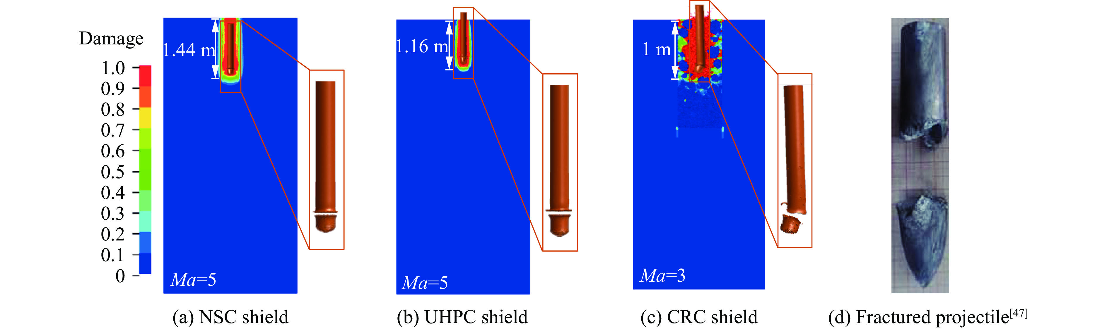 With the rapid development of hypervelocity weapons, analyzing the penetration effectiveness of hypervelocity weapon warheads on concrete shields is significant for the design of newly-built protective structures and the safety evaluation of as-built protective structures. Focusing on the penetration performance of AGM-183A hypervelocity weapon warhead against three typical shields: normal strength concrete (NSC), ultra-high performance concrete (UHPC), and corundum rubble concrete (CRC), firstly, the reliability of the numerical algorithms, mesh size, and material model parameters used in the finite element analysis method was fully validated by comparing the experimental and simulation results of three types of target subjected to penetration of steel/tungsten alloy projectiles. Subsequently, a numerical analysis method for the prototype scenario was established based on a mesh transition strategy equivalent to penetration depth and recovered projectile length. Finally, a series of simulations were conducted for the AGM-183A hypervelocity weapon warhead penetrating the aforementioned three shields at Ma ranging from 3 to 8. The results indicate that: (1) the AGM-183A hypervelocity weapon warhead reaches maximum penetration depth when NSC, UHPC, and CRC shields subjected to penetration at Ma=4, Ma=4, and Ma=3, respectively, with depths of 4.26, 3.74, and 1.00 m. Due to instability phenomena of projectiles, such as fractures at the junction between the head and body caused by local stress concentration, further increases in penetration velocity lead to a decrease in penetration effectiveness; (2) compared with the combined penetration and explosion damage depths of conventional sound speed penetrating warheads SDB, WDU-43/B, and BLU-109/B, the penetration depths induced by AGM-183A into NSC, UHPC, and CRC shields are 3.2, 1.6, and 1.8 times, 4.7, 2.1, and 2.2 times, and 3.4, 1.3, and 1.5 times higher, respectively; (3) the recommended design thicknesses of the three shields against the AGM-183A hypervelocity weapon warhead are 8.01, 7.03, and 1.88 m, respectively. The UHPC shield shows no significant improvement subjected to hypervelocity penetration compared with the NSC shield. Comparatively, the CRC shield is recommended for shield design, which can be effectively subjected to both conventional subsonic and hypervelocity impacts.