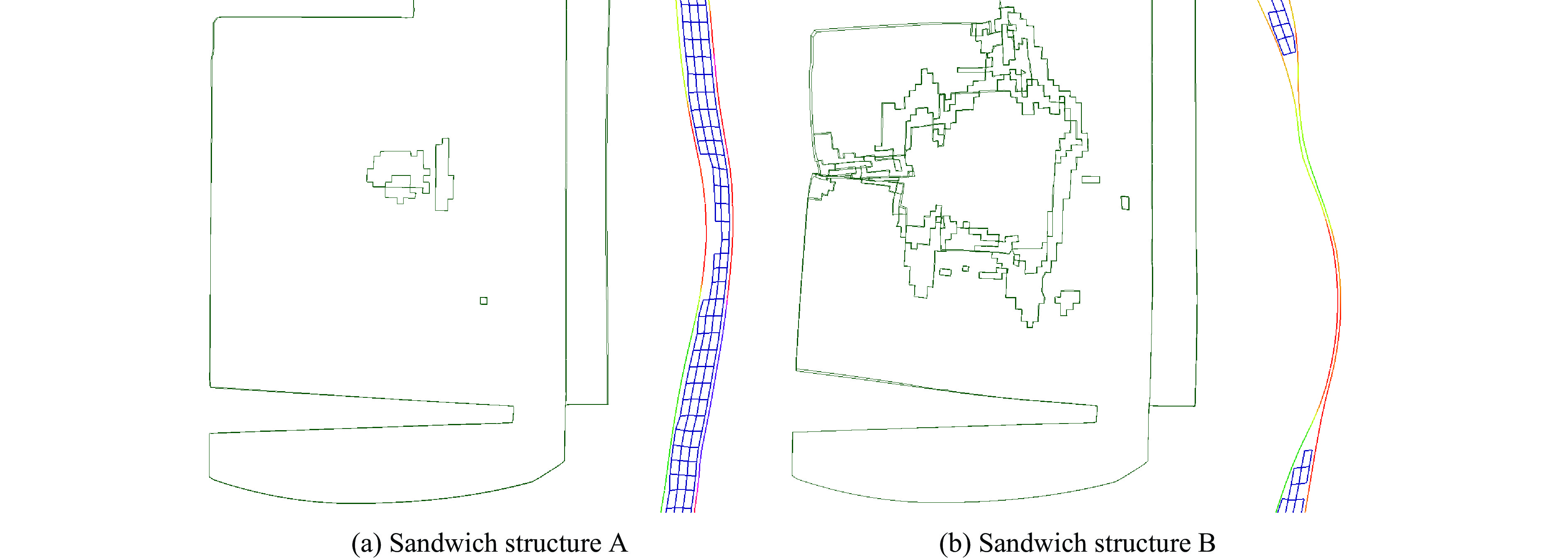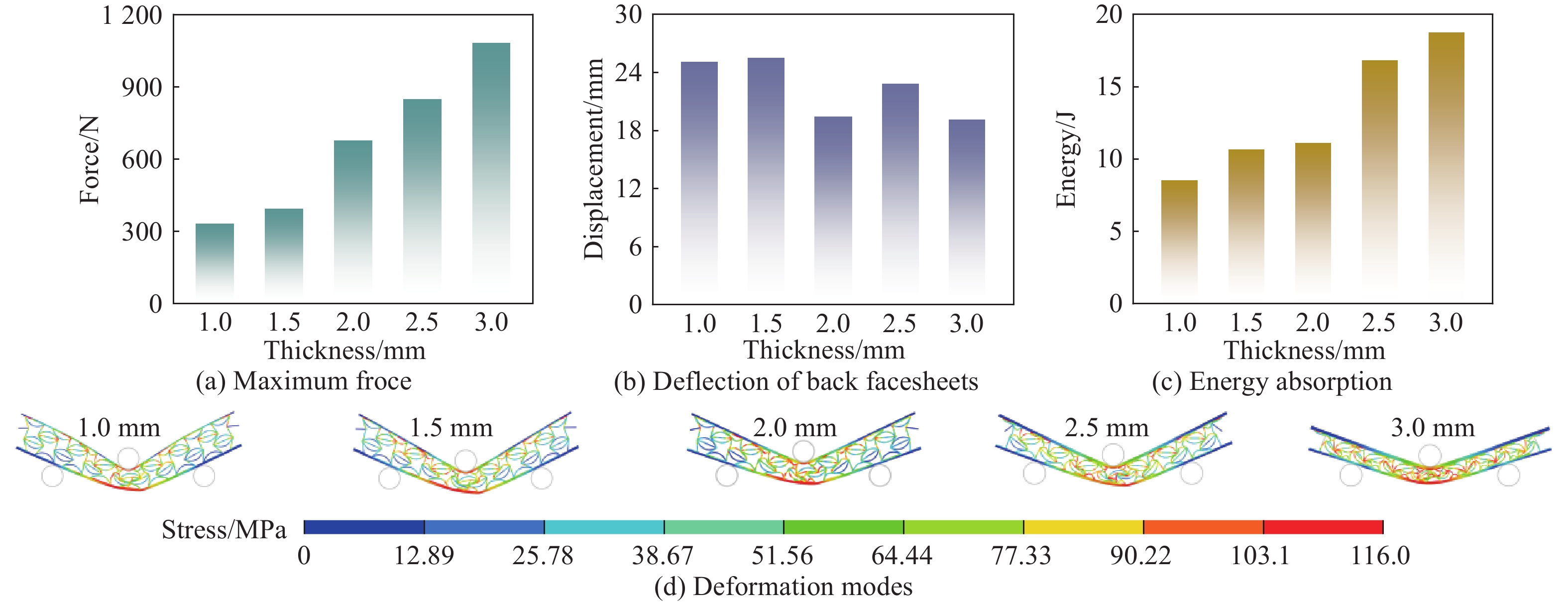 The catenary reinforced method can enhance the crashworthiness of re-entrant honeycomb (RH) by avoiding hollow structural characteristics, strengthening negative Poission’s ratio effect, and utilizing the high load-bearing effectiveness of catenary structures. Based on the above effects the sandwich beam with reinforced RH (RRH) was proposed. The metallic specimens from the proposed structure were fabricated for three-point bending tests. Results show that the introduced catenary structure can limit the rotation deformation of inclined cell walls around vertices, and the drop in load-bearing force after initial plastic deformation is reduced from 29.3% to 6.6%. Compared to classical RH cored beams, the maximum load-bearing force and energy absorption of RRH ones can be improved by 26.7% and 8.9%, respectively. A parametric analysis was conducted to reveal that the thicknesses of front facesheet, back facesheet, and core had a significant effect on deformation behavior and energy absorption of RRH cored sandwich beams. The thickness of front facesheets, cores, and back facesheets was employed as optimization variables, and the mass, maximum load-bearing force, and energy absorption were used as optimization objectives to perform the multi-objective optimization of RRH cored sandwich beams. The optimized sandwich beam exhibits increases of 64.9% in maximum load-bearing capacity and 46.9% in energy absorption. The impact resistance of conventional honeycomb sandwich beams under in-plane and out-of-plane loading was compared at identical wall thickness and mass, respectively. Analysis demonstrated the superior energy-absorbing protective performance of the proposed RRH sandwich beams. The research results can provide useful guidance for the reinforcement design of honeycomb cored sandwich beams.