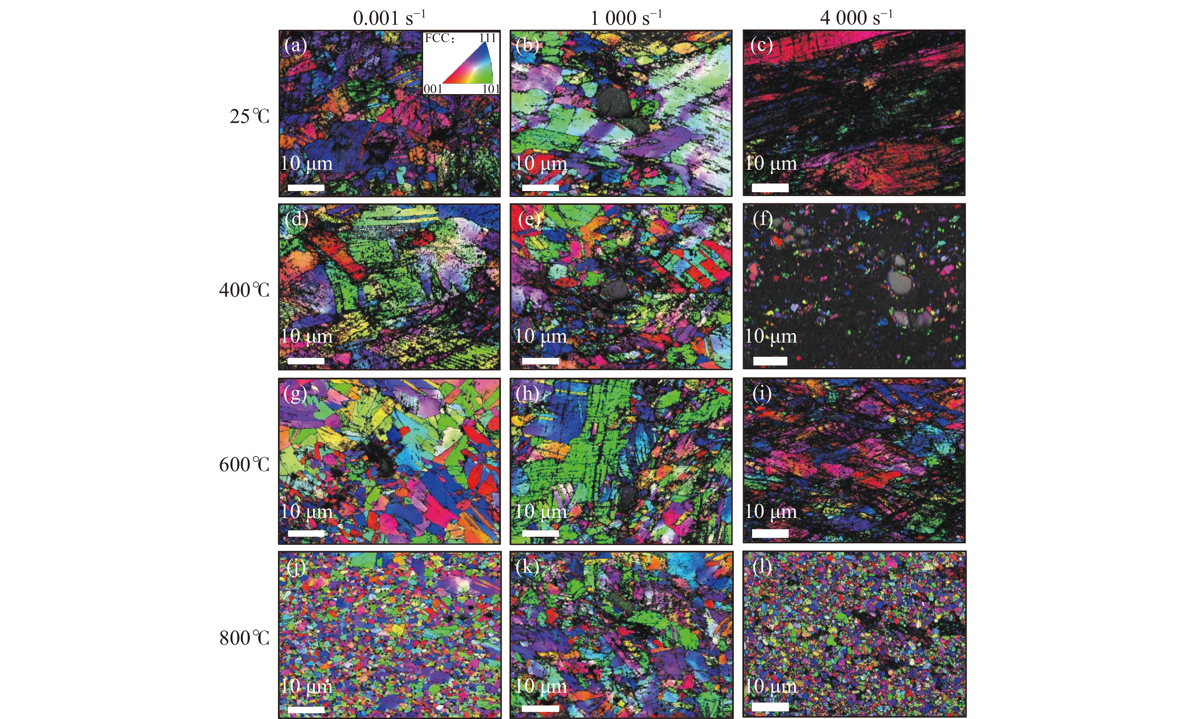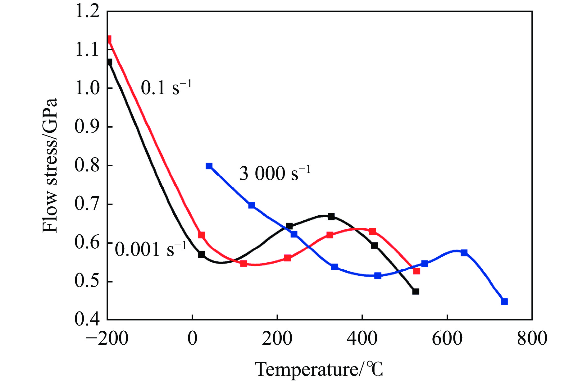 To further explore the influence of interstitial C atom on the strain rate effect and temperature effect of CoCrNi-based medium-entropy alloy, the compression mechanical behavior, microstructure evolution and deformation mechanism of CoCrNiSi0.3C0.048 medium-entropy alloy were systematically studied at a wide temperature and strain rate range. The investigated alloy is composed of face-centered cubic (FCC) matrix and three-level precipitate microstructure, i.e. the primary Cr23C6 carbides (2−10 μm), the secondary SiC precipitates (200−500 nm), and the tertiary SiC precipitates (~50 nm). The results show that the serrated flow phenomenon is observed on the true stress-strain curve of the alloy at 400 ℃, and the amplitude of the serrations decreases gradually with the increase of strain and ultimately vanishes. In addition, the abnormal stress peak (the 3rd-type strain aging phenomenon) appears on the curve of the quasi-static flow stress with temperature, but at high strain rate, the abnormal stress peak disappears. Through the analysis of the characterization of the deformed microstructure, it is speculated that the main reason for the phenomenon of 3rd-type strain aging under quasi-static conditions may be the existence of interstitial C atoms. During the process of continuous plastic deformation and development, a series of mixed structures similar to heterogeneous structures are generated, which are composed of dense dislocation cells, micro bands, stack faults, dislocation clusters and deformation twins. These mixed structures intensify the interaction between interstitial atoms and moving dislocation, and then pin the dislocation, which results in dynamic strain aging phenomenon occurs. The reason why the 3rd-type strain aging does not appear under dynamic conditions may be that the solute atoms move slower than the dislocation. The dislocation cannot be pinned in time. In addition, the precipitation of a large number of nanoscale SiC precipitates weakens the "pinning" effect of interstitial atoms under dynamic loading.