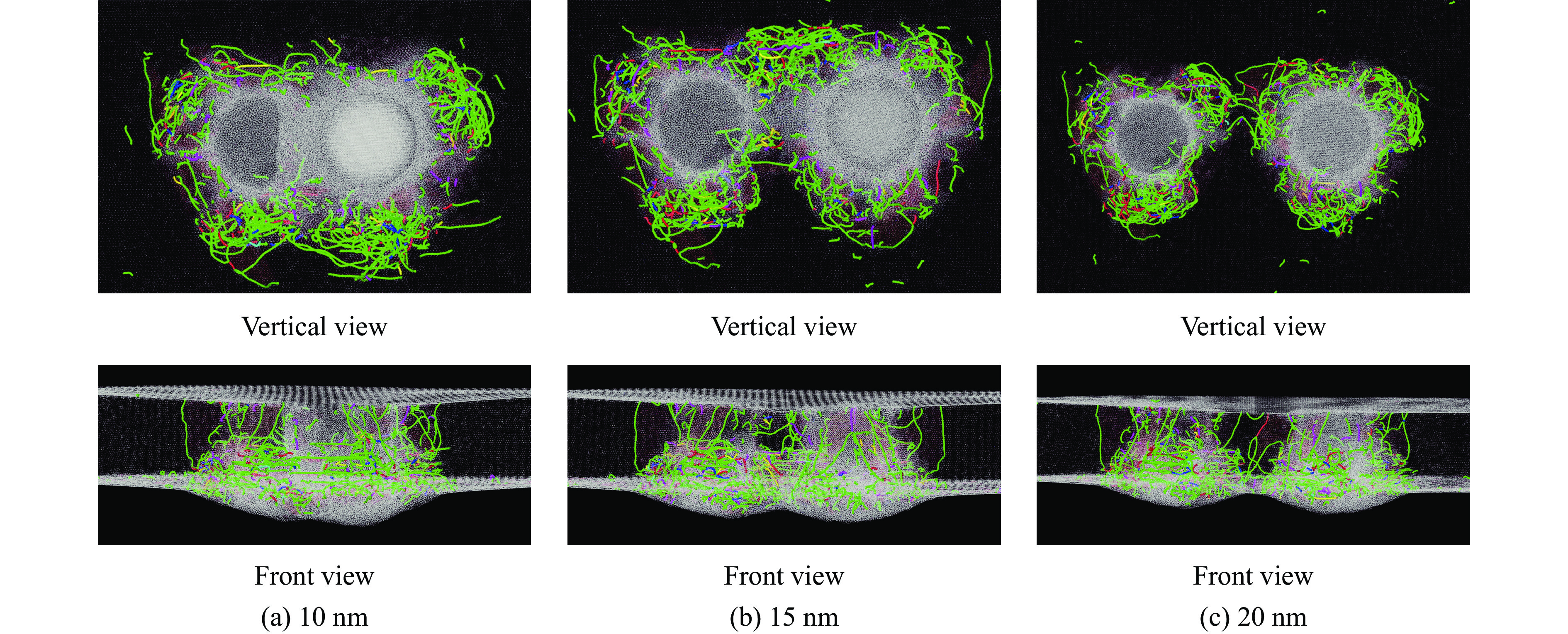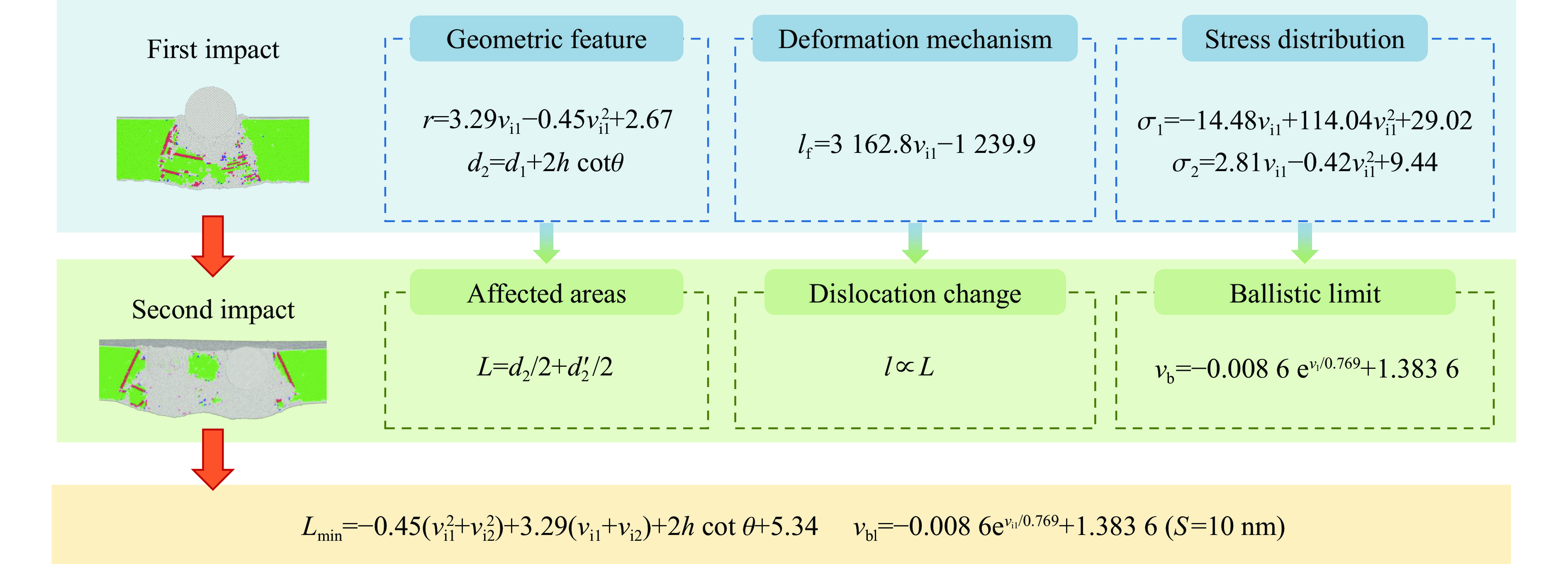 To investigate the evolution of phase structure, dislocation distribution, energy absorption capacity, and impact accumulation effect of high-entropy alloys (HEA) under shock loading, molecular dynamics simulations were employed to systematically analyze the dynamic response behavior of Al0.3CoCrFeNi HEA plate subjected to single and secondary impact load. The results show that under the first impact, the phase structure evolution and energy absorption mode of the plastic region of Al0.3CoCrFeNi HEA plate exhibits significant velocity dependence. As the velocity increases, the proportion of face-centered cubic structure shows a three-stage downward trend, while the disordered structure increases accordingly. Under low velocity impact (0.5-1.0 km/s), energy is mainly absorbed by dislocation network; at medium velocity impact (1.0-2.0 km/s), both dislocations and disordered atoms contribute; under high velocity impact (2.0-3.0 km/s), disordered atoms dominate energy absorption. Within the velocity range of 0.5-0.8 km/s of the rigid sphere, the dislocation line length increases linearly with the impact velocity. However, at higher impact velocities, the dislocation line length decreases due to the limitation of the plate thickness. The stress analysis shows that when the impact velocity increases, both the maximum stress and the boundary stress of the plastic zone exhibit nonlinear variations characterized by a quadratic relationship. Under the secondary impact, the Al0.3CoCrFeNi HEA plate forms a damage zone resembling a trapezoidal shape after impact. The radius of the pit within this damage zone exhibits a quadratic relationship with the impact velocity. Additionally, the minimum affected area resulting from the secondary impact also demonstrates a quadratic relationship with the impact velocity. Regarding impact resistance, as the initial impact velocity increases, the residual velocity following the secondary impact also rises, indicating a reduction in the resistance capability of HEA. At a distance of 10 nm from the impact center, the ballistic limit velocity decreases nonlinearly with increasing initial impact velocity. However, an increase in the secondary impact velocity mitigates the effects induced by the initial impact.
