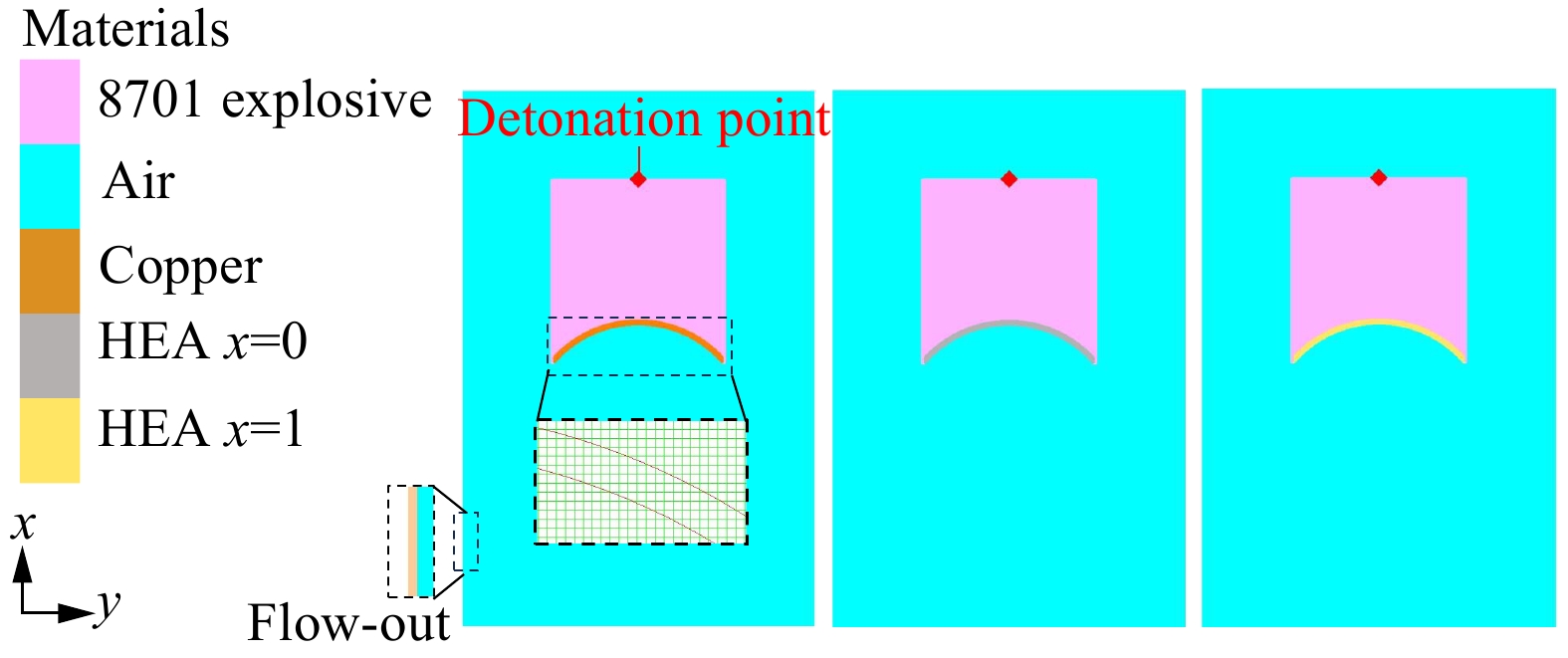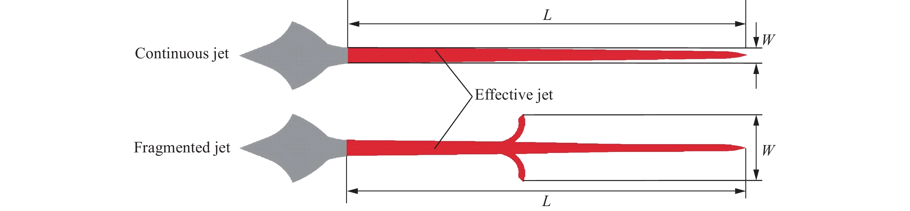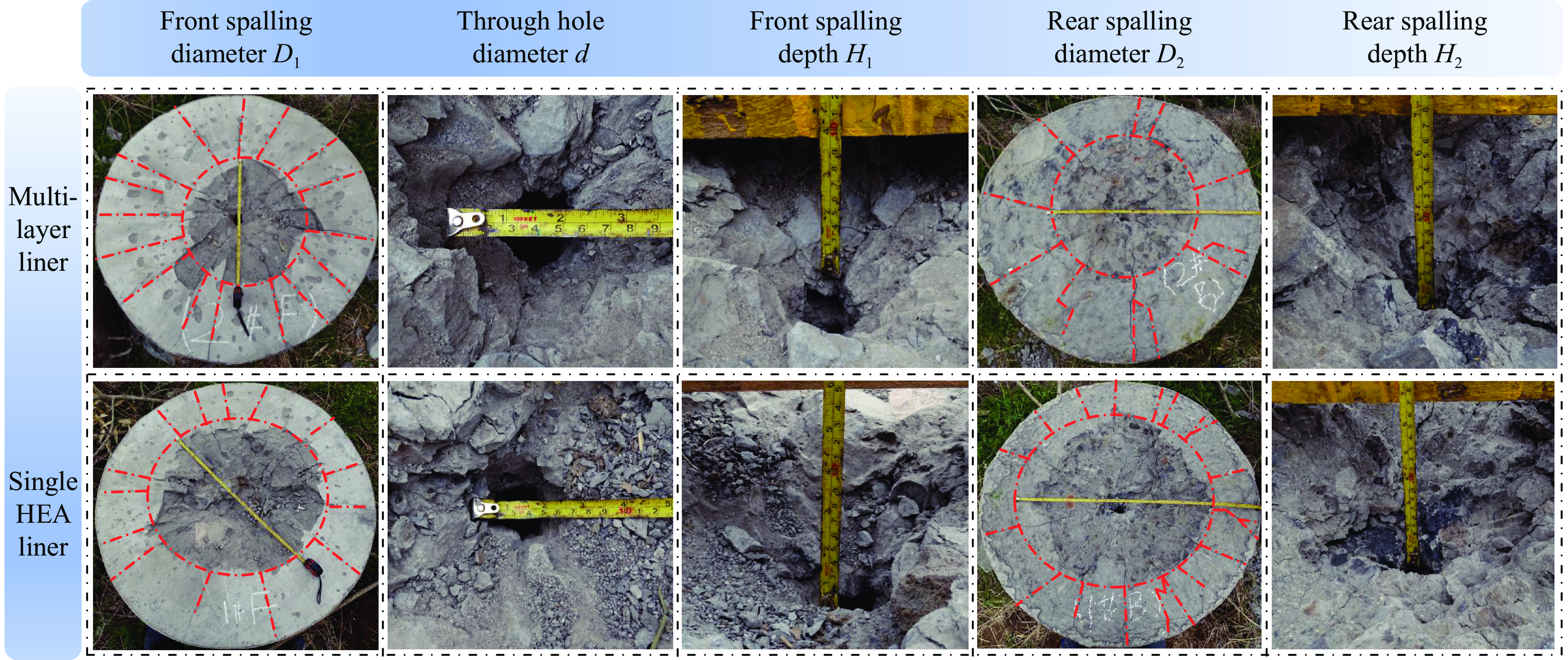 Aiming at the limitations of traditional metal jets in penetrating concrete targets, such as limited damage range and insufficient dynamic response, a novel double-layer energetic composite liner structure with a truncated inner layer made of high-entropy alloys/aluminum/polytetrafluoroethylene (HEA/Al/PTFE) was proposed for the first time. The hemispherical composite liner’s HEA layer was prepared using vacuum arc melting, while the Al/PTFE inner layer was formed through powder compaction and sintering. To thoroughly verify the performance advantages of the composite liner, two types of shaped charge structures were fabricated during the experimental phase for comparison: one with the composite liner and the other with a single-layer HEA liner. C35 plain concrete cylinders were used as targets, with single-point initiation at the center of the charge top. Additionally, numerical simulations of the jet formation process were conducted using the commercial finite element software ANSYS-LS-DYNA. The explosive and liner were modeled with the Smoothed Particle Hydrodynamics (SPH) algorithm to accurately capture the dispersal behavior during jet formation, while the casing was simulated with the Lagrangian algorithm to describe the expansion and fragmentation process of the outer shell. In the simulation, the high-temperature and high-strain-rate mechanical behaviors of HEA, Al/PTFE, and 45 steel were described using the Johnson-Cook constitutive model. The explosive was modeled with the classical JWL equation of state, and air was treated as an ideal gas. All relevant parameters were sourced from published literature. Based on the axisymmetric curvature characteristics of the hemispherical liner and the material discontinuity introduced by truncation, a partitioned formation theoretical model was further established. An energy loss coefficient η (η=0.2) was introduced to modify the detonation energy transfer process. According to the truncation angle, the composite liner was divided into two regions with different physical mechanisms. The jet radius and slug radius for each region were derived using mass and momentum conservation. Experimental results show that both the composite liner and the single-layer HEA liner can form stable penetrating jets, achieving complete penetration of the concrete targets. Compared to the single-layer HEA liner, the composite structure significantly enhances the fragmentation and crack propagation capabilities inside the concrete. Numerical simulation results indicate that the Al/PTFE inner layer exhibits a “coating and cohesive” effect on the HEA jet, effectively suppressing radial dispersion and improving the continuity of the mid-section of the jet. However, multiple collision-following-separation behaviors between the inner layer and the main jet delay the system from reaching dynamic equilibrium. The established partitioned formation theoretical model demonstrates good predictive accuracy, with relative errors of less than 15% between the predicted jet and slug radii and the numerical simulation results. Further parametric analysis reveals that the thickness and height of the inner layer significantly influence jet formation. The optimal parameter combination is a thickness of 3.5 mm and a height of 12 mm, which achieves the best balance between suppressing radial dispersion, maintaining jet length, and enhancing mid-section cohesion. This composite liner effectively integrates the excellent mechanical properties of HEA with the high energy release characteristics of Al/PTFE. The established partitioned formation theoretical model provides a reliable theoretical basis for the design of hemispherical composite liners. The research findings offer important theoretical and experimental support for the optimized design and engineering application of novel energetic composite liners.
