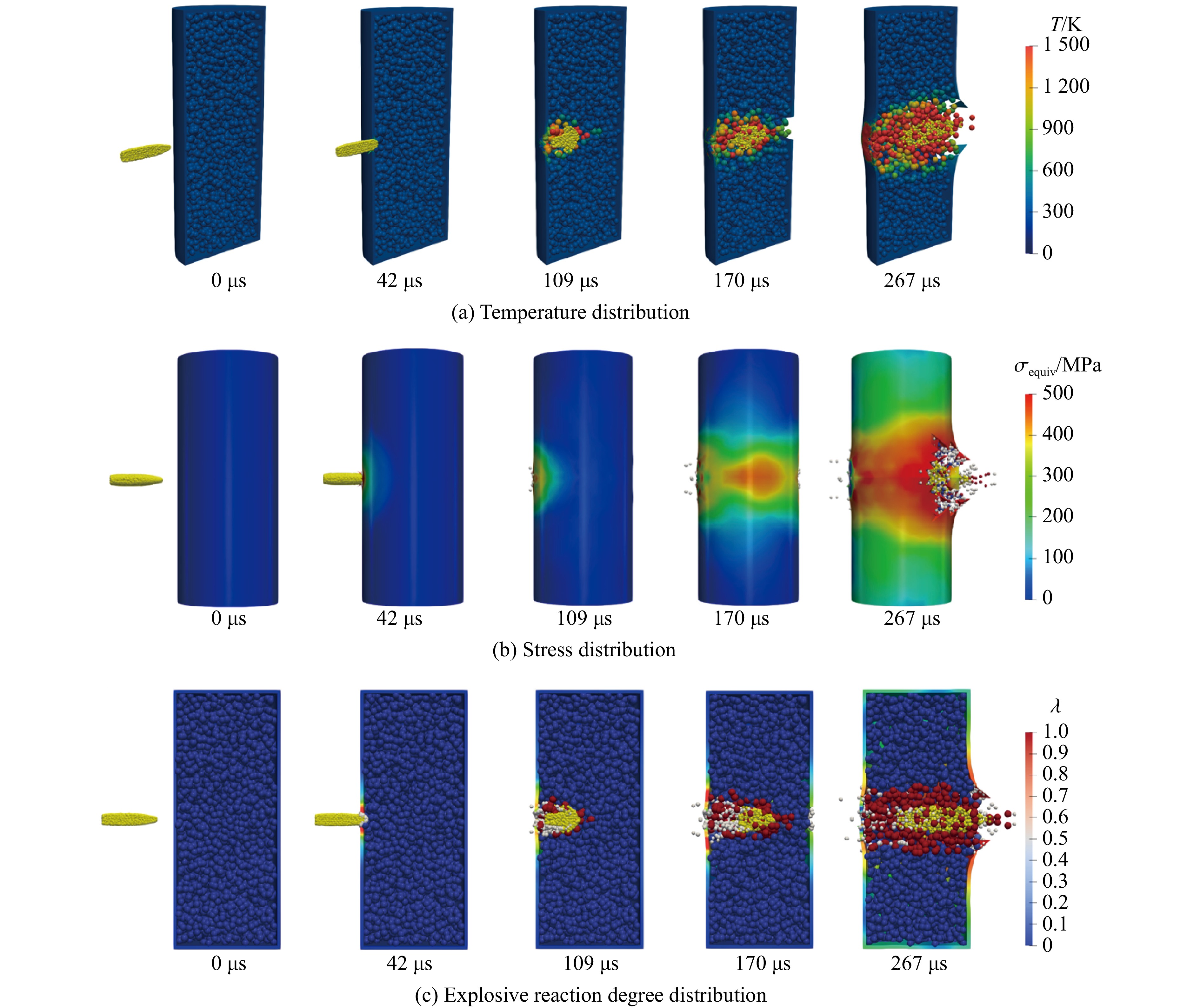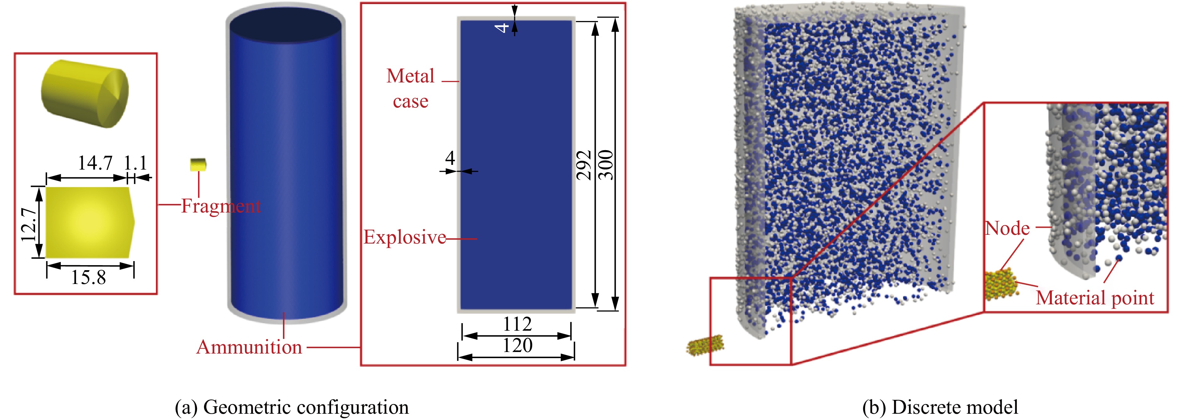 With the development of modern weapon systems, the requirements for the survivability of ammunition in various complex environments have been continuously increasing. During the processes of storage, flight, and combat, ammunition may be subjected to extreme impact loads such as high-speed impacts, shock waves, bullet and fragment impacts. The external impacts can induce plastic deformation and fracture of the ammunition casing, and even detonate the internal explosives. These responses involve complex phenomena including impact loading, thermo-mechanical coupling of materials, chemical reactions of explosives, and blast effects, representing a typical dynamic response problem of reactive materials under extreme thermo-mechanical coupling conditions. Accurately predicting the responses of ammunition under impact loading is critical for its design optimization and safety assessment. Based on the Hot Optimal Transportation Meshfree (HOTM) method, a meshfree numerical approach was proposed to accurately predict the ammunition responses under different impact loadings. Meanwhile, a thermo-mechanical-chemical coupling constitutive model of explosives was established, which took the effects of temperature and pressure on the explosive’s chemical reaction and detonation into account. The Arrhenius thermal-chemical reaction coupling model for explosive initiation and the Lee-Tarver three-term pressure ignition model induced by local high pressure were integrated to accurately simulate the different initiation mechanisms of explosives under varying impact velocities, thereby predict complex physical phenomena during the impact loading of ammunition. These phenomena include high-speed contact, large plastic deformation of the metal casing, material fracture, heat conduction, explosive initiation, and the expansion work performed by chemical reaction products. Taking the numerical simulations of two typical impact scenarios—bullet impact on ammunition at 850 m/s and fragment impact at