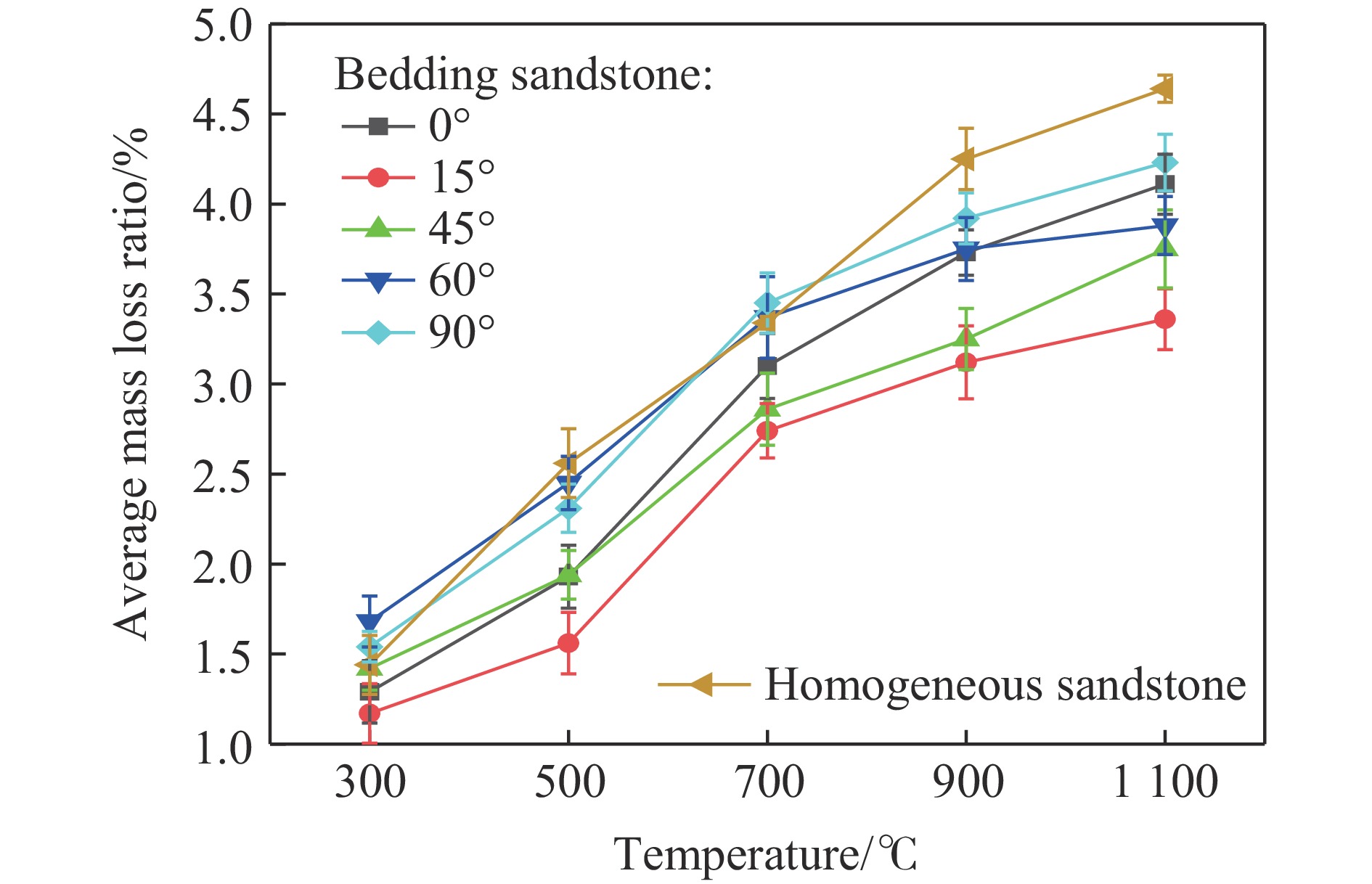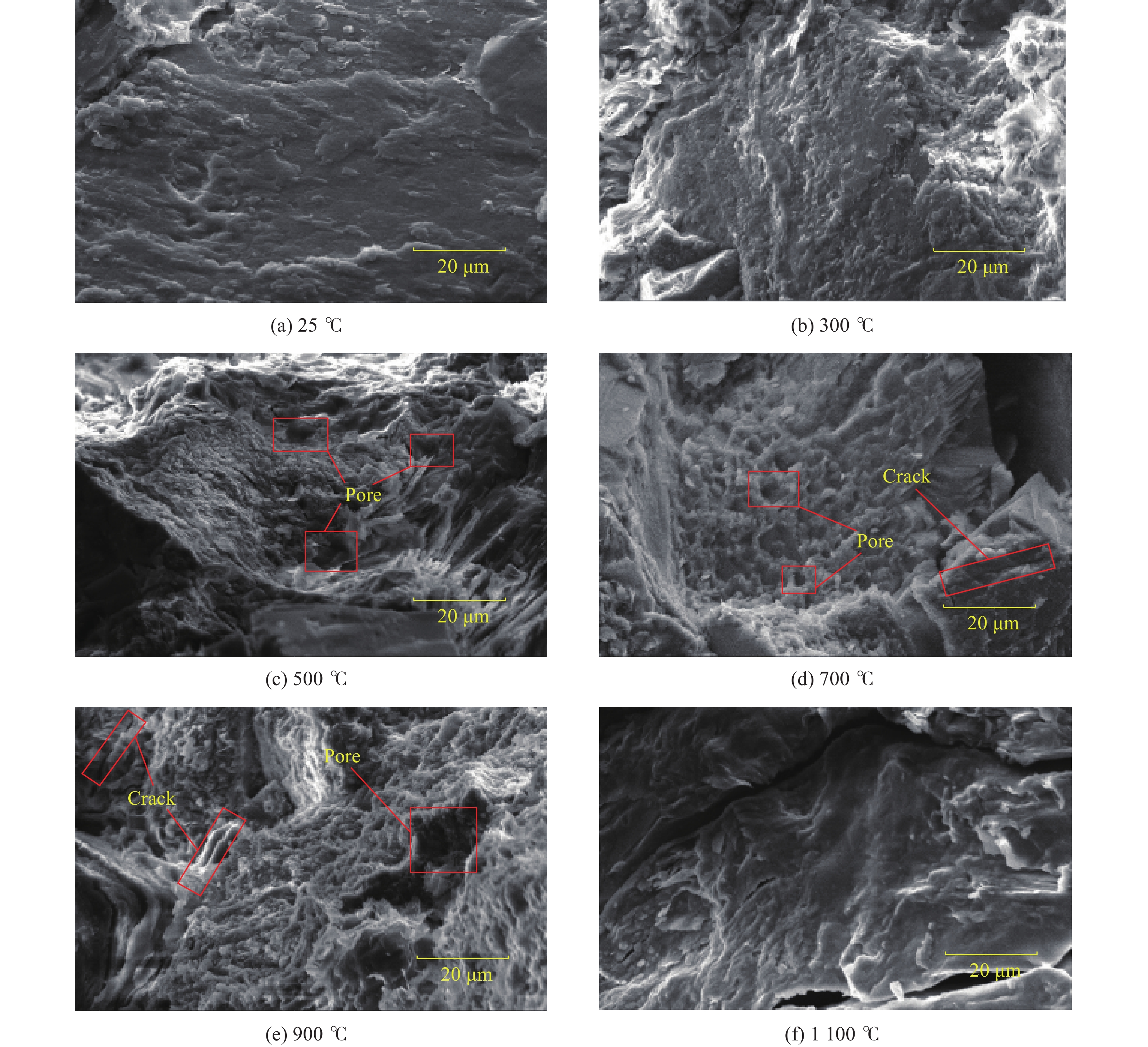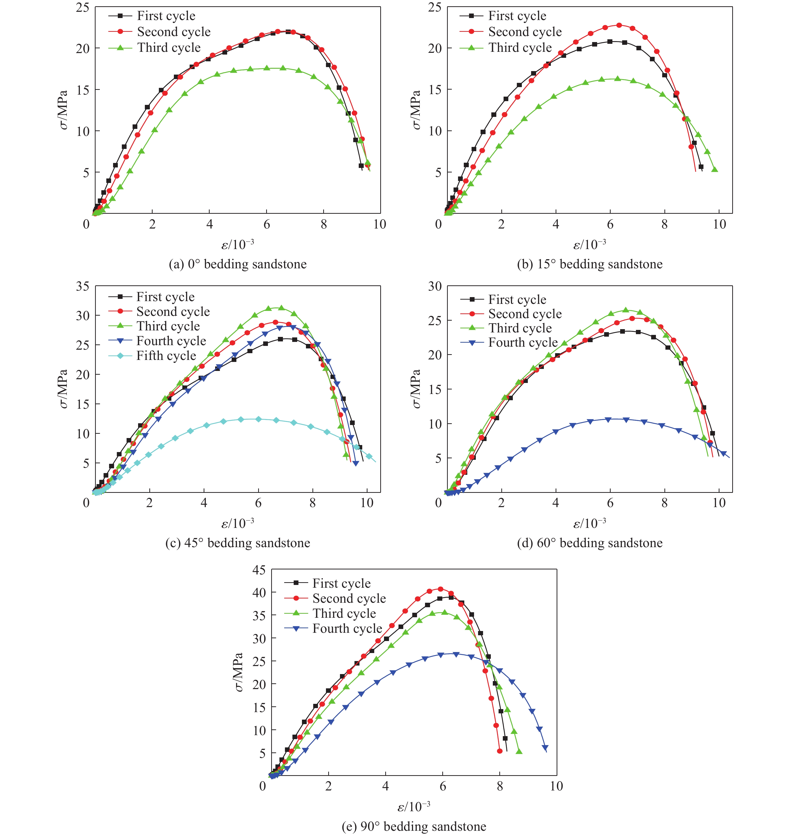 To investigate the dynamic characteristics and dynamic damage constitutive model of high-temperature bedding sandstone under cyclic impact, the physical properties of bedding sandstone after exposure to 300−1100 ℃ were first examined, and the influence of temperature on the color, mineral composition, mass and wave velocity of the specimens was recorded. Second, the dynamic characteristics of high-temperature bedding sandstone under cyclic impact were studied with a split Hopkinson pressure bar (SHPB) apparatus, and the dynamic responses of bedding sandstone at different strain rates and impact numbers were analyzed. Finally, on the basis of the visco-elastic damage element model for bedding rock, a dynamic constitutive model that accounts for high-temperature-impact-load coupling damage was established and verified against experimental data. The results show that the crystallization temperature of the dominant mineral quartz lies between 500 ℃ and 700 ℃; the higher the temperature, the darker the apparent color of the rock and the lower its mass. With increasing temperature, the wave velocity and peak stress first decrease and then increase. Temperature inflicts greater damage on 0° and 45° bedding sandstone, and the damage is most pronounced at 900 ℃. Under an impact voltage of 1300 V, the peak stress of bedding sandstone increases and then decreases with increasing impact number. Impact loading renders 0° bedding sandstone more susceptible to failure after high-temperature exposure, whereas 45° and 60° bedding sandstone exhibit strong impact resistance. The difference between the predicted and experimental curves is small, indicating that the model satisfactorily describes the cyclic-impact mechanical behavior of high-temperature bedding sandstone. The findings provide a valuable theoretical reference for the prevention and control of rock dynamic disasters in complex deep geothermal engineering environments.
