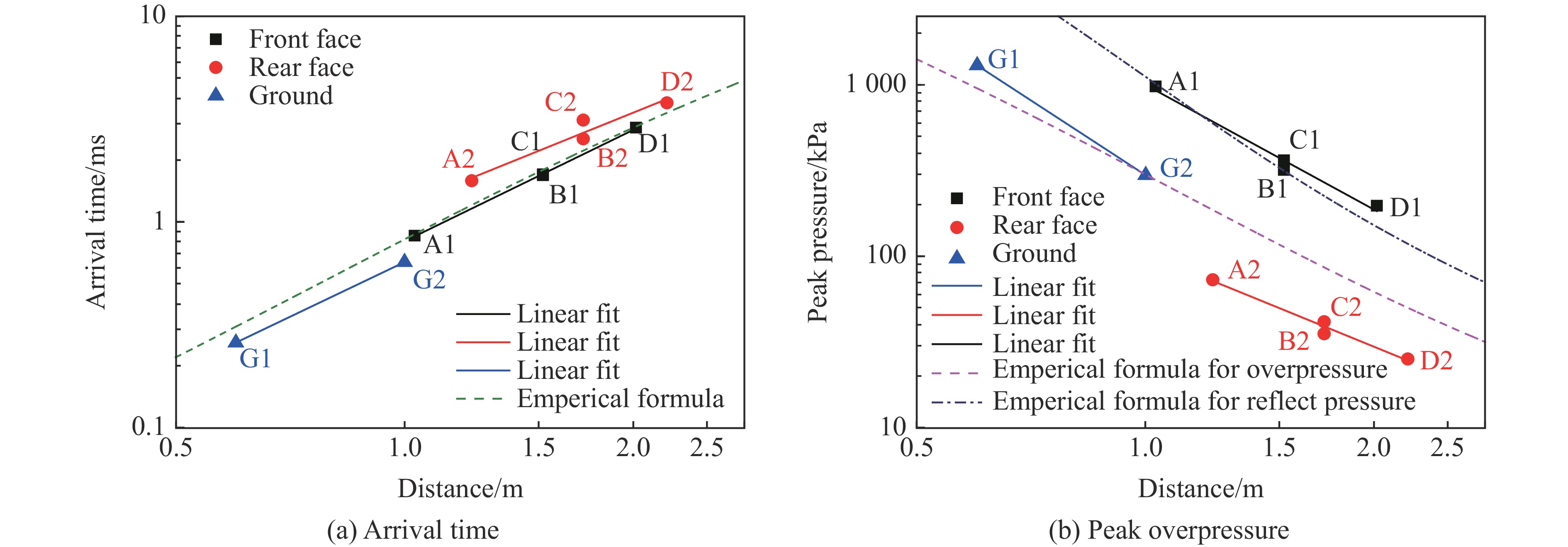 In order to study the distribution of blast wave load of building surface under surface burst, firstly, the fine scaled experiments under laboratory environment were conducted. The blast wave pressure-time curves on the surface of building model under the situation of surface burst of spherical charge as well as the distribution law of blast wave characteristic parameters were obtained. Subsequently, the numerical simulation method of blast wave propagation was developed and verified by the experimental data. Through simulation, the blast load distribution and time-histories of blast pressure on the rear face of building were analyzed. Finally, the theoretical method based on blast wave time-history analysis and superposition rule was proposed, and the quantitative analysis model of the blast load distribution on the rear face of building which was verified by numerical results was obtained. The results show that the maximum blast load on the front face of building located at the bottom of the building, which the overall distribution was relatively uniform. The blast load on the rear face of building was mainly concentrated on the two sides of the top angle and the central axis, which was formed by the superposition of the diffraction waves from top and side edges, and the maximum overpressure occurred at the intersection position of different diffraction shock waves, which is affected by the building size and explosion distance.