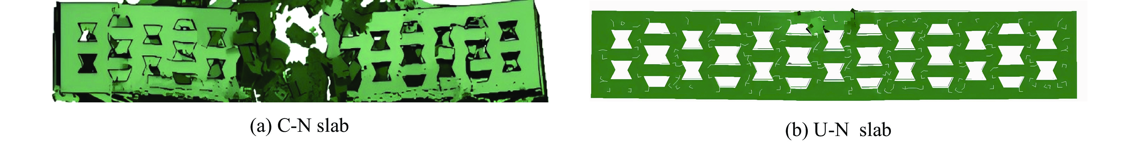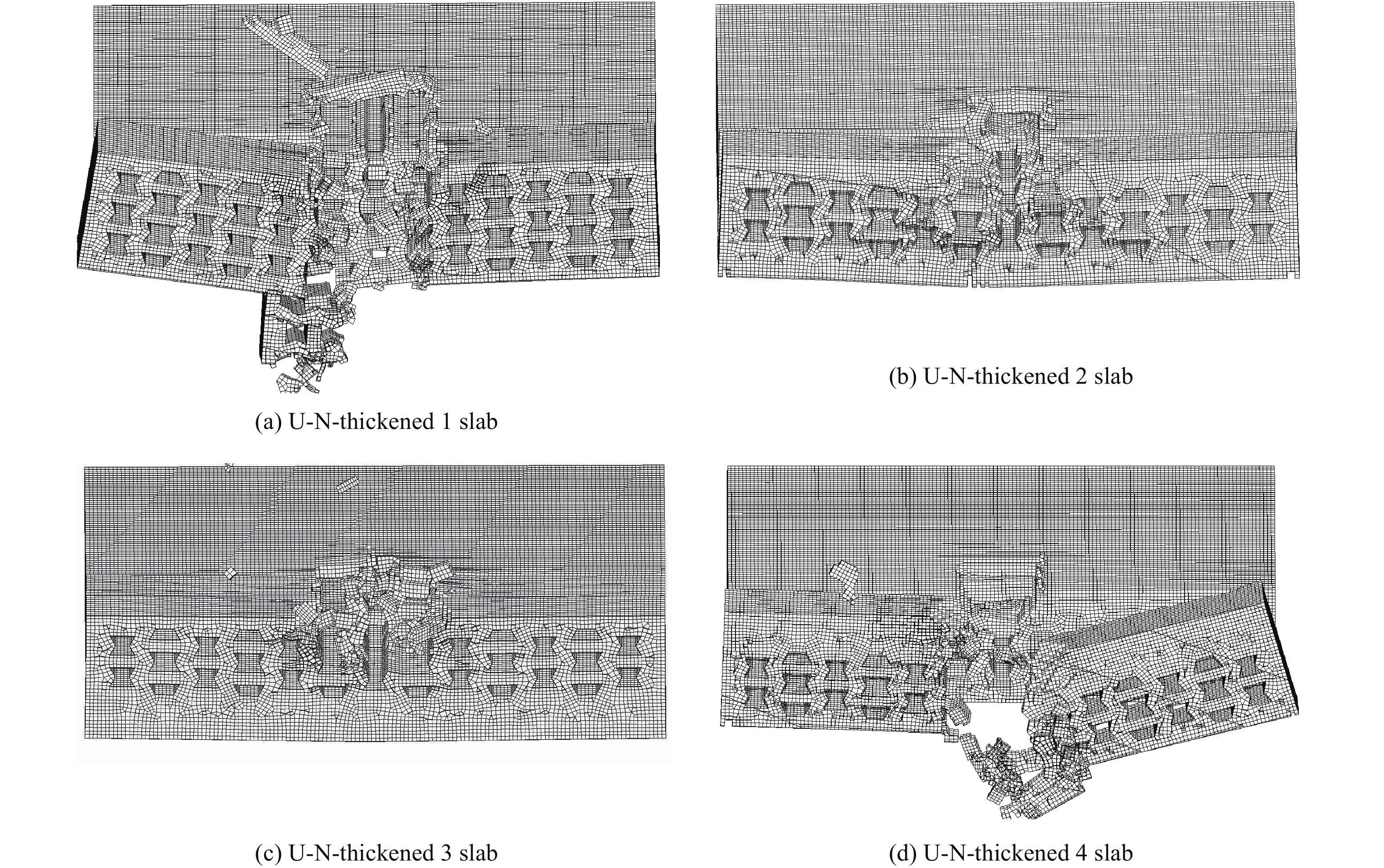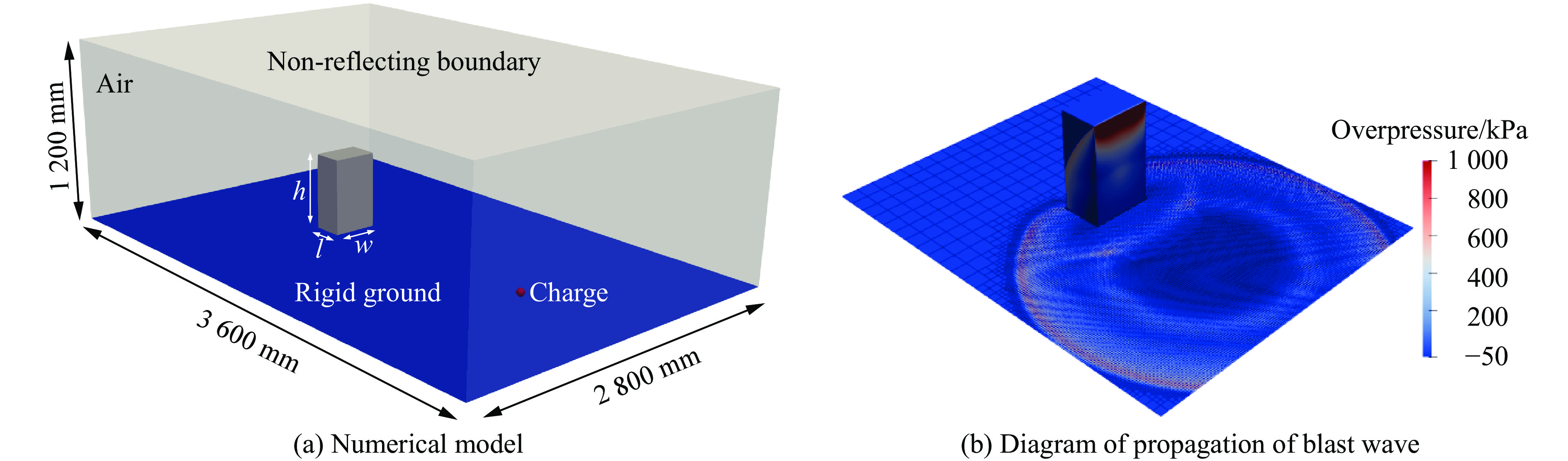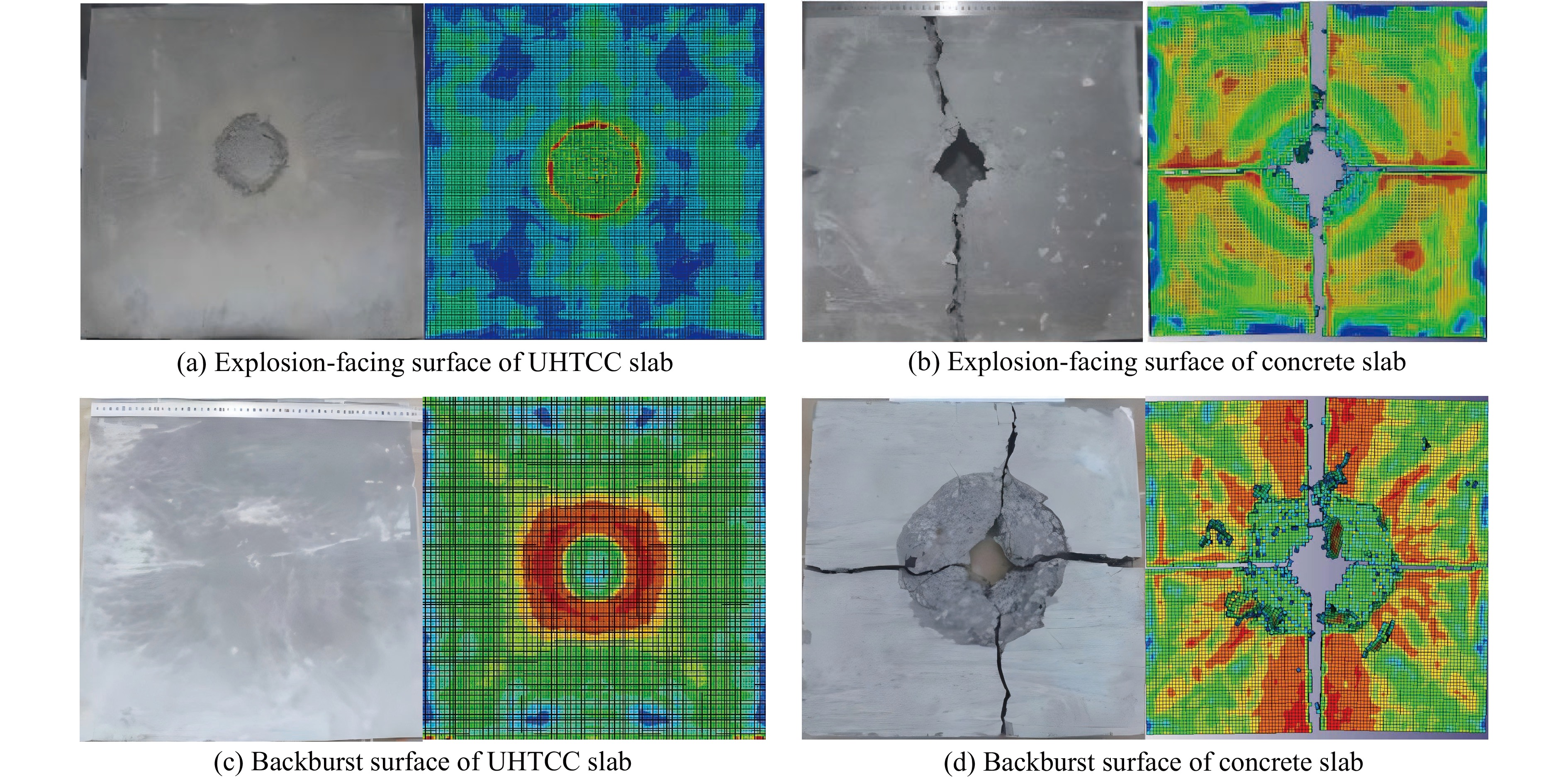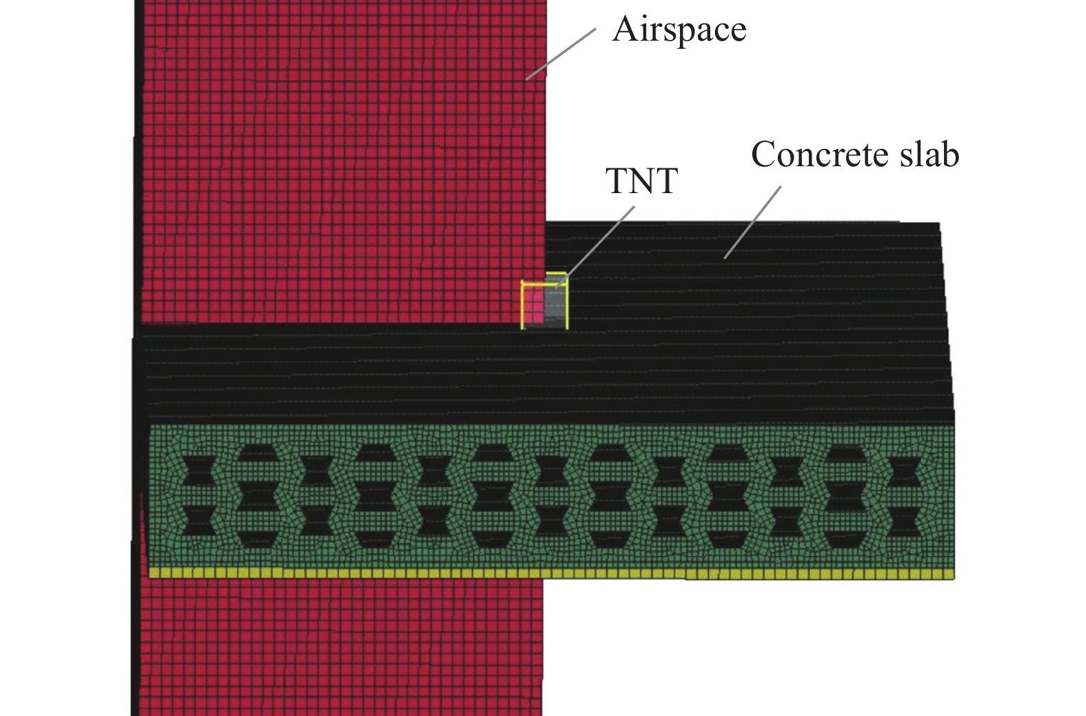 To improve the explosion resistance of the blast wall, it is proposed to combine the negative Poisson’s ratio structure with ultra-high toughness cementitious composites (UHTCC), Through a combination of the explosion experiment and numerical simulation, the anti-explosive property of negative Poisson’s ratio slabs has been studied, to prove the superiority of the anti-explosive properties of the negative Poisson’s ratio UHTCC slabs. Firstly, a negative Poisson’s ratio structural slab was constructed using concrete 3D printing technology and optimizing the printing path, which verified the constructability of the negative Poisson’s ratio structural slab, and the negative Poisson’s slab was subjected to a contact explosion test. Using LS-DYNA software, a finite element model of fluid-solid coupling was established according to the explosion test conditions, and the finite element model was verified by comparison of the slab damage pattern in the contact explosion test and the simulation. On this basis, the verified finite element model was used to simulate and analyze the effects of different materials (concrete and UHTCC), structures (negative Poisson's ratio structure, positive Poisson’s ratio structure, and solid structure), cell concave angles, and solid layer thickness ratios on the anti-explosive properties of negative Poisson’s structural slabs under contact explosion. By comparing the slab damage patterns and the ability of energy absorption, which was determined by the value of the air overpressure behind the slabs, the design of a negative Poisson’s ratio structure target plate with the best anti-explosive properties was obtained. The results show that: (1) due to the high toughness, the explosion resistance of UHTCC slabs is significantly better than that of concrete slabs. The UHTCC slabs all remained intact, and the concrete target slabs were all penetrated. (2) The negative Poisson’s ratio slab has the best ability to absorb energy among the three kinds of structures, while the solid slab is better at maintaining the structural integrity. (3) When the negative Poisson’s ratio of the cell concave angle is 61°, the structure has optimal explosion resistance, and both smaller and larger angles reduce the explosion resistance of the structure. (4) When the thickness of the negative Poisson’s ratio structure is too large as a proportion of the total thickness, the slab is severely damaged. Increasing the solid layer thickness of the backburst surface of the slab, or simultaneously increasing the solid layer thickness of the explosion-facing and backburst surfaces, is conducive to weakening the blast shock wave and improving structural integrity. This study confirmed the superiority of the explosion resistance of negative Poisson’s ratio UHTCC slab, and provides a theoretical basis for the design of blast walls based on negative Poisson’s ratio structure.