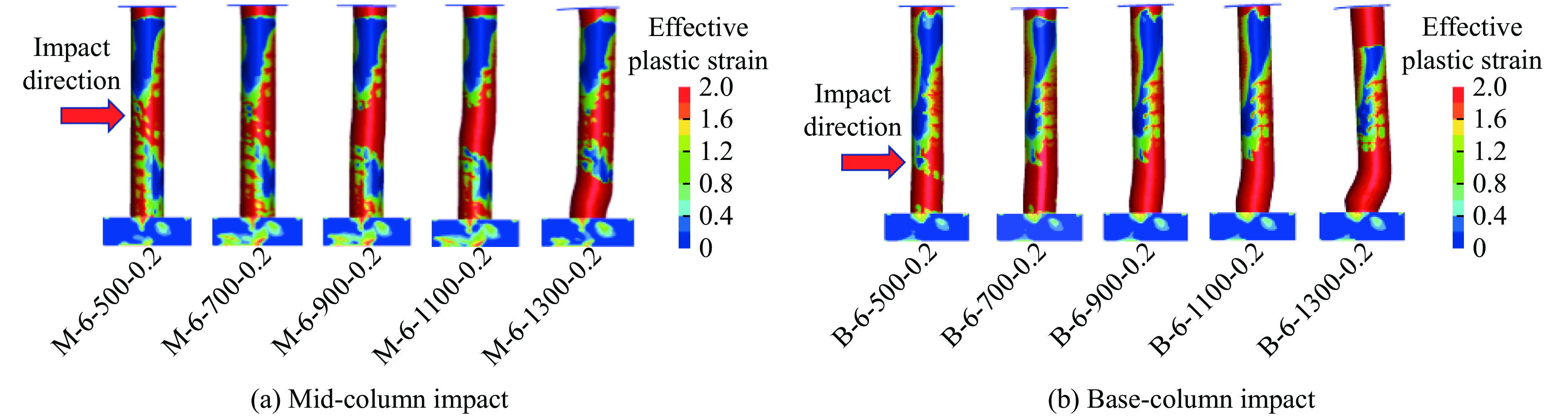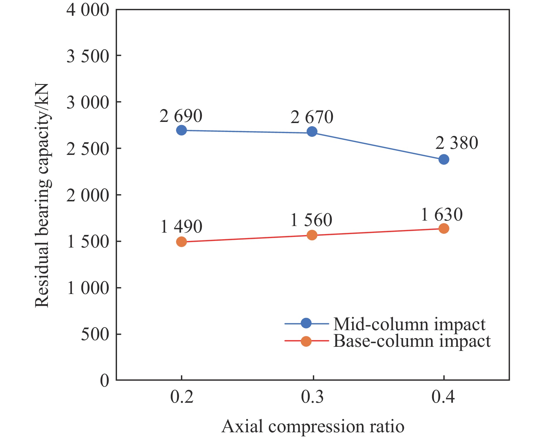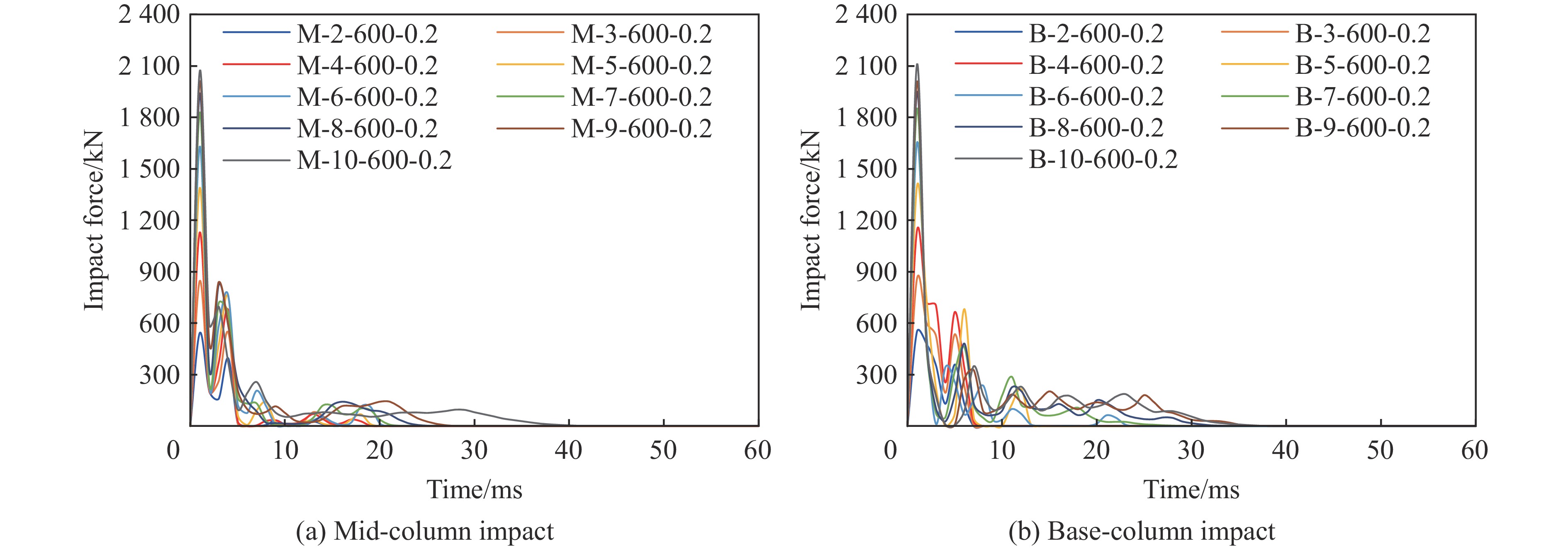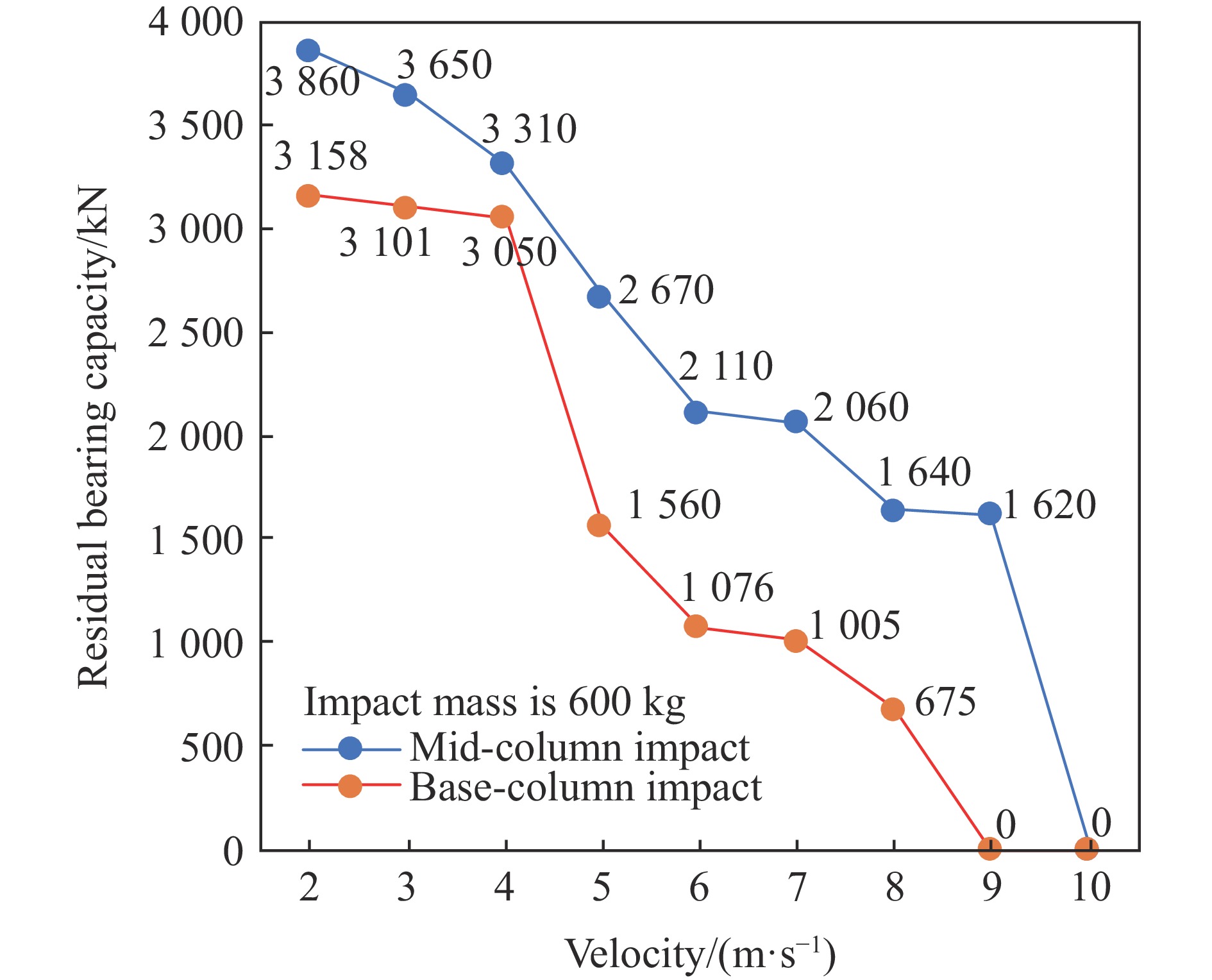 To investigate the dynamic response and damage assessment of reinforced concrete (RC) piers under lateral impact loads, high-fidelity finite element models of RC piers under lateral impact were developed using the explicit dynamic analysis software LS-DYNA. The finite element models were calibrated by using the test data from lateral impact tests of RC piers. The influences of impact velocity, impact mass, impact location, and axial compression ratio on the dynamic response and damage evolution of RC piers were investigated. Based on the residual load-carrying capacity and residual displacement, the indicators of relative residual deformation and relative residual load-carrying capacity were proposed. The corresponding values of relative residual load-carrying capacity for slight damage, moderate damage, severe damage, and collapse were determined. Moreover, a mapping relationship between relative residual deformation and relative residual load-carrying capacity of RC piers with various axial compression ratios and impacted at different impact locations was established. A damage assessment method for RC piers under impact load was proposed based on the mapping relationship. The research results indicate that RC piers subjected to impact at the mid-column position primarily exhibit flexural-shear failure, whereas local shear failure predominantly occurs when the impact is applied close to the column base. As the impact velocity and mass increase, the residual displacement increases significantly, while the residual bearing capacity decreases. The axial compression ratio within the range from 0.2 to 0.4 has a limited effect on the peak impact force and peak displacement but significantly affects the residual displacement when the impact occurs at the mid-column. When the mid-column position and the column base position are subjected to lateral impact, there exists an approximate linear relationship between relative residual deformation and relative residual load-carrying capacity, such that the greater the relative residual deformation, the smaller the relative residual load-carrying capacity. Under conditions of equal relative residual deformation, the relative residual load-carrying capacity of the base-column impact is lower than that of the mid-column impact, with a more significant decrease in load-carrying capacity.