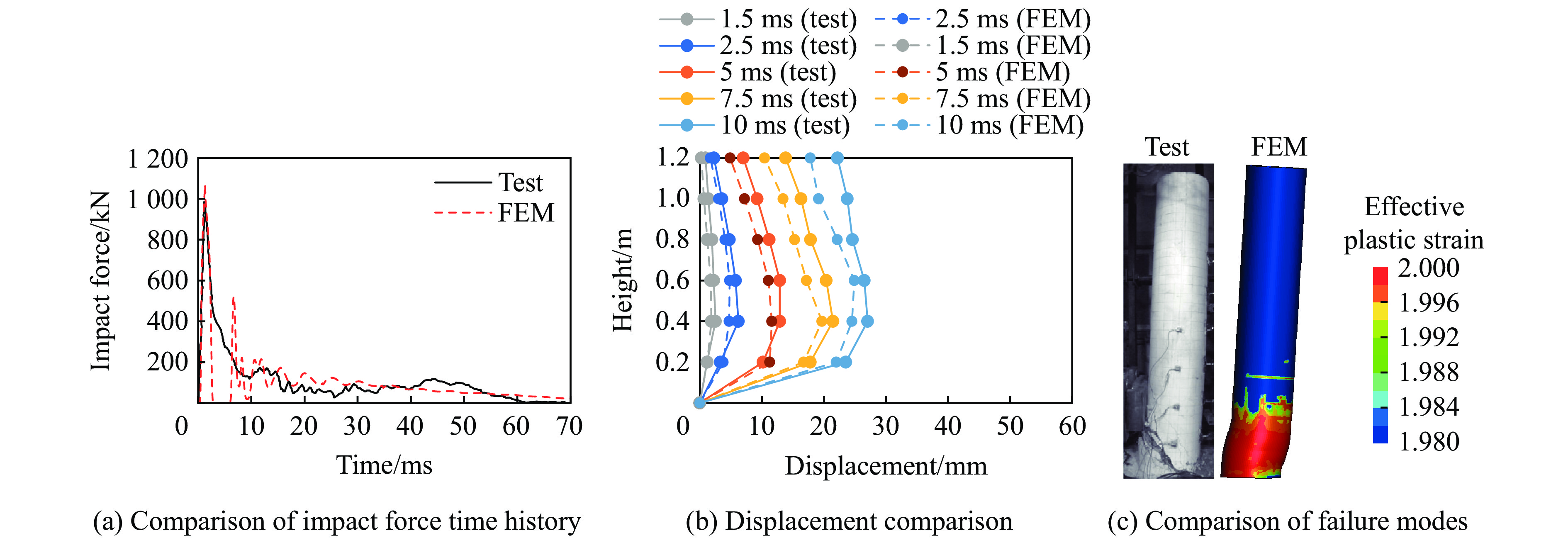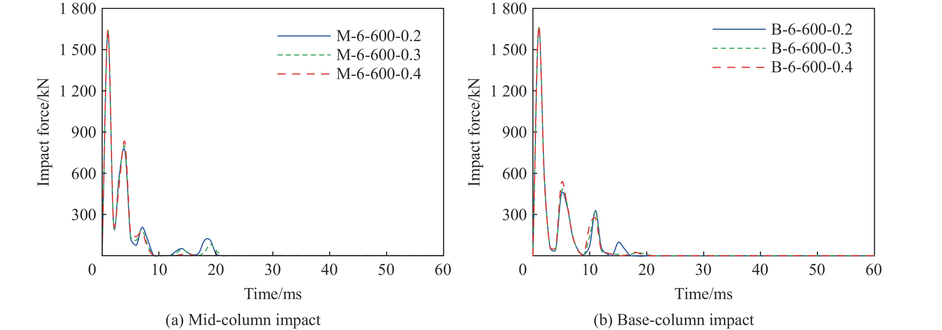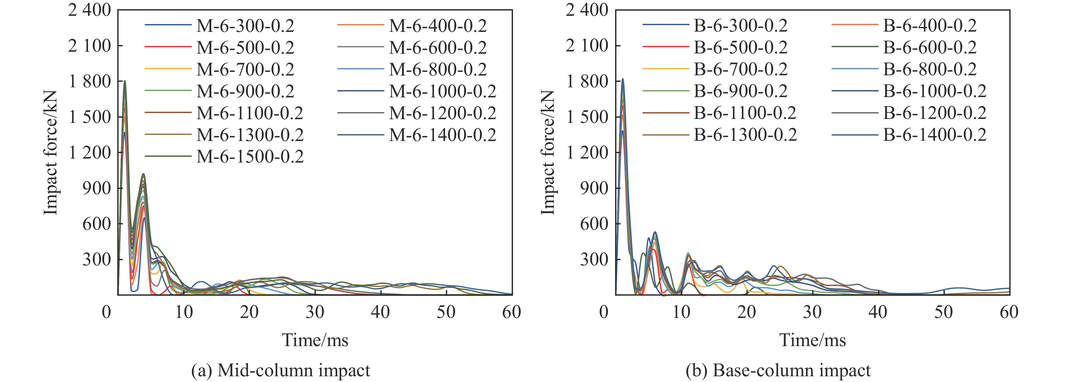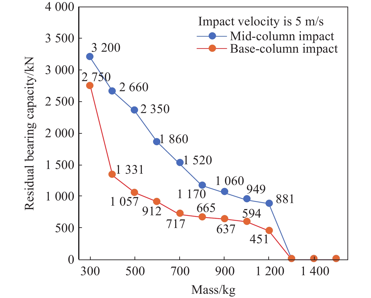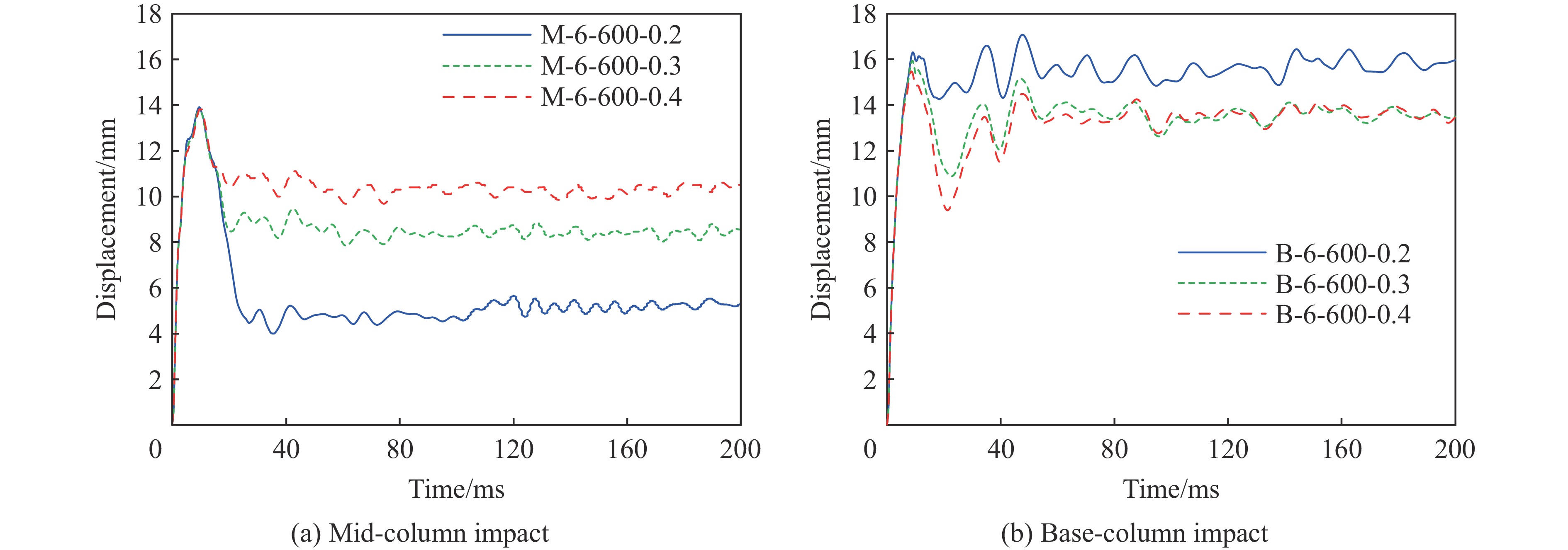 To investigate the dynamic response and damage assessment of reinforced concrete (RC) piers under lateral impact loads, high-fidelity finite element models of RC piers under lateral impact were developed using the explicit dynamic analysis software LS-DYNA. The finite element models were calibrated by using the test data from lateral impact tests of RC piers. The influences of impact velocity, impact mass, impact location, and axial compression ratio on the dynamic response and damage evolution of RC piers were investigated. Based on the residual load-carrying capacity and residual displacement, the indicators of relative residual deformation and relative residual load-carrying capacity were proposed. The corresponding values of relative residual load-carrying capacity for slight damage, moderate damage, severe damage, and collapse were determined. Moreover, a mapping relationship between relative residual deformation and relative residual load-carrying capacity of RC piers with various axial compression ratios and impacted at different impact locations was established. A damage assessment method for RC piers under impact load was proposed based on the mapping relationship. The research results indicate that RC piers subjected to impact at the mid-column position primarily exhibit flexural-shear failure, whereas local shear failure predominantly occurs when the impact is applied close to the column base. As the impact velocity and mass increase, the residual displacement increases significantly, while the residual bearing capacity decreases. The axial compression ratio within the range from 0.2 to 0.4 has a limited effect on the peak impact force and peak displacement but significantly affects the residual displacement when the impact occurs at the mid-column. When the mid-column position and the column base position are subjected to lateral impact, there exists an approximate linear relationship between relative residual deformation and relative residual load-carrying capacity, such that the greater the relative residual deformation, the smaller the relative residual load-carrying capacity. Under conditions of equal relative residual deformation, the relative residual load-carrying capacity of the base-column impact is lower than that of the mid-column impact, with a more significant decrease in load-carrying capacity.