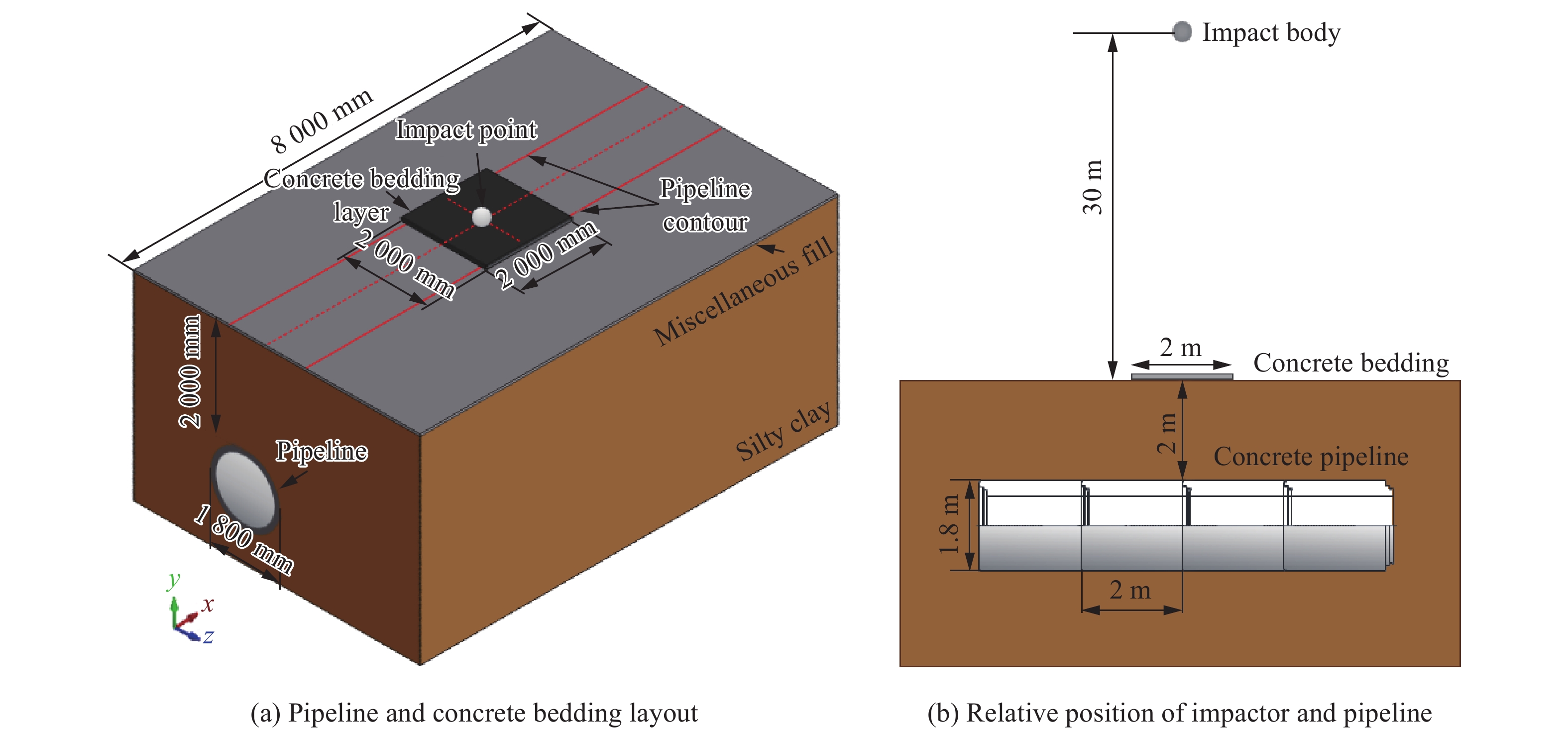 To investigate the protective effect of ground concrete cushion layers on buried pipelines used for water transmission, field rockfall impact tests were conducted by pre-burying multi-section bell-and-spigot concrete pipelines and casting in-situ concrete cushions on the ground. Combined with the DH8302 dynamic strain testing system, the spatial distribution characteristics of dynamic strain in the pipeline body and the variation law of earth pressure at the bell-and-spigot joints were analyzed. The LS-DYNA numerical simulation software was used to establish a detailed model of the rockfall impact test, and the reliability of the numerical model was verified by comparing simulation results with test results. By increasing the impact energy of rockfalls, the failure characteristics of buried bell-and-spigot concrete pipelines were studied. The influence mechanism of concrete cushion parameters (thickness and strength) on the protective effect was further analyzed by varying these parameters. The results show that under the condition of a burial depth of 2 m, unstable crack propagation in the pipeline body is more likely to cause leakage of bell-and-spigot concrete pipelines under rockfall impact. The peak tensile strain in the pipeline body decreases nonlinearly with the increase of cushion thickness and strength. The cushion thickness must exceed a critical value (15 cm) to significantly dissipate energy, and there is an optimal strength range (C30−C35). Excessive strength enhancement will reduce protective efficiency. Cushion thickness accounts for 74% of the protective effect contribution, indicating that the design principle of “geometry prior to material” should be followed. It is recommended to use a concrete cushion with a strength of C30−C35 and a thickness large than 0.2 m, which can significantly reduce the risk of pipeline impact damage and provide a quantitative design basis for pipeline protection in mountainous areas.