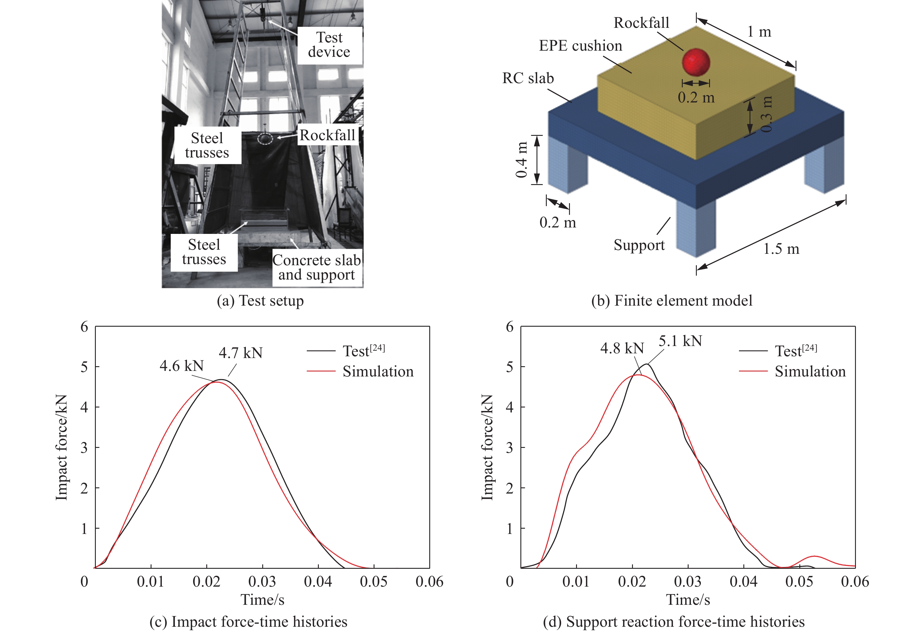 Reinforced concrete (RC) shed tunnel serves as an effective in-situ solution for rockfall protection along mountainous highways and railways. Using the commercial software LS-DYNA, refined numerical simulations were conducted to investigate the damage and failure assessment of a prototype framed T-beam type RC shed tunnel under rockfall impact. The simulations considered scenarios both with and without cushions, including 600 mm and