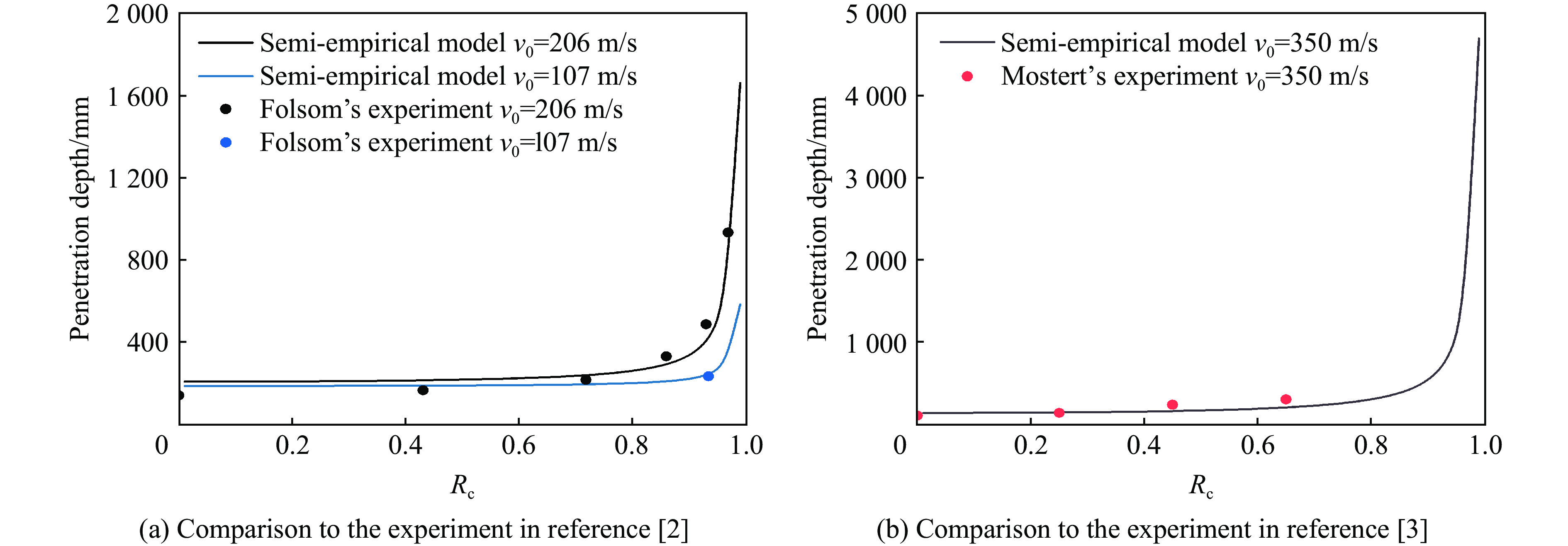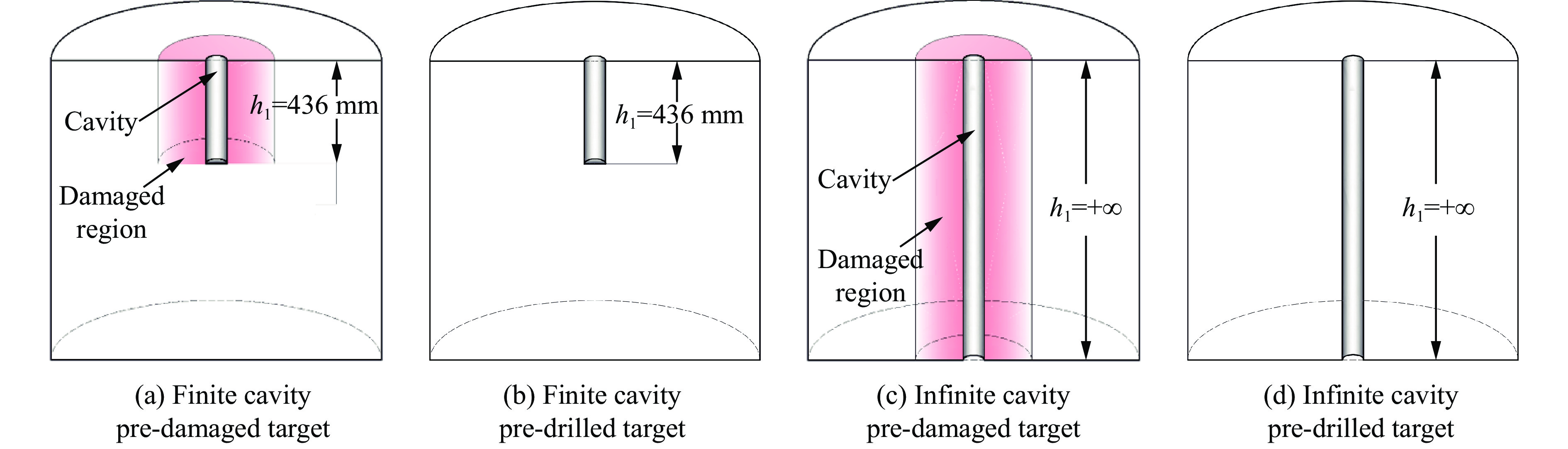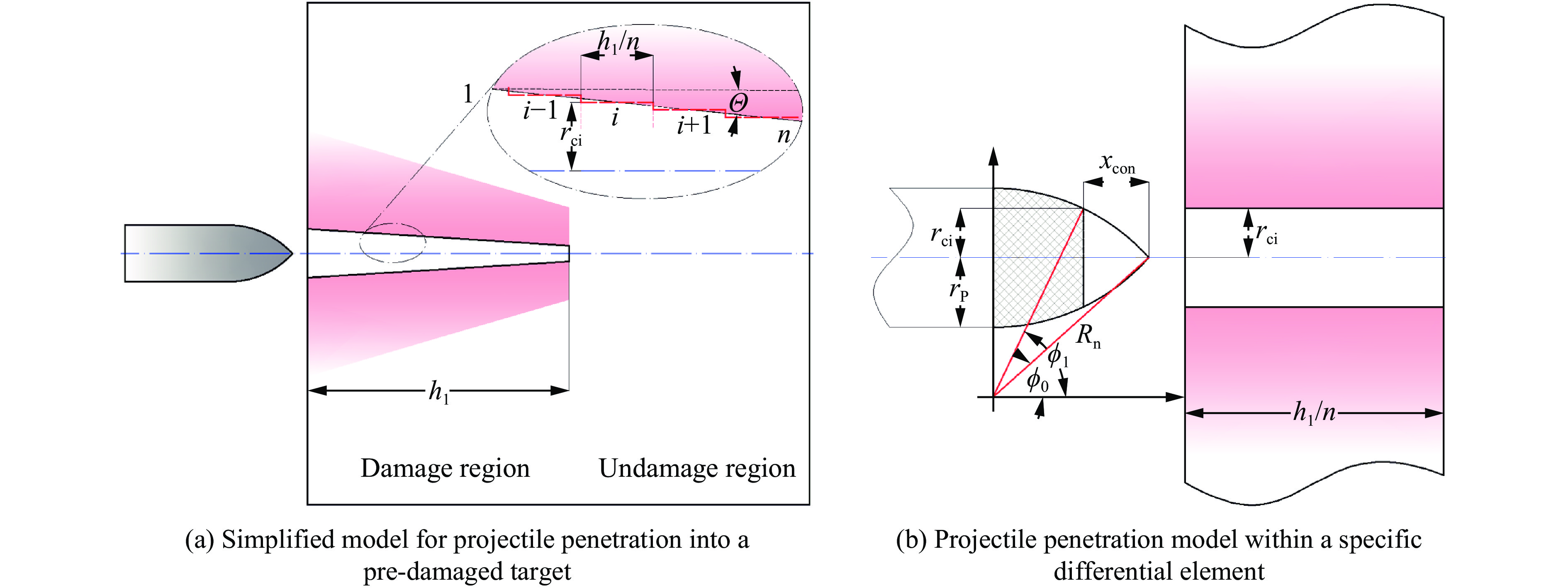 To investigate the impact of target damage on projectile penetration performance, a series of penetration experiments was conducted on a concrete target utilizing a former jet and a subsequent kinetic energy projectile. The critical factors influencing the performance of pre-damaged concrete penetrated by the projectile were analyzed. The relationship for the strength of the concrete materials in the pre-damaged concrete target was determined. Based on this, a semi-empirical model of projectile penetration of pre-damaged concrete was established by combining the aforementioned cavity expansion theory with the results of the preceding analysis. The impact of projectile and target parameters on the performance of secondary penetration of the projectile was then analyzed. The findings indicate that the influence of pre-damaged concrete on the depth of projectile penetration is contingent upon the discrepancy in crater volume and concrete damage. It can be posited that the damage to the target is the predominant influencing factor. When there is a finite-length damage zone within the concrete target and the diameter of the cavity of the target is between 0.3 and 0.5 times the diameter of the projectile, the effect is even less pronounced. When a finite-length damage zone exists within the target, the pre-damage cavity is 0.3–0.5 times the projectile diameter. In this instance, the gain in depth of penetration is most pronounced. In the event of penetrating damage to the target, a ratio of 0.3 between the diameter of the target tunnel and that of the projectile is observed. The difference in penetration depth between the pre-damaged target and the pre-drilled target is greater, with a gradual increase in this difference as the ratio increases further. When the damage state of the target is certain, decreasing the projectile diameter or increasing the CRH of the ogive-nosed projectile is more advantageous to increase the penetration depth.