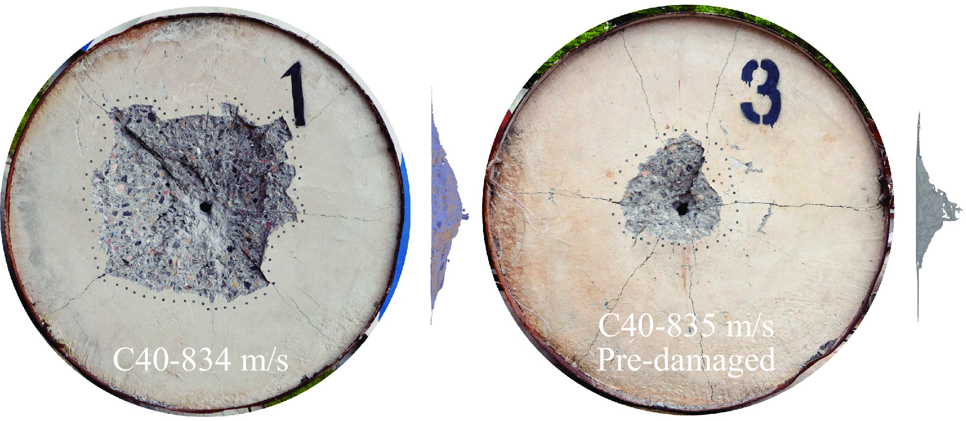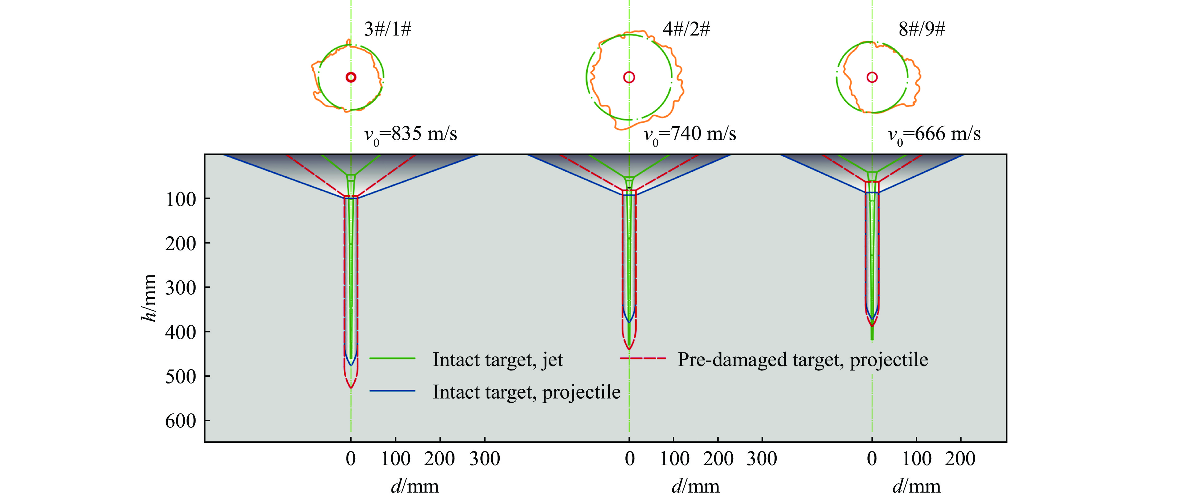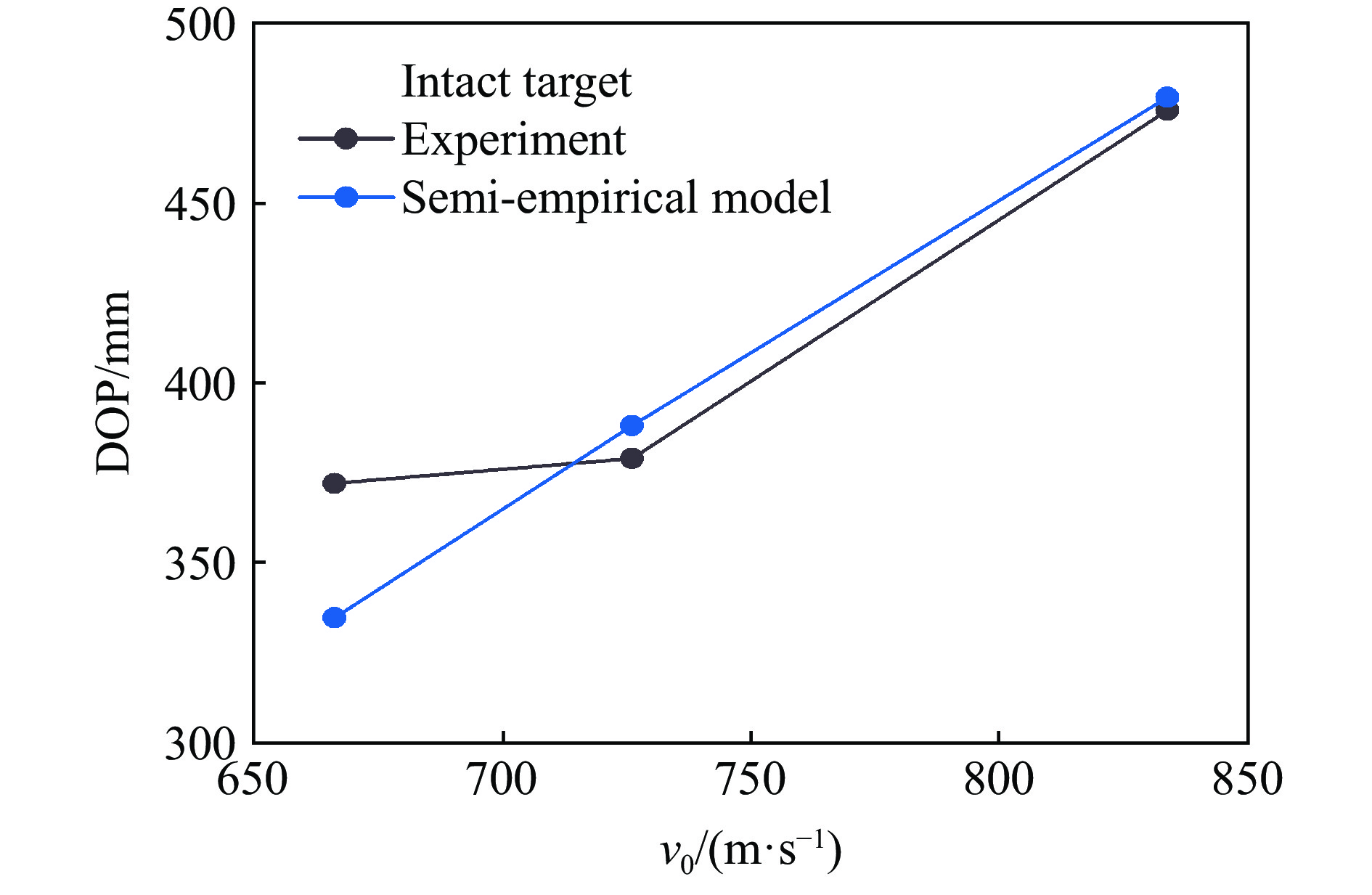 To investigate the impact of target damage on projectile penetration performance, a series of penetration experiments was conducted on a concrete target utilizing a former jet and a subsequent kinetic energy projectile. The critical factors influencing the performance of pre-damaged concrete penetrated by the projectile were analyzed. The relationship for the strength of the concrete materials in the pre-damaged concrete target was determined. Based on this, a semi-empirical model of projectile penetration of pre-damaged concrete was established by combining the aforementioned cavity expansion theory with the results of the preceding analysis. The impact of projectile and target parameters on the performance of secondary penetration of the projectile was then analyzed. The findings indicate that the influence of pre-damaged concrete on the depth of projectile penetration is contingent upon the discrepancy in crater volume and concrete damage. It can be posited that the damage to the target is the predominant influencing factor. When there is a finite-length damage zone within the concrete target and the diameter of the cavity of the target is between 0.3 and 0.5 times the diameter of the projectile, the effect is even less pronounced. When a finite-length damage zone exists within the target, the pre-damage cavity is 0.3–0.5 times the projectile diameter. In this instance, the gain in depth of penetration is most pronounced. In the event of penetrating damage to the target, a ratio of 0.3 between the diameter of the target tunnel and that of the projectile is observed. The difference in penetration depth between the pre-damaged target and the pre-drilled target is greater, with a gradual increase in this difference as the ratio increases further. When the damage state of the target is certain, decreasing the projectile diameter or increasing the CRH of the ogive-nosed projectile is more advantageous to increase the penetration depth.