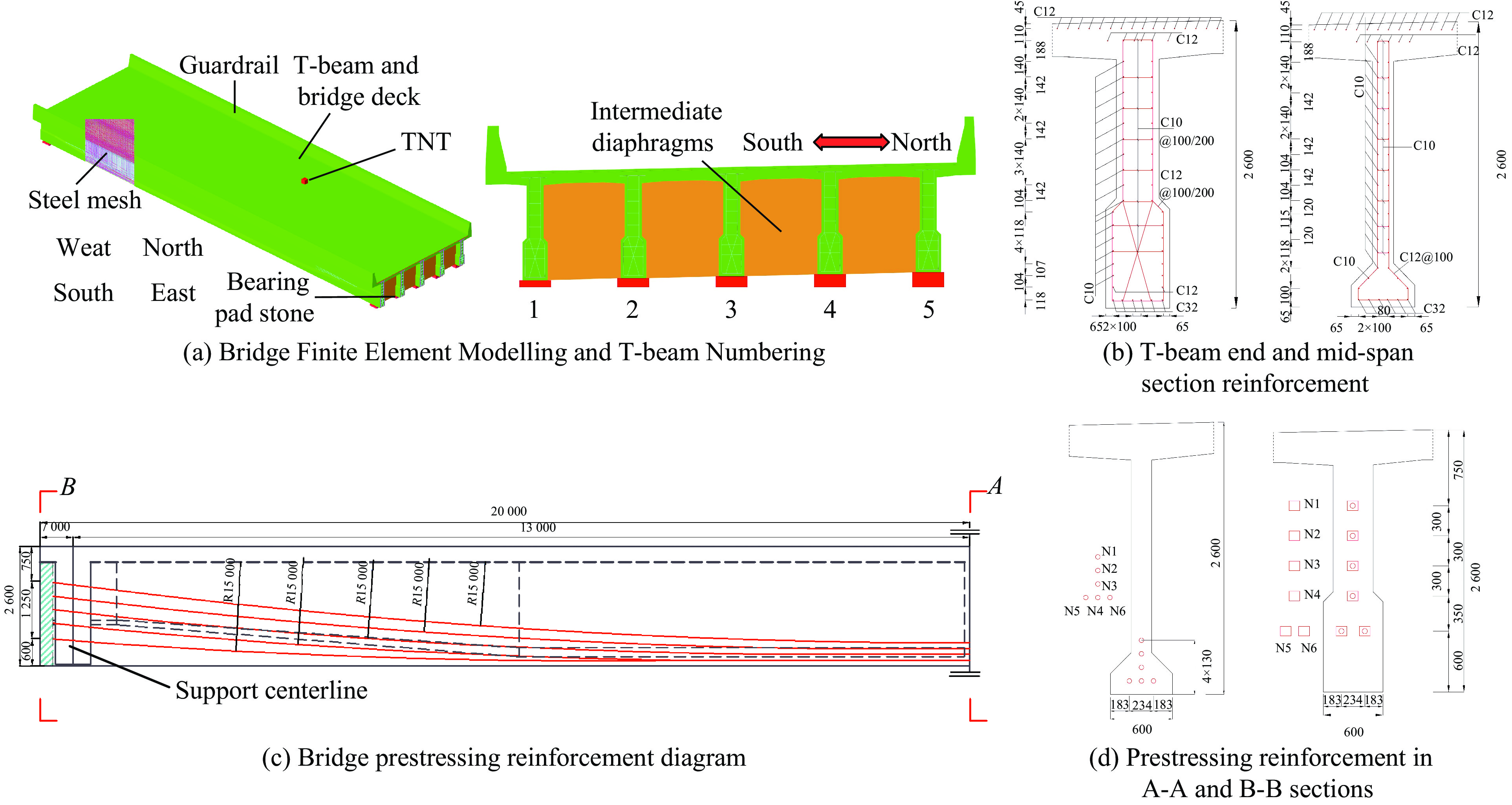 Prestressed reinforced concrete (RC) T-beam bridges are commonly employed in highway bridges construction. After explosive attacks, the deck damage mostly exists in the form of breaches and affects its traffic capacity. While significant attention has been devoted to evaluating post-blast residual capacity of RC beam bridge piers and girders in existing blast damage assessment studies, there remains a critical gap in methodologies enabling intuitive and rapid damage assessment method for bridge serviceability. Therefore, the rapid assessment of bridge deck damage is investigated in this study by combining numerical simulation with multivariate nonlinear regression analysis, in which the breach size of the prestressed RC T-beam bridge deck subjected to explosive loading is taken as the damage index. Through comparative analysis of the transverse size of the deck breach under blast loading, it was revealed that concrete strength exhibits relatively minor influence, whereas parameters including explosion location, deck thickness, diaphragm spacing, TNT equivalent, and scaled distance demonstrate more pronounced effects. Owing to the pronounced reinforcing and constraining effects of webs and diaphragms on the bridge deck, comparative analyses under identical conditions demonstrate that transverse size of the breach caused by explosion above deck areas between webs and diaphragms is significantly smaller than that by explosion directly above the web, while on-bridge explosion exhibit lower damage compared to under-bridge explosion. Based upon the aforementioned parameters with significant influence, utilizing transverse size of the breach as the damage index, a rapid blast damage assessment formula is proposed for predicting the post-blast traffic capacity of bridges.