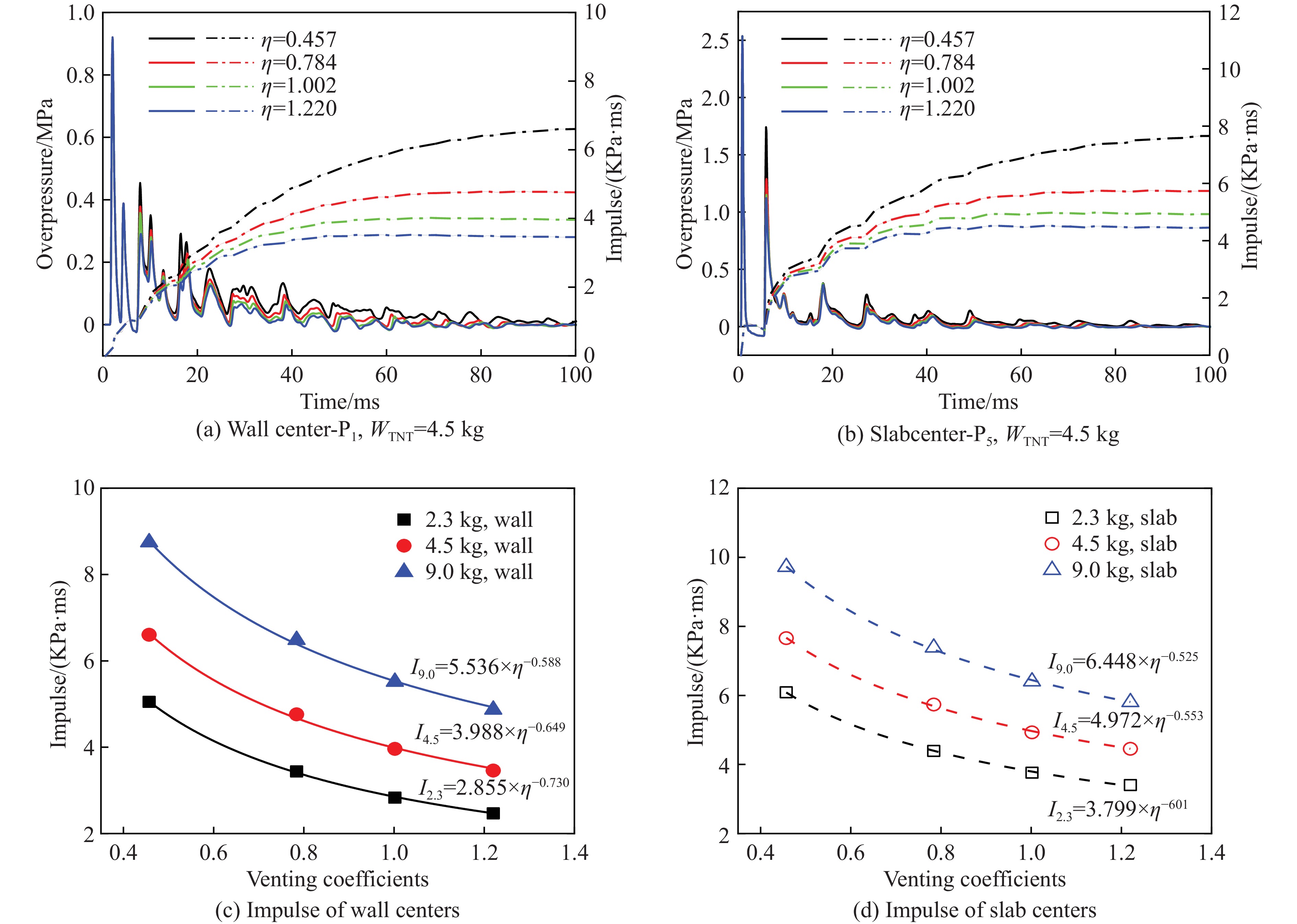 In a reinforced concrete (RC) box structure, the dissipation of blast waves is restricted, and damage to the structure can be intensified due to multiple reflections. To thoroughly investigate the load characteristics and dynamic behavior of internal explosions in an RC box structure, the applicability of the finite element method was verified by replicating internal explosion tests on fully enclosed and semi-enclosed (with venting openings) RC box structures. Based on this, numerical simulations of internal explosions were conducted for the prototypical RC box structure and the type of terrorist bombing attacks specified by the Federal Emergency Management Agency (FEMA) under three explosion scenarios and four venting areas. The influence of venting area on the load characteristics at the inner surfaces and corners, the load distribution on the inner surfaces, and the time histories of displacement and velocity at the centers of the inner surfaces under internal explosion loads were explored. Additionally, a formula for calculating the total impulse of the structure’s inner surface was proposed, considering both the venting area and the spatial distribution of the impulse. The results show that the venting area has a negligible effect on the overpressure, while the impulse decreases exponentially with increasing venting area. The load distribution characteristics on the structure’s inner surface are significantly influenced by the structural dimensions, exhibiting an “indented” or “W” pattern. The maximum displacement at the centers of walls and slabs is reduced by about 50% as the venting coefficient changes from 0.457 to 1.220. Finally, based on the total impulse and maximum displacement response of each component under free-field explosion loads, a calculation method for the impulse and damage enhancement coefficient was proposed based on the venting area, effectively predicting the internal explosion load and the structure’s dynamic behavior at various venting coefficients.