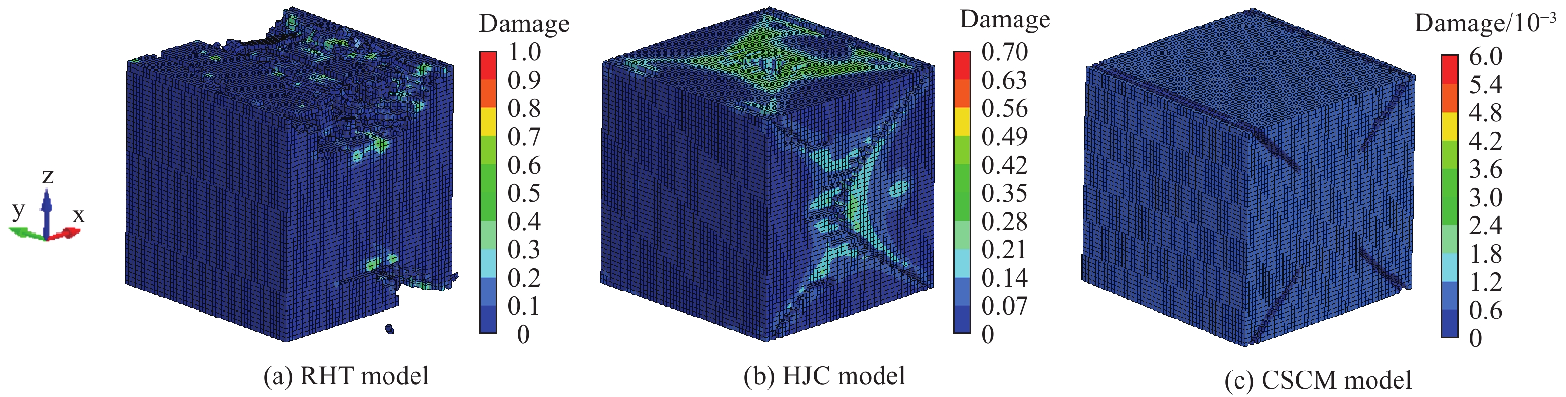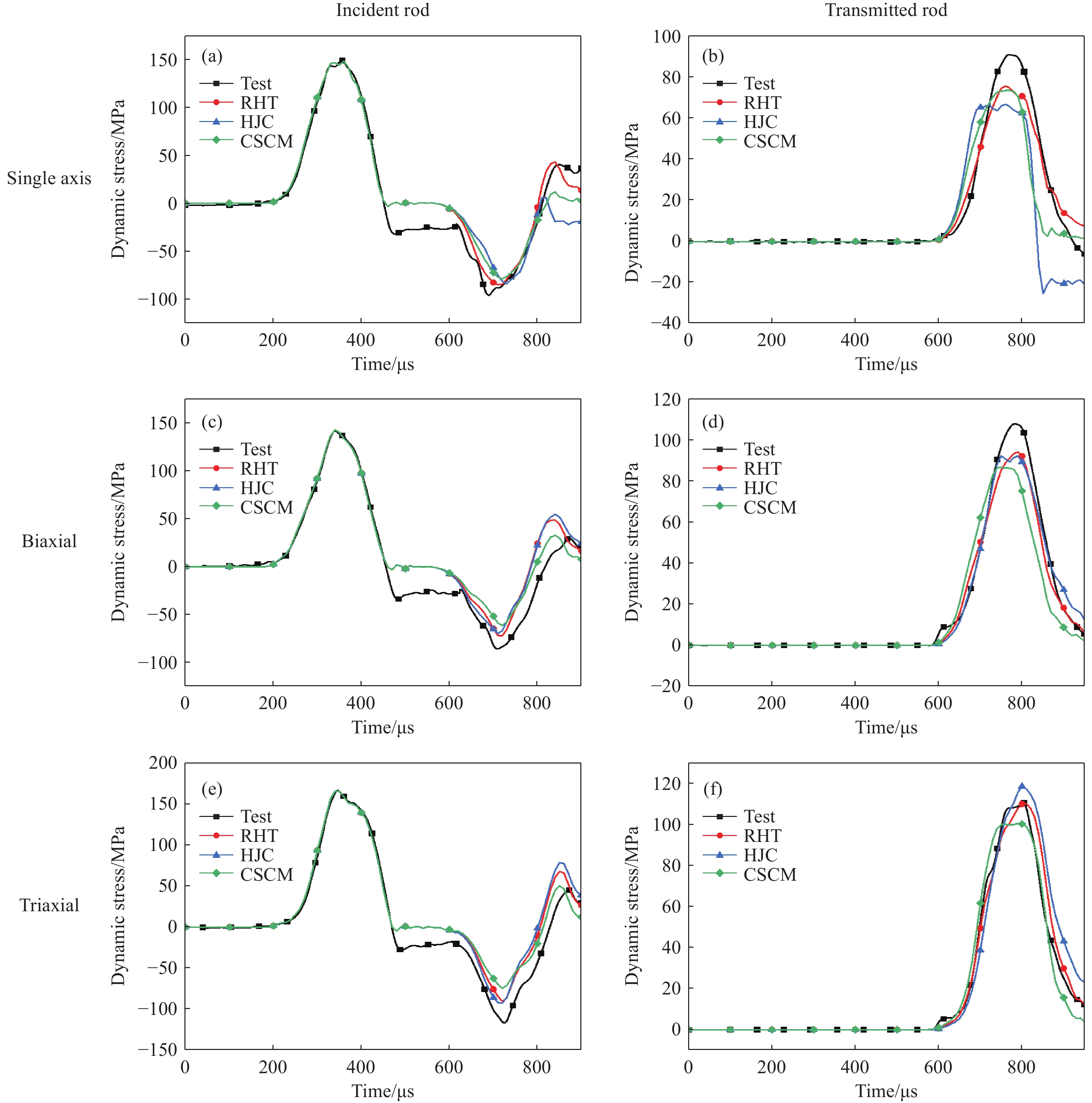 The dynamic mechanical properties of deep rocks are critical to understanding geological processes and optimizing resource extraction. Accurately understanding the dynamic mechanical properties of deep rocks not only provides insights into the geological processes and evolution of Earth's interior, but also offers a theoretical basis for the effective extraction of deep minerals and energy. In this study, the dynamic mechanical behavior of white sandstone from a coal mine was experimentally and numerically analyzed under uniaxial, biaxial, and triaxial stress conditions. Numerical simulations based on three constitutive models consisting of the Riedel-Hiermaier-Thoma (RHT) model, the Holmquist-Johnson-Cook (HJC) model, and the continuous surface cap model (CSCM), were validated by using experimental results from three-dimensional Hopkinson bar tests. The results indicate that the shear failure damage of white sandstone specimens decreases with the increasing prestress, with triaxial stress conditions yielding significantly lower damage than uniaxial or biaxial conditions. Among the three models, the RHT constitutive model demonstrates the closest agreement with the experimental results in terms of stress waveforms, peak stress, peak strain, and damage degree. Compared with the experimental data, the RHT model exhibits a stress peak deviation rate of 3.5% and 13.6% for the reflected wave under uniaxial and biaxial conditions, respectively, while the stress peak deviation rate for the transmitted wave is the lowest. Additionally, the peak stress and strain values predicted by the RHT model are numerically closer to the experimental results. The damage state predicted by the RHT model also aligns well with the experimental observations: under uniaxial loading, the damage exhibits a U-shaped pattern, whereas the HJC model showed a larger V-shaped damage pattern and fracture, and the CSCM model displayed surface damage with a smaller affected area. In terms of energy absorption and dissipation, the simulation results based on the three constitutive models shows minimal differences. The incident, reflected, and transmitted energy values are nearly identical across all three models. In addition, the damage degree of the white sandstone specimens increases with the impact velocity. The damage simulation results of the three constitutive models also show an increasing trend with the impact velocity, while retaining the damage characteristics.
