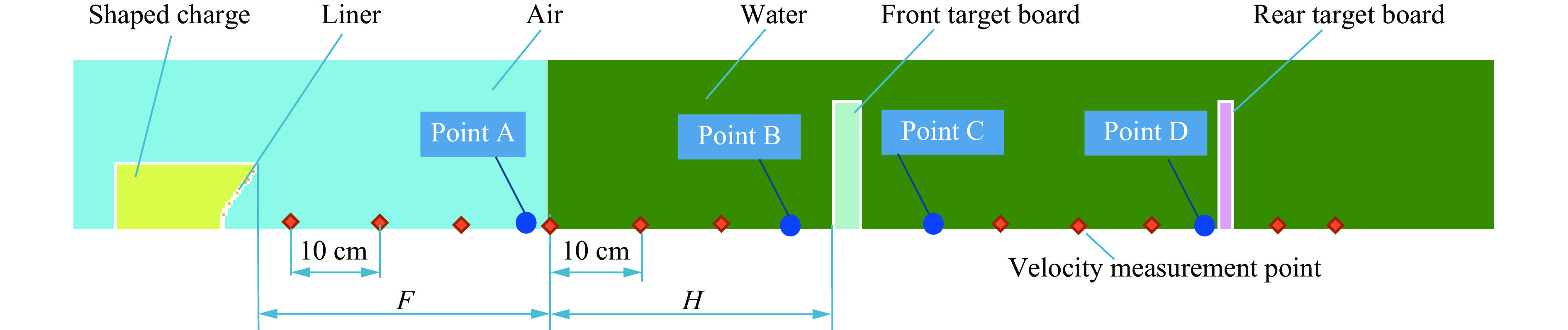 To select the shaped charge structure suitable for large-distance non-contact penetration damage in water, three typical shaped-charge structures, explosively formed projectile (EFP), jetting projectile charge (JPC), and shaped charge jet (SCJ), were selected. The velocity tests of different penetrators before entering water, before hitting the target, and after penetrating the target were carried out, and the penetration tests of double-layer spaced targets in water were conducted. Firstly, a comparative test of penetration of three types of shaped charges in the air was carried out to verify the rationality of the structure of shaped charges. The air explosion height of 35 cm was selected to meet the penetration requirements of the three shaped charges. At the same time, the velocity of the shaped charges before penetrating water was measured, which provides the basis for the underwater penetration test. Secondly, the penetration test of three types of shaped charges on an underwater double-layer spaced target was carried out when the air height was 35 cm, and the length of the water medium in front of the target was 20 cm, 45 cm, and 100 cm. The reflected pressures were measured by the wall pressure sensor and PVDF sensor. The velocities of the penetrator at the time of water entry, before the target, and after the target were measured by double-layer on-off net targets.The damage performance of three shaped charge structures on the double-layer spaced target plate was respectively obtained when the water medium in front of the target was at short range, medium range and long range.Based on the projectile-target structure used in the experiment, a two-dimensional finite element model of shaped charge penetrating a double-layer spaced target in water was established using ANSYS/LS-DYNA finite element software. The measured velocity values of the shaped charge penetrator before entering the water, before hitting the target, and after passing through the target were compared with the numerical simulation results to verify the accuracy of the model. The error rate is about 3 %. Based on the verified finite element model, the time series characteristics of the underwater damage element of the shaped charge, the peak characteristics of the forward shock wave in the water, the variation law of the penetration velocity in the water, and the penetration performance of the shaped charge against the double-layer spaced target in the water were studied. The results show that the forward shock wave reaches the target plate before the penetrator. As the length of the water medium increases, the peak pressure of the forward shock wave at the front target plate decreases linearly, and the peak pressure of the forward shock wave at the rear target plate decreases nonlinearly. The velocities of EFP, JPC, and SCJ decrease nonlinearly with the increase of water medium, and the velocity in front of the SCJ target is about twice that of JPC.When the length of the water medium in front of the target is not more than 25 cm, the maximum perforation diameter formed by EFP on the front target plate reaches 5 cm, which is 1.3 times the perforation diameter of JPC and 3 times the perforation diameter of SCJ. When the length of the water medium in front of the target is not more than 100 cm, JPC and SCJ have better penetration effect on the double-layer spacer target, and the penetration performance of JPC is better than that of SCJ.