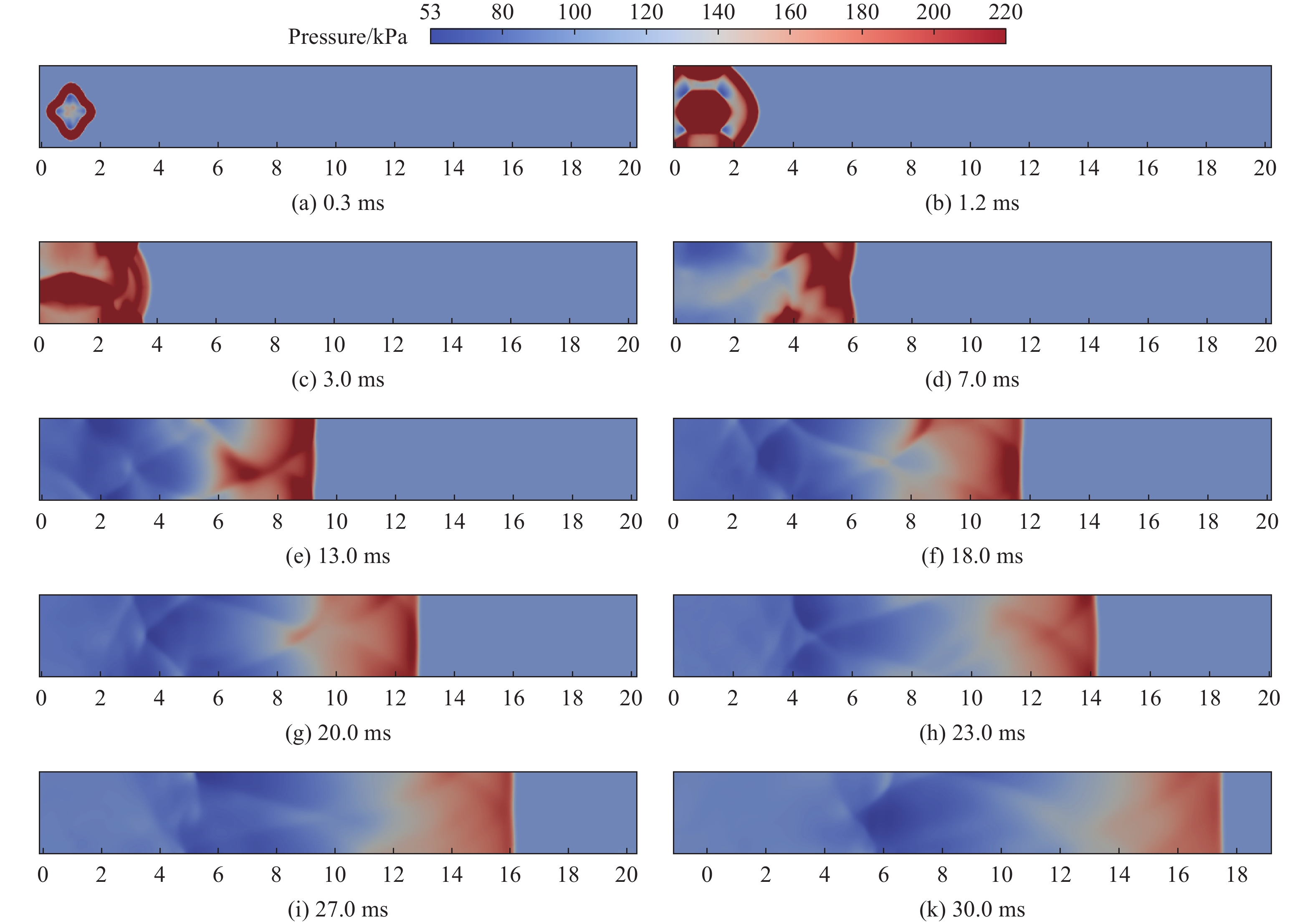 Shock initiation and ignition techniques driven by electrically exploded metallic bridge foils with insulating flyers have been widely implemented in initiation and ignition system of weapon. To address the deficiency in existing research regarding the description of the flow field evolution during the motion of flyer and promote the development of this technology towards efficient energy utilization and miniaturization, a double-pulse laser schlieren transient observation system was constructed. This system enables the acquisition of density distributions of the flow field and the motion distance of the flyer at different time. Additionally, a two-dimensional axisymmetric fluid dynamics calculation model and calculation method for the motion process of flyer driven by the electric explosion of metal foil were established, and corresponding numerical simulation calculations were performed in consideration of the evolution laws of the flow field inside and outside the acceleration chamber under the effects of the motion of flyer, the compression of shock wave, and the expansion of high-temperature and high-pressure plasma. The phase transition of bridge foil from solid phase to plasma phase was described by phase transition fraction, the state of plasma with high temperature and pressure was described by the state equation of plasma which consider the changes in particle number and coulomb interaction between particles, and the motion of flyer was described by dynamic grid model. The calculated flow field density distribution closely matches the experimental results, and the maximum errors in flyer motion distance and velocity are 6.1% and 8.1%, respectively, validating the accuracy of the calculation model and calculation method. The research results indicate that when the capacitance is 0.33 μF and the initiation voltage is2800 V, within the research range, the maximum pressure in the flow field remains approximately at 1×107 Pa; the temperature in the flow field gradually decreases from 9950 K at 516 ns to 3100 K at 2310 ns; and the plasma phase distribution in the flow field gradually evolves from a flat shape to a long strip shape, with the maximum diffusion distance of plasma in the direction perpendicular to the motion of the flyer being 0.8 mm. At 1360 ns, upon flyer breakthrough the shock wave front, a distinct bulge-shaped profile emerges in the leading edge of both pressure and temperature distributions within the flow field.