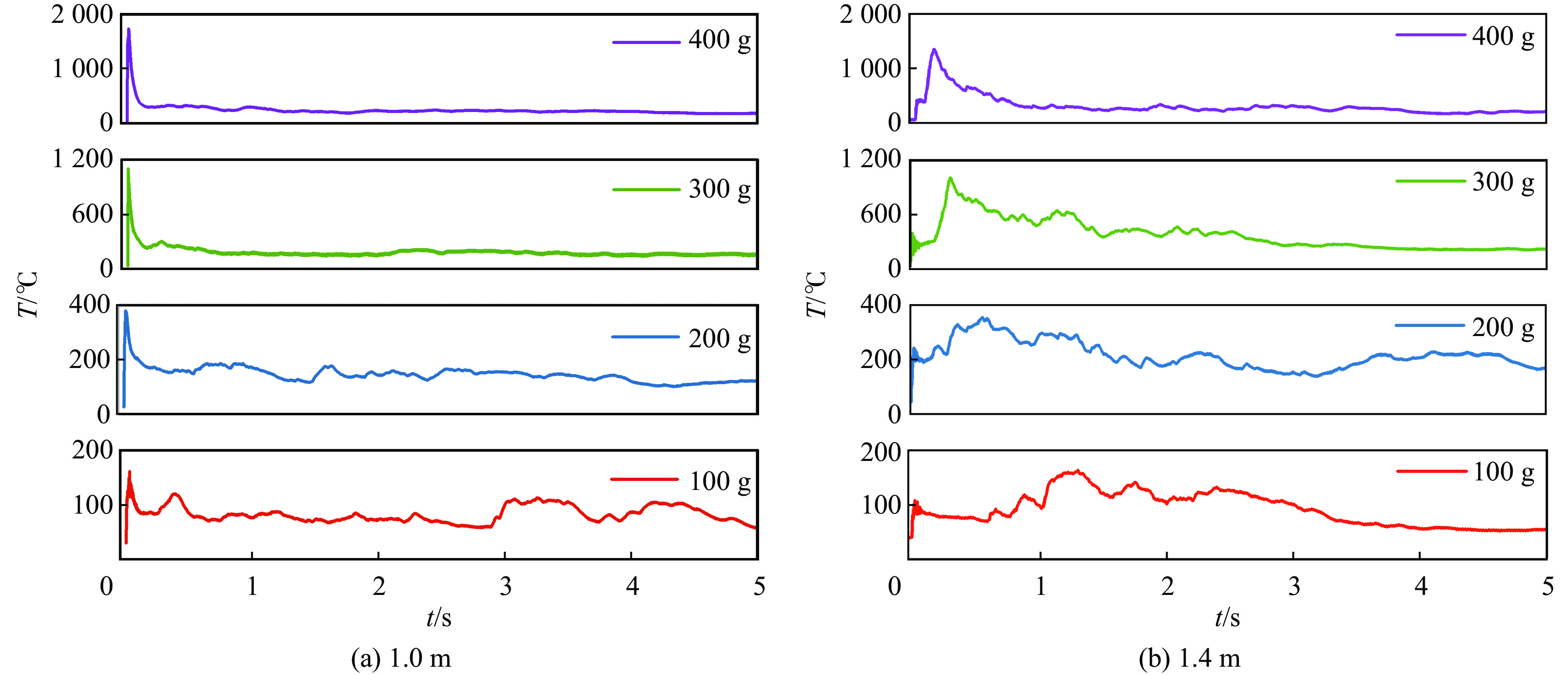 In order to investigate the coupled enhancement effects of shock wave and temperature generated by thermobaric explosives in confined spaces, internal explosion experiments were conducted with 100~400 g charges in a confined building space. Pressure sensors and thermocouples were employed to obtain the explosion pressure and temperature data at different locations within the confined space. The experiments revealed the evolution characteristics and propagation patterns of the shock wave and temperature field produced by the thermobaric explosive. The results show that the temperature generated by the internal explosion of the thermobaric explosive exhibits significant secondary heating and prolonged duration characteristics. A decay model for the initial peak temperature based on the scaled distance was established. The TNT equivalence coefficient of the shock wave from the internal explosion of the thermobaric explosive exhibits a concave hyperbolic trend with increasing scaled distance. At a scaled distance of 1.7 m/kg1/3, the TNT equivalence coefficient of the shock wave overpressure reaches a minimum value of 1.43, indicating that this position is the turning point where the energy from aerobic afterburn combustion exerts a significant effect on the peak overpressure. A two-stage prediction model for the peak overpressure was established, describing the contributions of non-ideal detonation and the aerobic afterburn effect of aluminum powder to the shock wave in different regions. Based on the pressure rise caused by the expansion of detonation products and the temperature rise due to afterburn combustion, a quasi-static pressure prediction model for the internal explosion of thermobaric explosives was established. Taking the quasi-static pressure of the 100 g charge as the reference, the quasi-static pressures for the 200, 300, and 400 g charges increased to 2.27, 3.21, and 4.18 times the reference value, respectively, showing a nonlinear growth under the coupled effect of detonation product expansion and afterburn temperature rise.