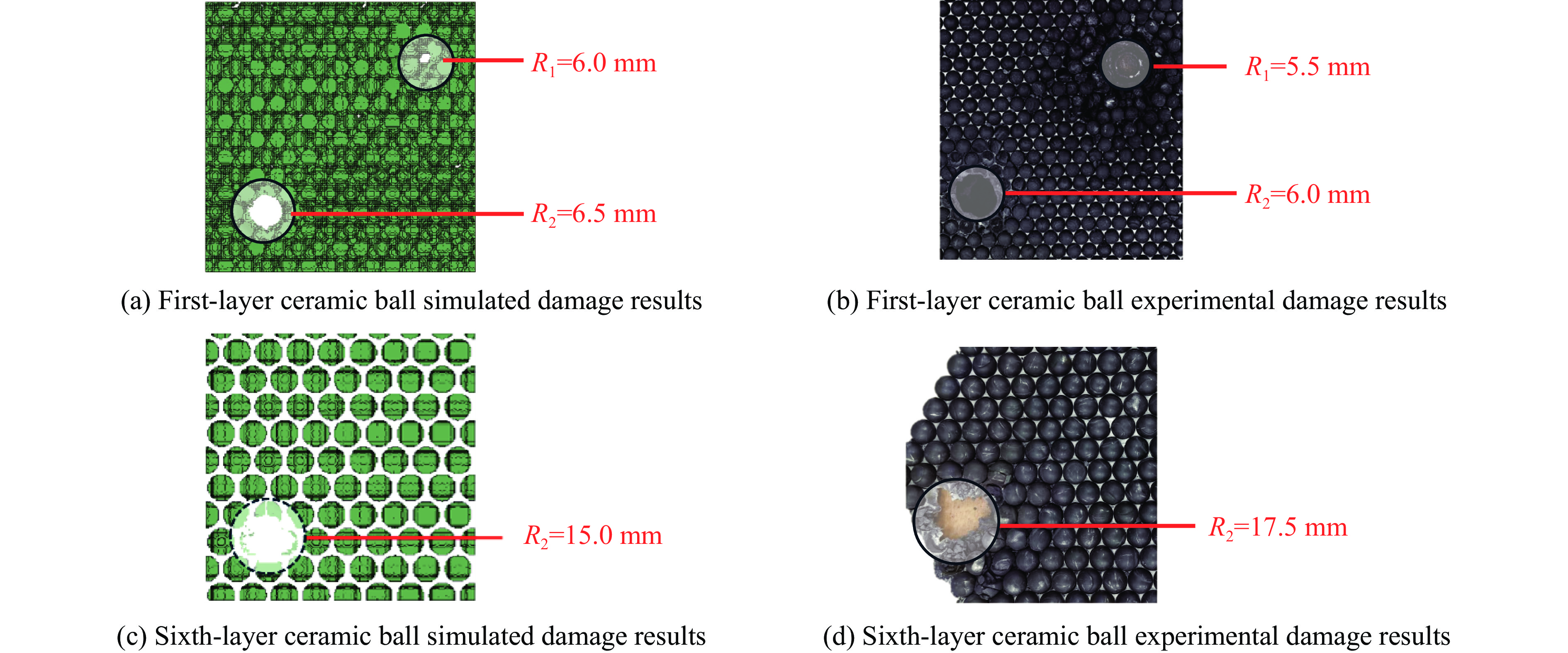 Ceramic/metal composite armor has attracted extensive attention in lightweight protective structures because of its high hardness, excellent energy dissipation capability, and strong resistance to repeated impacts. However, most existing studies focus on uniformly distributed ceramic balls and single-impact scenarios, leaving the damage evolution and protective mechanisms of gradient ceramic-ball composites under multiple impacts insufficiently understood. To address these limitations, a gradient ceramic-ball metal composite structure was proposed to improve the multi-hit resistance of composite armor. Penetration experiments using 12.7 mm armor-piercing incendiary projectiles were conducted to investigate the ballistic response of the composite target. Based on the experimental conditions, numerical simulations were carried out using the LS-DYNA software to analyze the penetration behavior of successive projectiles impacting the composite target plate. A three-dimensional finite element model was established to reproduce the penetration process, in which the Johnson–Cook constitutive model was employed to describe the mechanical behavior of metallic components and the Johnson–Holmquist ceramic constitutive model was adopted to characterize the dynamic response and failure behavior of ceramic materials. Appropriate contact algorithms and erosion criteria were implemented to simulate the interaction, damage, and fragmentation processes between the projectile and the target materials. Parametric numerical simulations were further performed to analyze the penetration characteristics of successive projectiles during the multi-impact process. The effects of ceramic ball diameter, impact spacing between successive projectiles, and gradient arrangement direction of ceramic balls on the ballistic performance of the composite structure were systematically investigated. In addition, the penetration depth, energy absorption characteristics, damage morphology of the target, and projectile deflection behavior were analyzed to reveal the influence of structural heterogeneity and pre-existing damage on the penetration response. The results show that increasing the diameter of ceramic balls significantly enlarges the damage region and enhances the structural non-uniformity, thereby increasing the sensitivity of the structure to impact location. Under multiple projectile impact conditions, the pre-existing damage caused by the first projectile significantly reduces the energy absorption capacity of the target plate and alters the penetration behavior of the subsequent projectile, especially when the impact point of the latter is located within the damaged region. Within a certain range of impact spacing, projectile deflection induced by damage heterogeneity effectively reduces the penetration depth of the backing plate even when the absorbed kinetic energy remains nearly unchanged. Compared with the negative-gradient configuration, the positive-gradient ceramic-ball composite armor reduces the damage area of the first ceramic layer by 14.8%–57.8% under the same areal density and effectively restricts the expansion of the initial damage region, thereby maintaining higher structural integrity under repeated impacts. These results indicate that a properly designed gradient distribution of ceramic balls can significantly improve the multi-hit resistance of ceramic/metal composite armor and provide useful guidance for the lightweight design and structural optimization of gradient ceramic-ball composite armor.