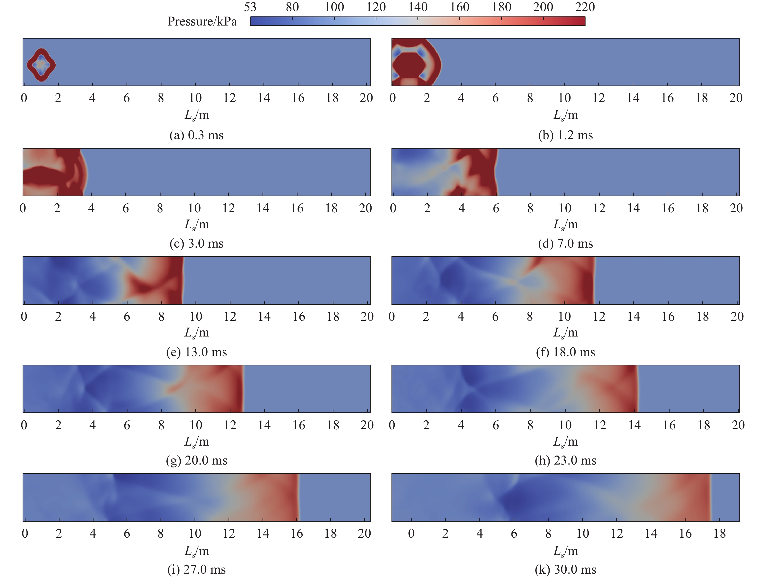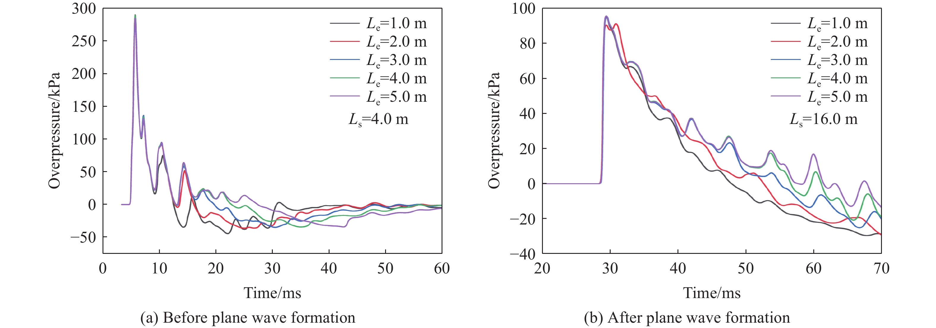 为研究温压炸药隧道内爆炸冲击波的传播规律和火团的热效应,基于OpenFOAM开展温压炸药隧道内爆炸数值模拟,与温压炸药隧道内爆炸试验数据对比验证数值模拟精度,研究沿隧道轴线距离、炸药质量对爆炸冲击波传播特性及火团热效应的影响。结果表明:相同装药质量条件下,沿隧道轴线距离大于1/3隧道等效圆直径时,爆炸冲击波超压峰值衰减规律和平面波形成距离不随沿隧道轴线距离变化而变化;冲击波平面波形成后,冲量随沿隧道轴线距离的增大先增大后不变。沿隧道轴线相同距离处爆炸,冲击波形成平面波距离随炸药质量的增加而增大;平面波形成后,冲击波超压峰值衰减规律不受装药质量影响,但冲击波冲量随装药质量的增加而增长。受隧道口泄能效应的影响,隧道内爆炸火团总是向近隧道口方向移动,隧道壁面约束使得火团沿隧道轴线垂直方向发展受限;火团轴线方向出现高温尖端,隧道内轴线方向温度分布具有对称性。进一步建立爆炸火团在不同温度轴线方向传播的最大距离与炸药质量的拟合公式,可预测典型温压炸药隧道内爆炸火球不同温度轴线方向上传播最大距离。