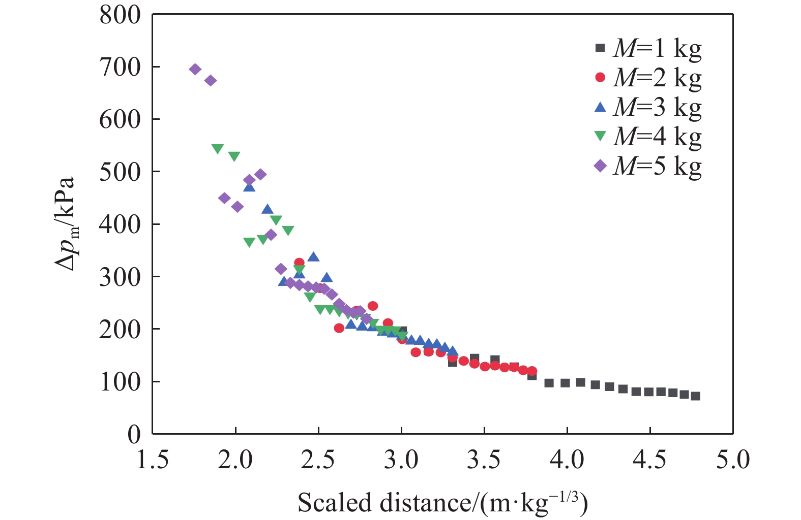 为研究温压炸药在密闭空间内爆炸冲击波及温度的耦合增强效应,开展了100~400 g温压炸药密闭建筑空间内爆炸试验研究,利用压力传感器和热电偶获得了密闭空间不同位置处的爆炸压力和温度数据,揭示了温压炸药爆炸冲击波与温度场演变特征及传播规律。结果表明:温压炸药内爆炸温度场具有显著的二次升温和长持时特征,提出了基于比例距离的温度初始峰值预测模型。温压炸药内爆炸冲击波等效TNT当量系数随比例距离增大呈下凹双曲线变化趋势,在比例距离为1.7 m/kg1/3时TNT等效当量系数达到最小值1.4,该位置对应爆炸火球边界及冲击波冲量增长率转折点。建立了冲击波超压和冲量的两阶段预测模型,该模型能够更好的描述温压炸药非理想爆轰与铝粉后燃效应在不同区域下对冲击波的贡献。基于爆炸产物膨胀和后燃升温引起的压力上升,建立了温压炸药内爆炸准静态压力预测模型,随着装药质量从200 g增加到400 g,准静态压力相较于100 g从2.27增加到4.18倍,准静态压力在爆轰产物和后燃升温的耦合作用下表现为非线性增长。