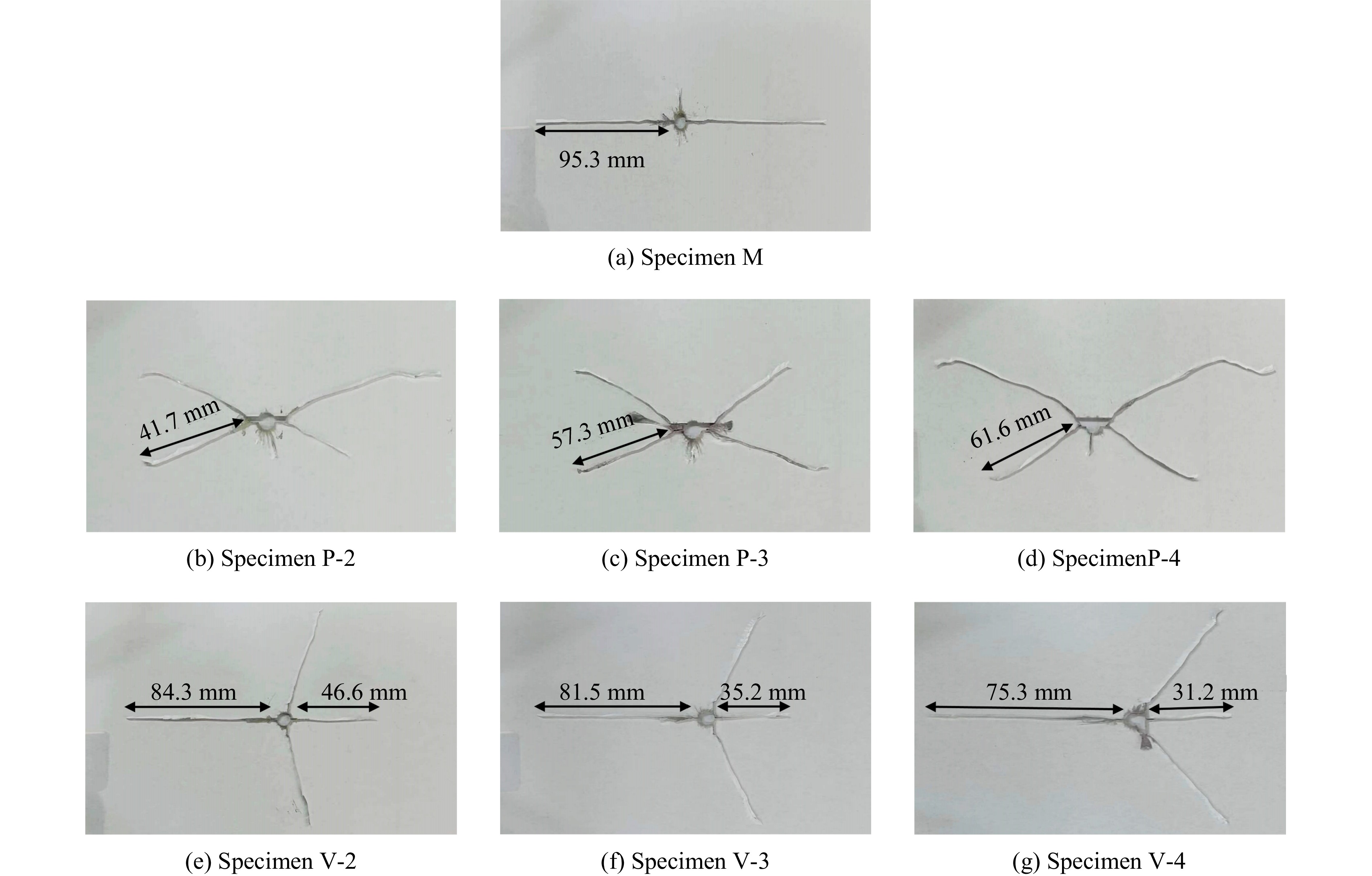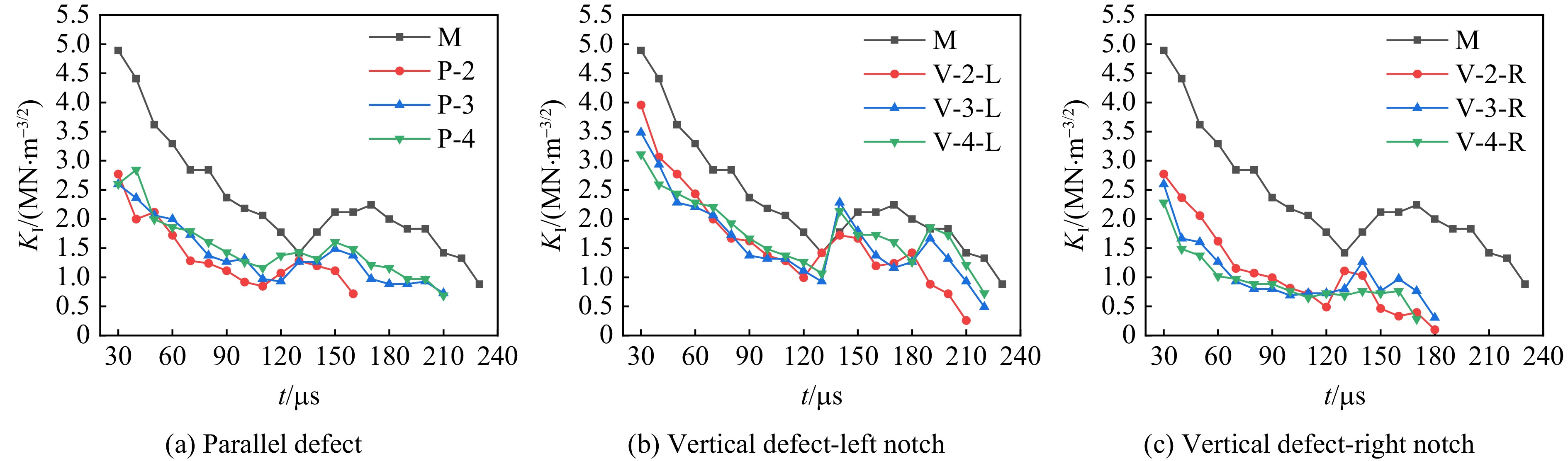 The defective cracks were prefabricated on the wall of the notch holes by using PMMA material, which were parallel or vertical to the notch, and the distance from the defective cracks to the holes center was 2, 3, and 4 mm. The influence of notch hole wall defects on the crack propagation of notch blasting was investigated by using a digital dynamic caustic experimental system with numerical simulation. At the same time, TATP explosives were employed as a charge, which served to mitigate the effect of gun smoke on the dynamic caustic experimental system and to improve the experimental design. The results demonstrate that the reflection of the stress wave at parallel defects results in a downward shift in the direction of crack initiation at the notch, but the refraction of the stress wave at vertical defects has no effect on the direction of crack initiation. The presence of wall defects in the hole impedes the impact of stress waves and blast gases on the cracks at the notch, resulting in a reduction in the length, expansion rate, and strength factor values of the cracks, and the degree of inhibition is contingent upon the distance of the defects from the centre of the borehole. As the distance between the parallel defects and the centre of the borehole increases, the inhibition effect of the parallel defects on both sides of the notch cracks gradually decreases. the inhibition effect of vertical defects on the far side of the notch cracks gradually decreases, while the inhibition effect on the proximal side of the notch cracks gradually enhances. The left and right notch cracks of vertical defects are more significantly affected by the boundary reflected stress wave than those of parallel defects. The notch cracks on the left side do not exhibit a clear pattern, owing to the pre-existing reflected stress wave at the defects. In contrast, the notch cracks on the right side are substantially diminished by the boundary-reflected stress wave as the vertical defects move away from the center of the notch holes.