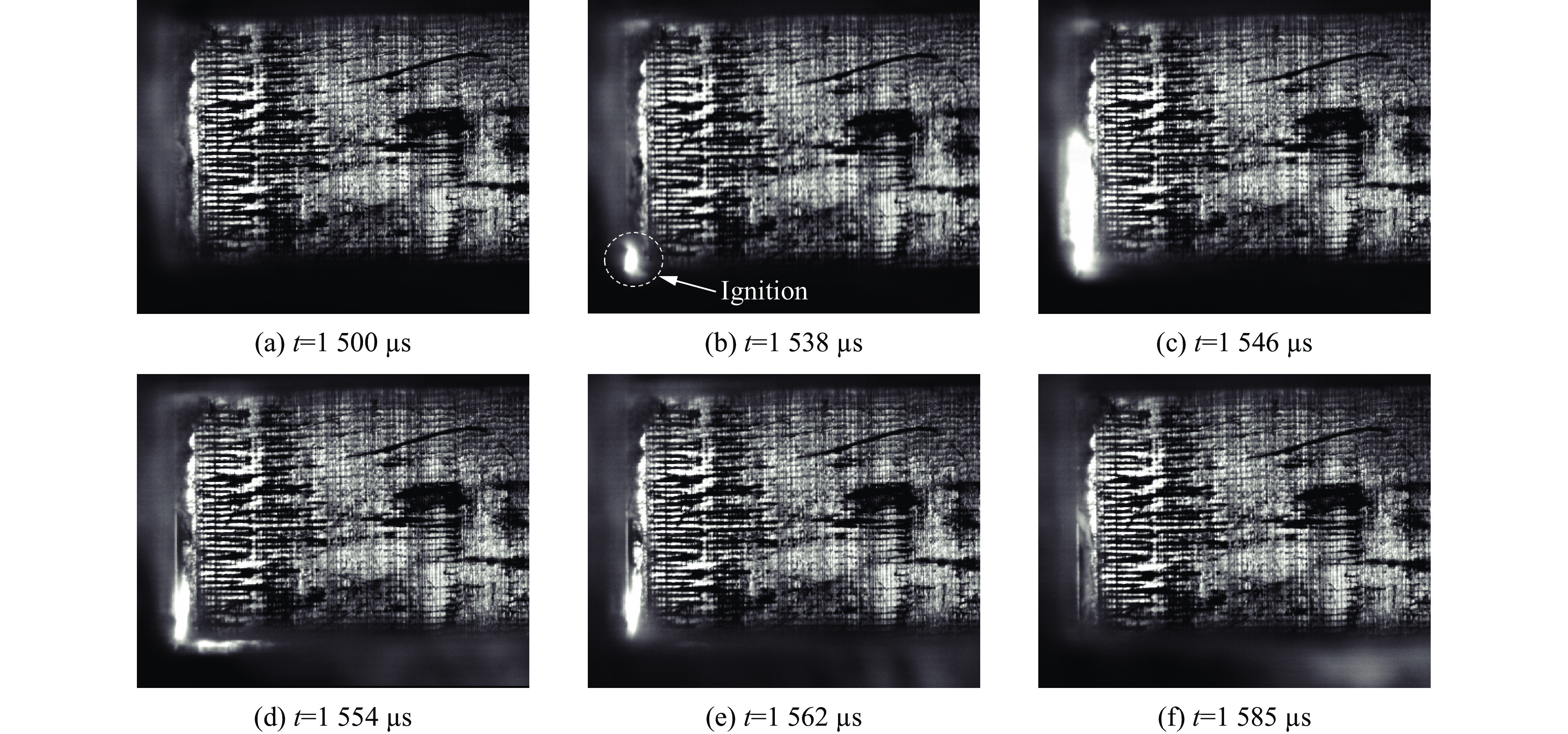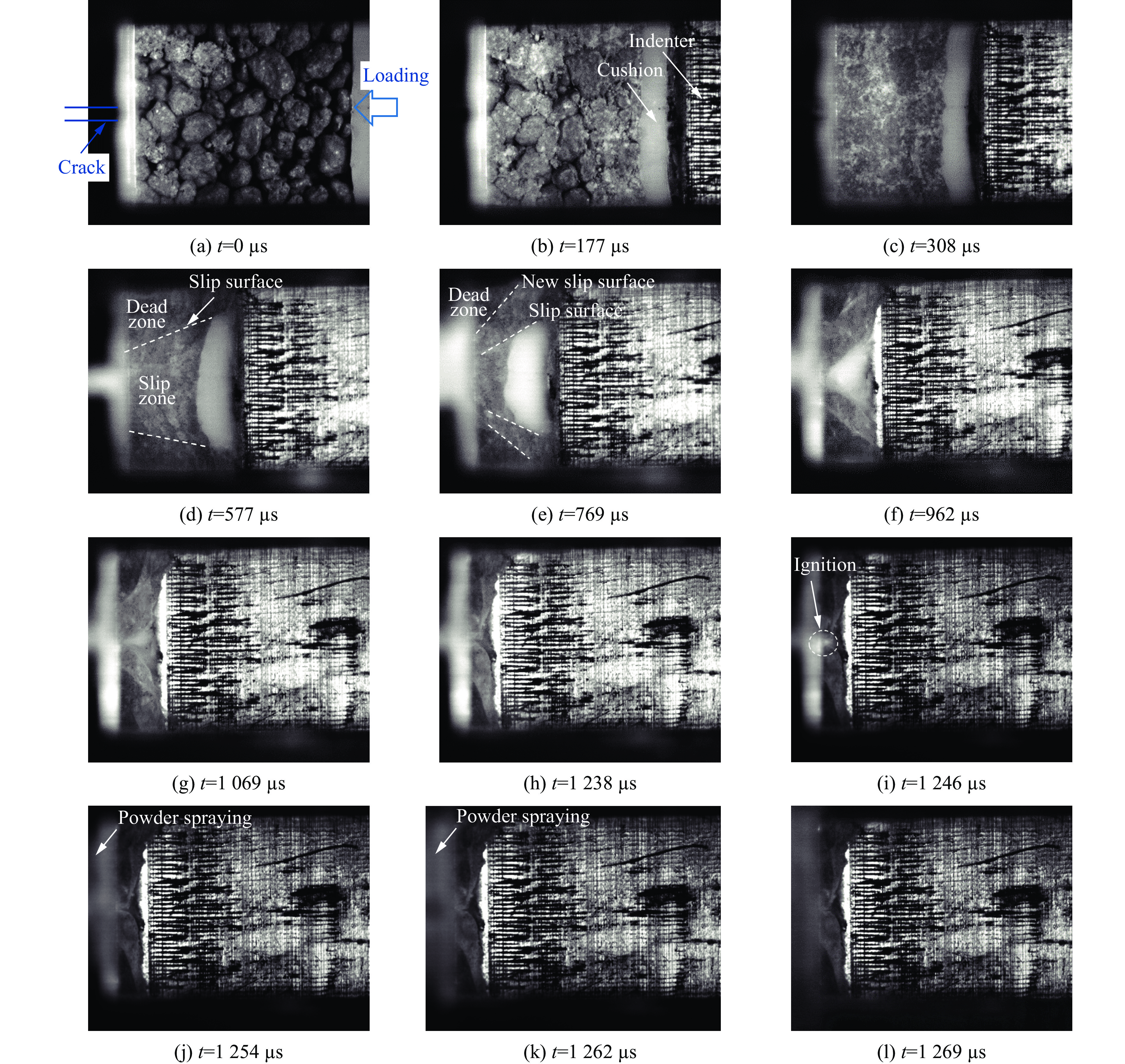 Modeling powder is used to simulate the highly fragmented state of pressed explosives resulting from collisions, and the gap extrusion ignition behavior of PBX modeling powder is studied. Experiments were designed based on the way of projectile impact method. To ensure that no flow space exists except the designed gap, the surface of the sample was covered with cushion and coated with grease for sealing. The movement and reaction of molding powder squeezing into the gap were recorded by high-speed photography. By changing the ratio of gap area to sample cross-sectional area, the influence of compaction on ignition was studied. The results show that in the absence of grease seal, PBX molding powder undergoes particle crushing and compaction, and then the compacted molding powder is extruded from the clearance near the cushion, and ignition occurs in the extrusion process. The ignition position is at the interface between explosive and cushion. In the case of grease seal, PBX molding powder does not ignite for a period of time after compaction. When the indenter moves halfway, a “wedge-shaped” slip zone is formed, and a slip-dead zone interface could be seen in high-speed camera photos. Then the deformation mode evolves from “single wedge” slip zone to “double wedge” slip zone, and the shear effect of slip-dead zone interface does not cause ignition. At the later stage of loading, the indenter travels close to the gap surface, and the “wedge-shaped” slip zone disappears. Before and after the collision between the indenter and the gap, the explosive ignites once in each instance. The first ignition occurs at the entrance of the gap, and the second ignition occurs at the corner of the indenter. Compaction effect has an important influence on ignition behavior. After compaction, the threshold value of ignition speed is obviously reduced, with the impact speed required to cause ignition being merely 4.5 m/s.