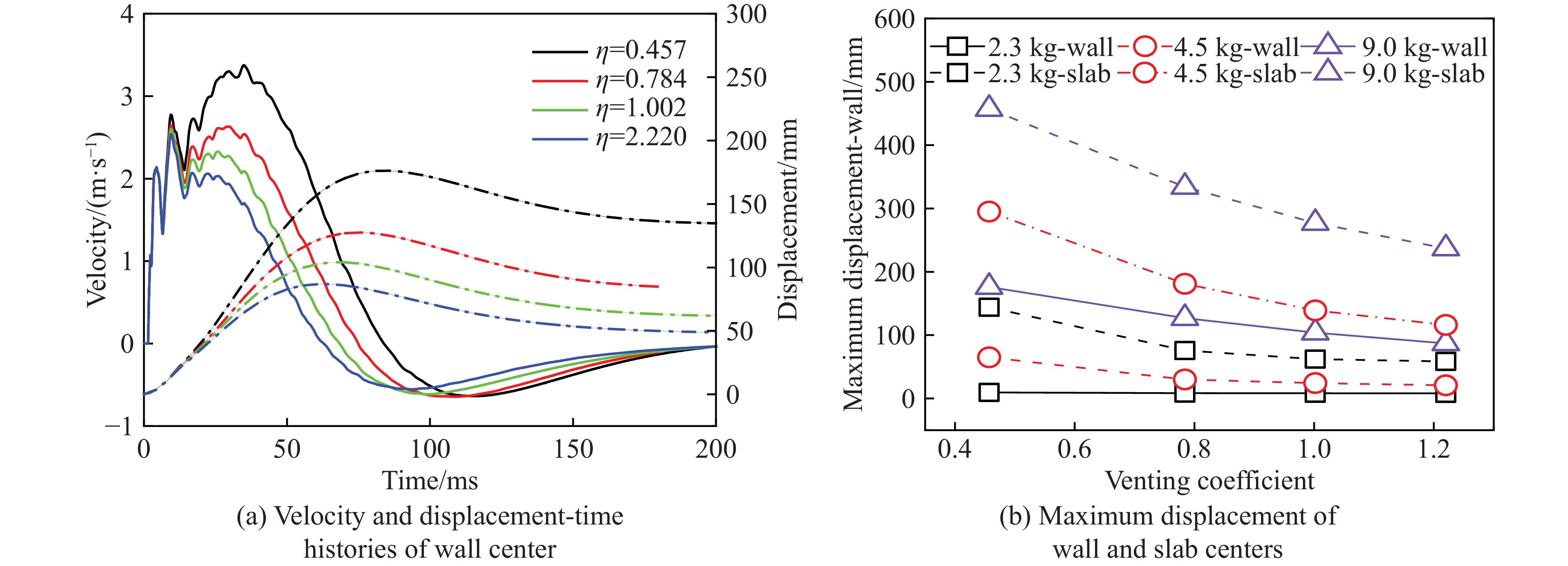 In a reinforced concrete (RC) box structure, the dissipation of blast waves is restricted, and damage to the structure can be intensified due to multiple reflections. To thoroughly investigate the load characteristics and dynamic behavior of internal explosions in an RC box structure, the applicability of the finite element method was verified by replicating internal explosion tests on fully enclosed and semi-enclosed (with venting openings) RC box structures. Based on this, numerical simulations of internal explosions were conducted for the prototypical RC box structure and the type of terrorist bombing attacks specified by the Federal Emergency Management Agency (FEMA) under three explosion scenarios and four venting areas. The influence of venting area on the load characteristics at the inner surfaces and corners, the load distribution on the inner surfaces, and the time histories of displacement and velocity at the centers of the inner surfaces under internal explosion loads were explored. Additionally, a formula for calculating the total impulse of the structure’s inner surface was proposed, considering both the venting area and the spatial distribution of the impulse. The results show that the venting area has a negligible effect on the overpressure, while the impulse decreases exponentially with increasing venting area. The load distribution characteristics on the structure’s inner surface are significantly influenced by the structural dimensions, exhibiting an “indented” or “W” pattern. The maximum displacement at the centers of walls and slabs is reduced by about 50% as the venting coefficient changes from 0.457 to 1.220. Finally, based on the total impulse and maximum displacement response of each component under free-field explosion loads, a calculation method for the impulse and damage enhancement coefficient was proposed based on the venting area, effectively predicting the internal explosion load and the structure’s dynamic behavior at various venting coefficients.