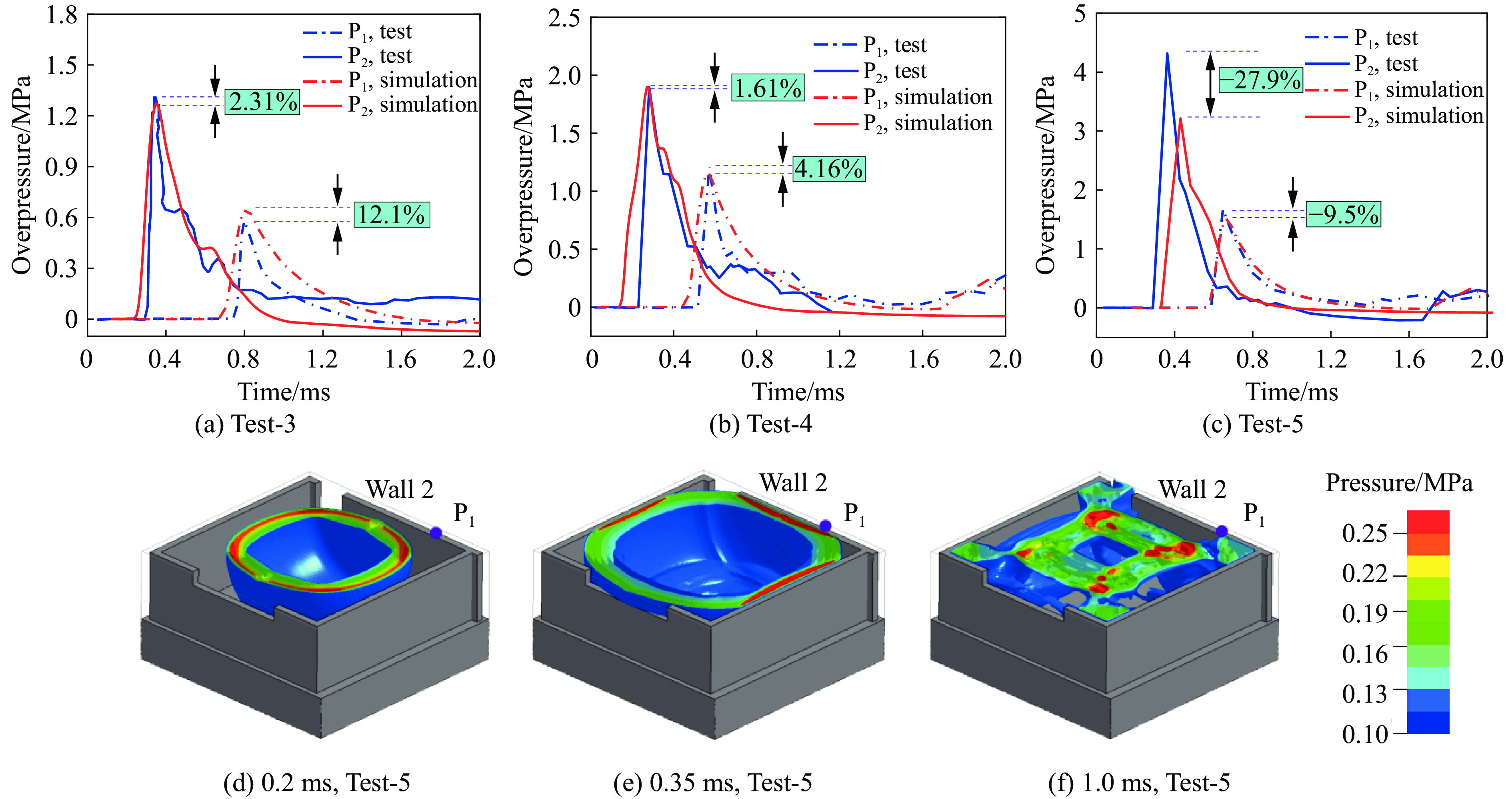To study the loading characteristics of shock wave along the water surface in near-surface explosion scenarios, explosion tests were carried out with three typical scaled height of burst . The explosion tests were contact burst (H_ = 0), near-surface blast (H_ ≈ 0.2m /kg1/3) and air blast (H_ ≈ 0.6m /kg1/3). In the experiment, 100 g, 200 g and 400 g TNT/RDX(40/60) explosives were used, and the shock wave overpressure and high-speed photographic images of the explosion were measured. Meanwhile, numerical simulation method is used to simulate the experiment. Based on the experimental and numerical simulation results, the explosion phenomena and the characteristics of shock wave loading on water surface were studied. The results show that there are significant differences in the explosion phenomena of contact burst, near-surface blast, and air blast. In contact burst, the detonation products directly drive the water surface to form a hemispherical cavity, and the water on the edge of the cavity is squeezed upwards to form a hollow water column. In near-surface blast, the collision of the detonation products with the water surface is relatively weak, and the shock wave on the water surface mainly propagates outwards as Mach waves along the water surface. In air blast, there are obvious regular and irregular reflection zones of the shock wave on the water surface. The shock wave overpressure on water surface of contact burst is lower than that of near-surface blast, therefore, the water surface cannot be considered as a rigid plane in contact burst. The underwater shock wave pressure of contact burst is higher than that of near-surface blast. The formulas of overpressure and positive pressure duration of shock wave on water surface within the range of 0.5~4.0 m/kg1/3 in contact burst and near-surface blast were obtained through data fitting, which can provide reference for shock wave loading calculation and analysis.