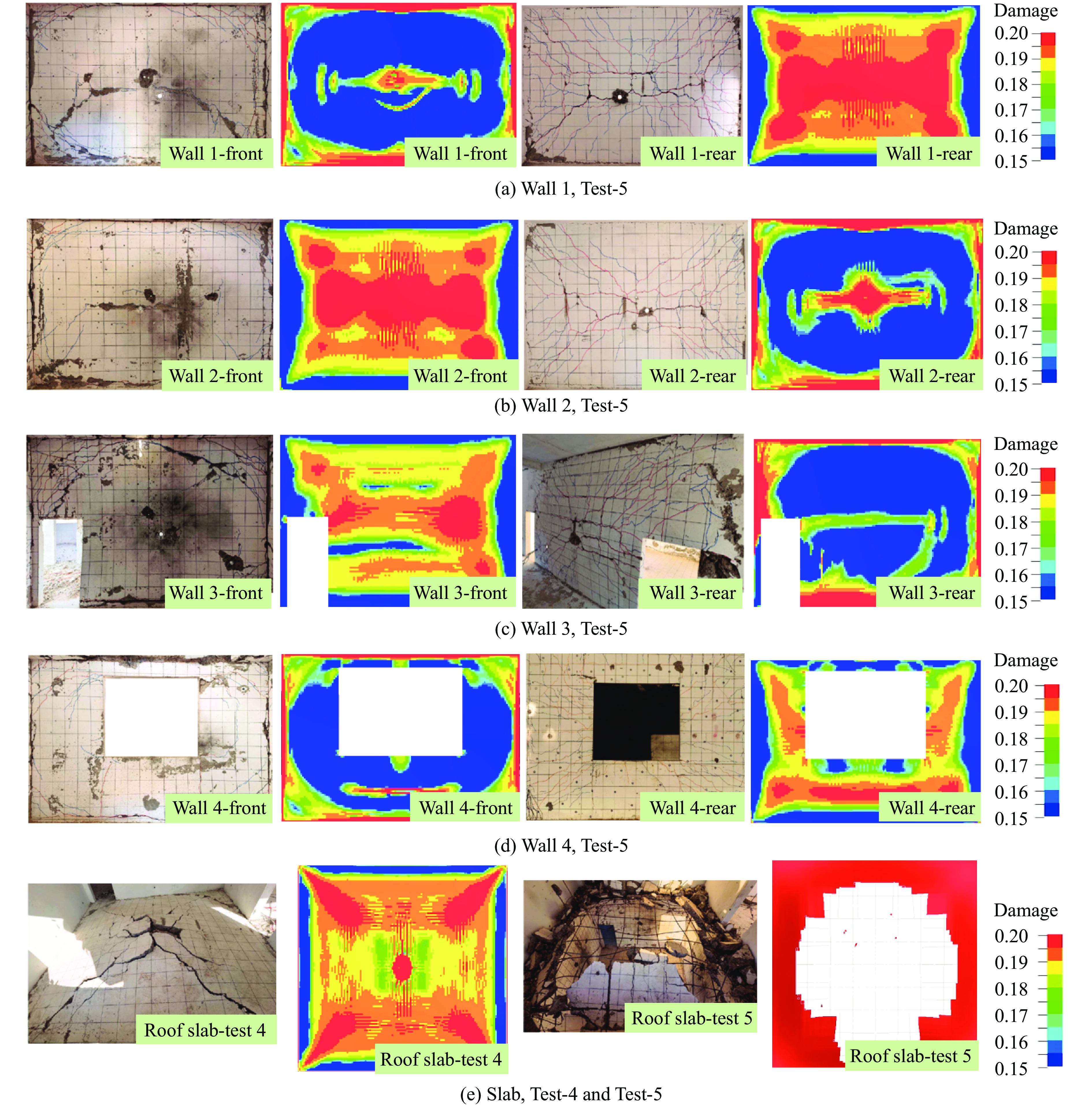 In order to study the anti-explosion performance of a single-room reinforced concrete building under internal explosion loads, a full-scale reinforced concrete single-room building, whose dimensions were 4m×4m×3m, was designed and constructed. For the internal explosion test, 3kg TNT was placed in the geometric center of the room. Sensors were installed at the center of the shear wall and roof to record data and analyze the damage characteristics of the single-room structure. In addition, an anti-explosion numerical model of the reinforced concrete single-room structure was established and verified using the LS-DYNA software. The weight of the explosives in the numerical model was changed to study the damage process and shock wave propagation law of the single-room building. Based on the experimental and simulation results, the damage modes of the single room structure were categorized by the dimensionless weighted parameter Dr, and relevant empirical formulas were obtained through data fitting. The results show that when 3kg TNT explodes in the geometric center of the room structure, the single-room structure exhibits roof bulging, with long cracks appearing along the roof edges. However, the whole structure does not collapse; Under the internal explosion condition, the local damage characteristics of reinforced concrete buildings are not only closely related to the explosive yield, but also significantly affected by the design of structural connection nodes and structural details; Due to the delayed dynamic response of reinforced concrete, the next shock wave has acted on the building before the last shock wave has reacted obviously, which subjects it to multiple impacts within a very short time; By varying the charge weight, five damage-aggravating modes (Model I to Model V) were identified. The five damage modes were quantitatively defined using the weighted parameter Dr, and a function curve relating it to the explosive equivalent was fitted. These research findings can provide a reference for damage assessment of shear wall-structured rooms.
