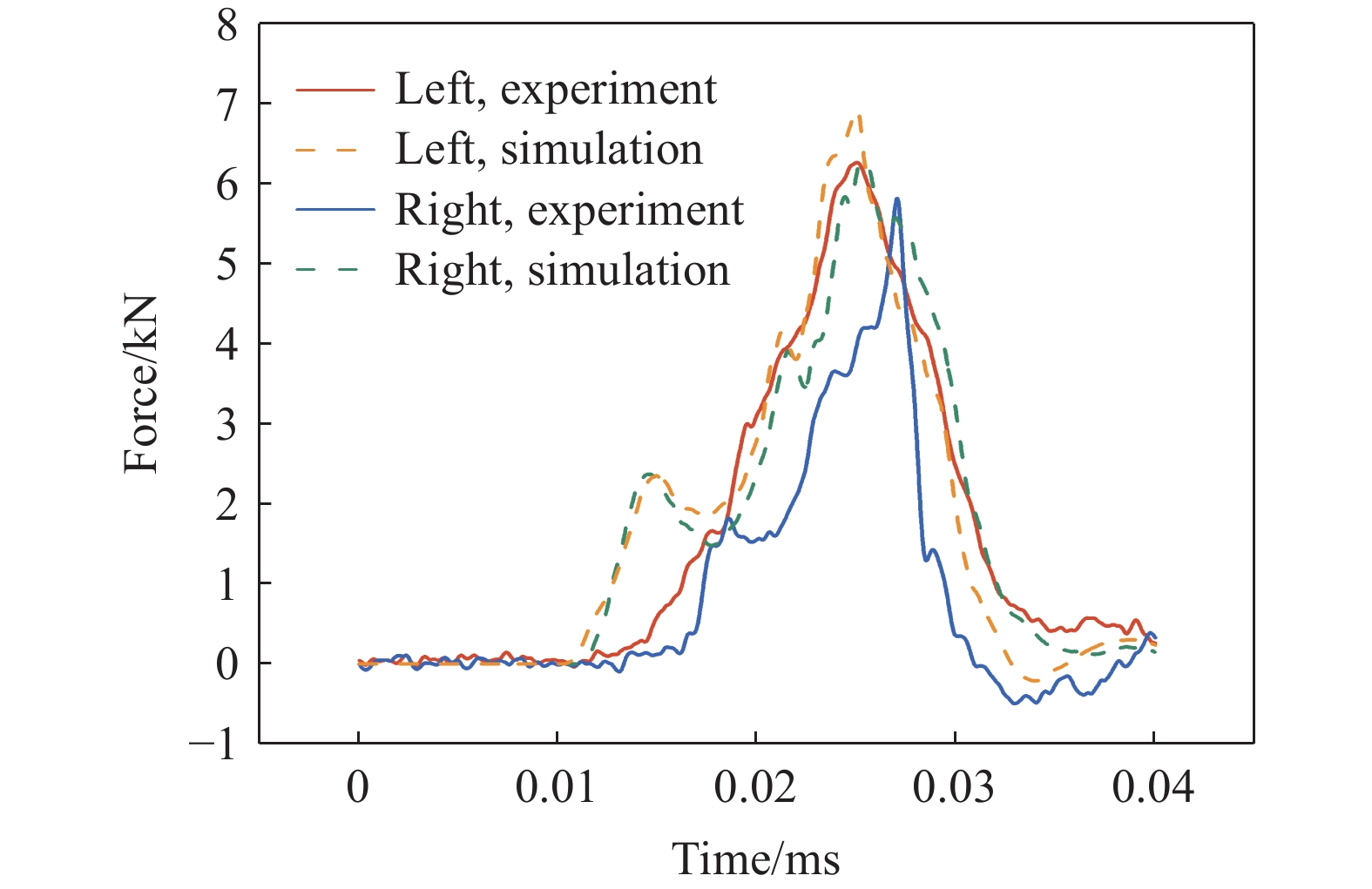 In order to select the shaped charge structure suitable for large-distance non-contact penetration damage in water, three typical shaped charge structures, explosively formed projectile ( EFP ), jetting projectile charge ( JPC ) and shaped charge jet ( JET ), were selected. The velocity tests of different penetrators before entering water, before hitting the target and after penetrating the target were carried out, and the penetration tests of double-layer spaced targets in water were carried out.Firstly, a comparative test of penetration of three kinds of shaped charge in air was carried out to verify the rationality of the structure of shaped charge. The air explosion height of 35 cm was selected to meet the requirements of penetration of the three kinds of shaped charge. At the same time, the velocity of the three kinds of shaped charge before penetrating into water was measured, which provides the basis for underwater penetration test. Secondly, the penetration test of three kinds of shaped charge on underwater double-layer spacer target was carried out when the air height was 35 cm and the length of water medium in front of the target was 20 cm, 45 cm and 100 cm. The reflected pressure curves of shaped charge penetration in water were measured by wall pressure sensor and PVDF sensor respectively. The velocity of the penetrator at the time of water entry, before the target and after the target is measured by the double-layer on-off net target. Through the damage effect of the double-layer interval target plate, the damage performance of the three shaped charge structures to the water medium in front of the near, middle and far targets is obtained.Based on the projectile-target structure used in the experiment, a two-dimensional finite element model of shaped charge penetrating into a double-layer spaced target in water was established by using ANSYS / LS-DYNA finite element software. The measured velocity values of the shaped charge penetrator before entering the water, before hitting the target and after passing through the target were compared with the numerical simulation values to verify the accuracy of the model. The error rate is about 3 %. Based on the verified finite element model, the time series characteristics of the underwater damage element of the shaped charge, the peak characteristics of the forward shock wave in the water, the variation law of the penetration velocity in the water, and the penetration performance of the shaped charge against the double-layer spacer target in the water were studied.The results show that the forward shock wave reaches the target plate before the penetrator when the three shaped charge penetrates the water spaced target plate. As the length of the water medium increases, the peak pressure of the forward shock wave at the front target plate decreases linearly, and the peak pressure of the forward shock wave at the rear target plate decreases nonlinearly. The velocities of EFP, JPC and JET decrease nonlinearly with the increase of water medium, and the velocity in front of JET target is about twice that of JPC. When the length of the water medium in front of the target is not more than 25 cm, the maximum perforation diameter formed by EFP on the front target plate reaches 5 cm, which is 1.3 times that of JPC perforation diameter and 3 times that of JET perforation diameter. When the length of water medium in front of the target is 0~100 cm, both JPC and JET have good penetration effect on the double-layer spacer target, and the penetration performance of JPC is better than that of JET. Therefore, it can be concluded that both JPC and JET can meet the design requirements of shaped charge structure for non-contact penetration damage at large distance in water.