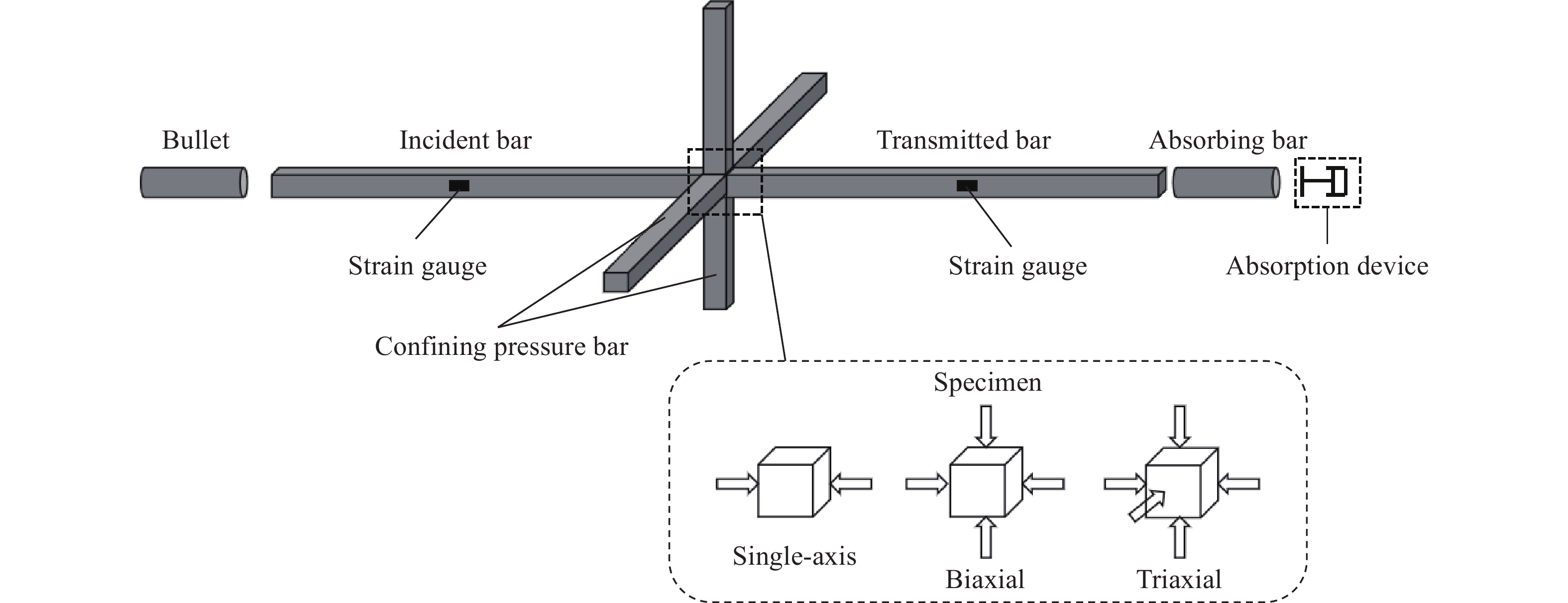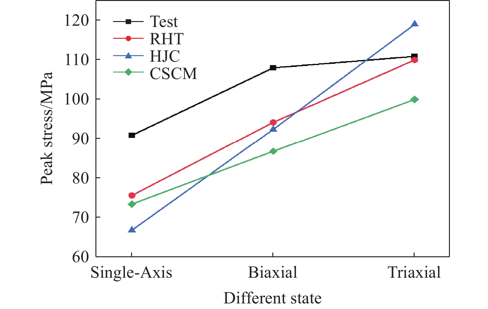 The dynamic mechanical properties of deep rocks are critical to understanding geological processes and optimizing resource extraction. Accurately understanding the dynamic mechanical properties of deep rocks not only provides insights into the geological processes and evolution of Earth's interior, but also offers a theoretical basis for the effective extraction of deep minerals and energy. In this study, the dynamic mechanical behavior of white sandstone from a coal mine was experimentally and numerically analyzed under uniaxial, biaxial, and triaxial stress conditions. Numerical simulations based on three constitutive models consisting of the Riedel-Hiermaier-Thoma (RHT) model, the Holmquist-Johnson-Cook (HJC) model, and the continuous surface cap model (CSCM), were validated by using experimental results from three-dimensional Hopkinson bar tests. The results indicate that the shear failure damage of white sandstone specimens decreases with the increasing prestress, with triaxial stress conditions yielding significantly lower damage than uniaxial or biaxial conditions. Among the three models, the RHT constitutive model demonstrates the closest agreement with the experimental results in terms of stress waveforms, peak stress, peak strain, and damage degree. Compared with the experimental data, the RHT model exhibits a stress peak deviation rate of 3.5% and 13.6% for the reflected wave under uniaxial and biaxial conditions, respectively, while the stress peak deviation rate for the transmitted wave is the lowest. Additionally, the peak stress and strain values predicted by the RHT model are numerically closer to the experimental results. The damage state predicted by the RHT model also aligns well with the experimental observations: under uniaxial loading, the damage exhibits a U-shaped pattern, whereas the HJC model showed a larger V-shaped damage pattern and fracture, and the CSCM model displayed surface damage with a smaller affected area. In terms of energy absorption and dissipation, the simulation results based on the three constitutive models shows minimal differences. The incident, reflected, and transmitted energy values are nearly identical across all three models. In addition, the damage degree of the white sandstone specimens increases with the impact velocity. The damage simulation results of the three constitutive models also show an increasing trend with the impact velocity, while retaining the damage characteristics.