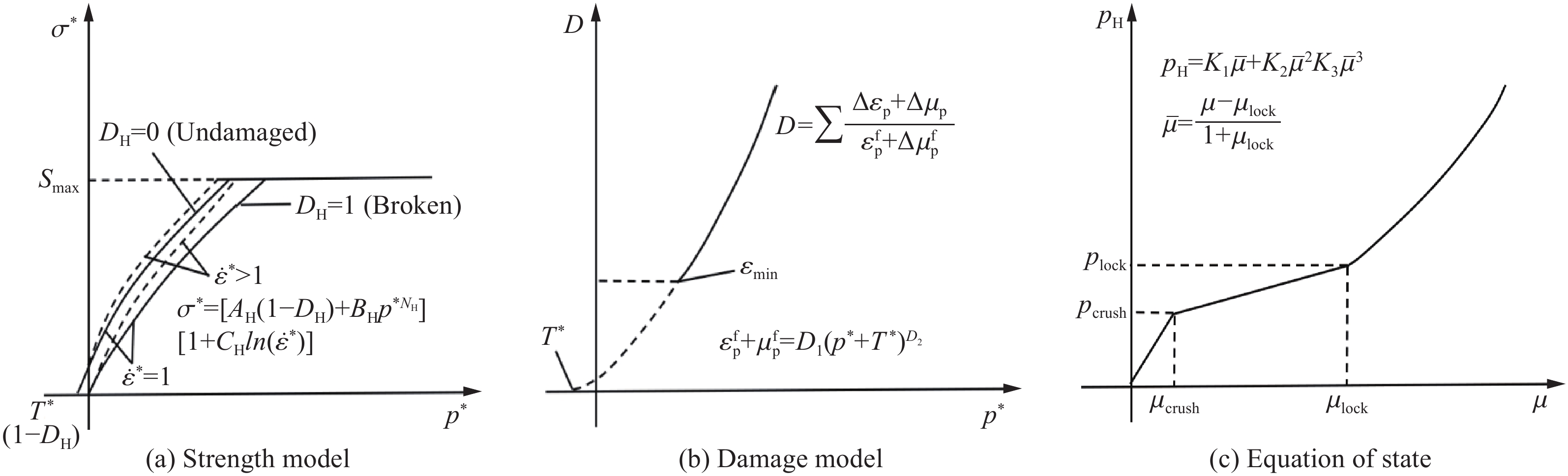 With the development of modern weapon systems, the requirements for the survivability of ammunition in various complex environments have been continuously increasing. During the processes of storage, flight, and combat, ammunition may be subjected to extreme impact loads such as high-speed impacts, shock waves, bullet impacts, and fragment impacts, which may cause plastic deformation and fracture of the ammunition casing structure, and even detonate the internal explosives. Such processes involve complex phenomena such as impact, material thermomechanical coupling, chemical reactions of explosive, and explosions. Accurate prediction of the ammunition responses under impact is of great significance. Based on the Hot Optimal Transportation Meshfree (HOTM) method, a meshfree numerical approach was proposed to accurately predict the ammunition responses under different impact loadings. Coupled with EigenErosion method, the HOTM scheme enabled a robust simulation of highly-coupled thermomechanical problems involving large deformation, plasticity, phase transition, explosion, and material fracture. Meanwhile, a thermo-mechanical-chemical coupling constitutive model of explosives was established at macro scale, which took the effects of local temperature and local pressure on the explosive’s chemical reaction and detonation into account. Specifically, the Arrhenius thermo-chemical reaction kinetics model was applied to describe the dependence of explosive reactions on local temperature, and the Lee-Tarver pressure three-term ignition model was implemented to describe the dependence of detonation on local pressure. At the same time, the heat generated by the explosive reaction is also calculated via a chemical kinetics model. By coupling these models, the proposed model for explosives enables accurate simulations of the different detonation mechanisms of explosives at different impact velocities. With the help of the constitutive model, the HOTM method provides simulations of complex physical phenomena such as high-speed contact, large plastic deformation of the metal casing, material fracture, heat conduction, explosive detonation, and the expansion work of chemical reaction products during the process of ammunition being subjected to impact loads. To demonstrate the capability of the proposed method, two numerical simulations were conducted with different impact loadings, namely the bullet impacting the ammunition (at a speed of 850 m/s) and the fragment impacting the ammunition (at a speed of 1850 m/s). The simulation results show significant differences in the behaviors of explosives. Under low-velocity impact, only a part of the explosives experiences sharp reaction, implying the reaction is expedited due to high local temperature caused by large plastic deformation of metal casing and friction. As a contrast, the ammunition was detonated by high-velocity impact, which indicates that ultra-high pressure caused by the impact led to the significant reaction of the whole explosive and finally caused the detonation. The research results show the capability of the proposed approach to describe different ignition mechanisms under different loadings. Thus, the proposed approach can provide reliable technical support for the anti-impact design optimization and safety assessment of ammunition.