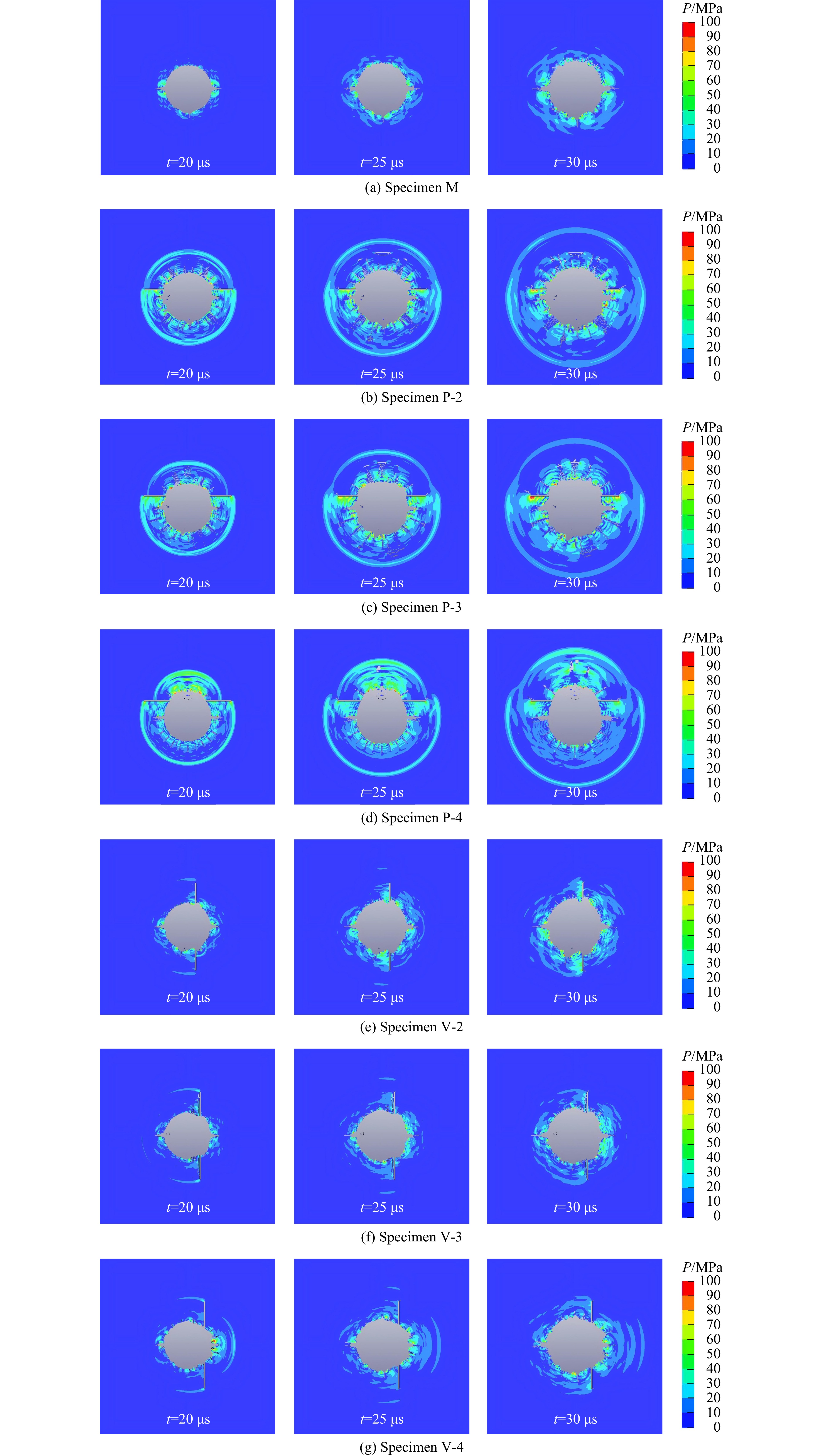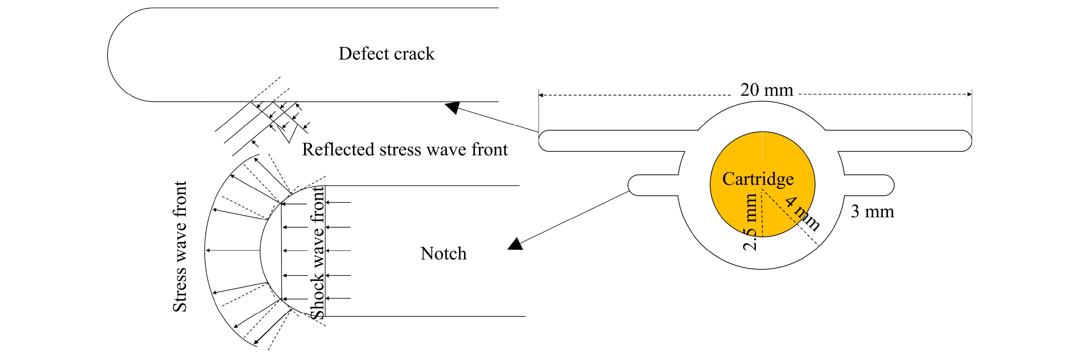 利用有机玻璃(polymethyl methacrylate, PMMA)材料在切槽炮孔壁上预制缺陷裂纹,以TATP(triacetone triperoxide)炸药为装药,采用动态焦散线实验结合数值模拟的方法,探究了炮孔壁缺陷对切槽爆破裂纹扩展的影响。结果表明:在平行缺陷处的应力波反射会导致切槽裂纹起裂方向向下偏移,而垂直缺陷处的应力波折射不影响裂纹起裂方向;孔壁缺陷的存在会抑制应力波及爆生气体对切槽处裂纹的作用,使其裂纹长度、扩展速度及强度因子均减小;抑制作用与缺陷到炮孔中心的距离有关,当缺陷远离炮孔中心时,平行缺陷对两侧切槽裂纹的抑制作用逐渐减弱,垂直缺陷对远侧切槽裂纹的抑制作用逐渐减弱,对近侧切槽裂纹的抑制作用逐渐增强;垂直缺陷左右的切槽裂纹受边界反射应力波作用相比平行缺陷更显著,左侧裂纹由于前期受缺陷处的反射应力波作用,并不呈现明显规律,但右侧裂纹随垂直缺陷远离炮孔中心,受边界反射应力波的作用显著减弱。