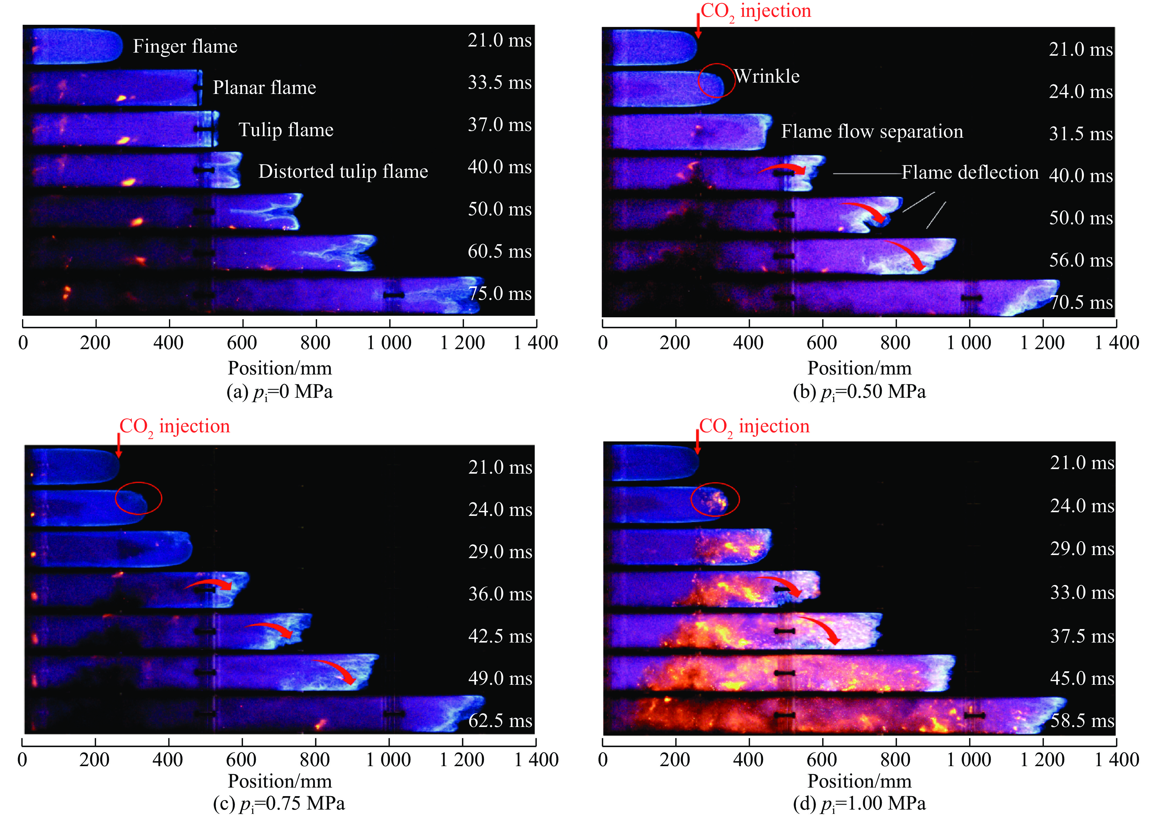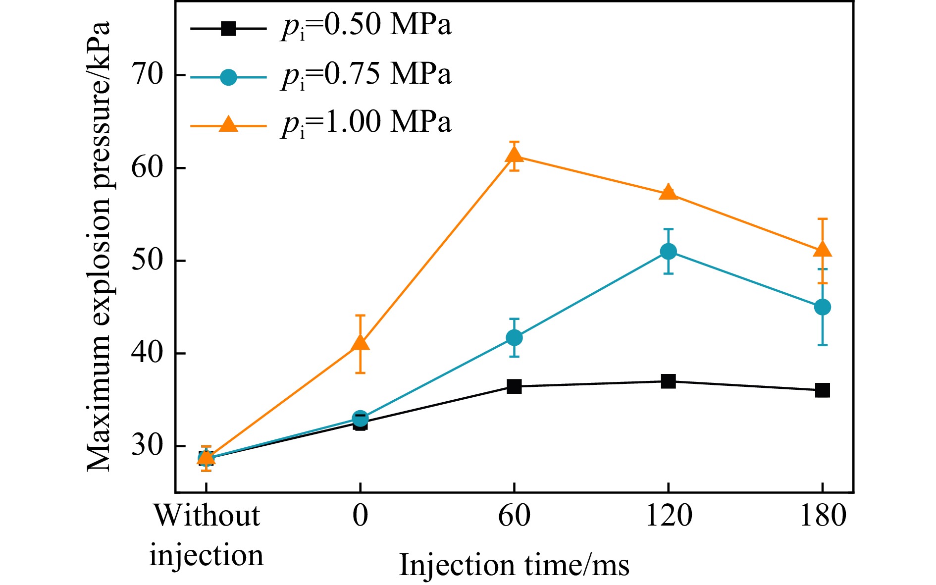 煤制氢是煤炭能源低碳转型的有效方案,针对煤制氢通入天然气管网大规模输送过程中的安全问题,研究非预混CO2喷射对掺氢天然气爆炸特性的影响。设计并搭建了爆炸实验平台,探究非预混CO2的喷射压力(0~1.00 MPa)和喷射时间(0~180 ms,喷射早于点火开启的时间)对爆炸火焰传播行为和压力特性的影响。结果表明:非预混CO2喷射显著影响甲烷/氢气/空气预混气的爆炸行为。CO2喷射会引起湍流效应导致火焰褶皱和结构改变,从而使火焰的传播速度和爆炸压力增大。当喷射时间固定(如0或120 ms)时,增大喷射压力会引入更多的CO2,增强局部湍流和扰动,加剧火焰加速和爆炸后果。随着喷射时间延长,不同喷射压力下最大爆炸压力均呈先升后降的趋势。CO2喷射对爆炸湍流的促进作用和稀释作用相互竞争,并存在临界喷射时间。过多的CO2喷射时会增强它的稀释作用,削弱CO2喷射对爆炸的湍流扰动能力,降低爆炸强度。此外,较高的喷射压力有更短的临界喷射时间,同时较高喷射压力下的最大爆炸压力对喷射时间的变化有更强的敏感性。
