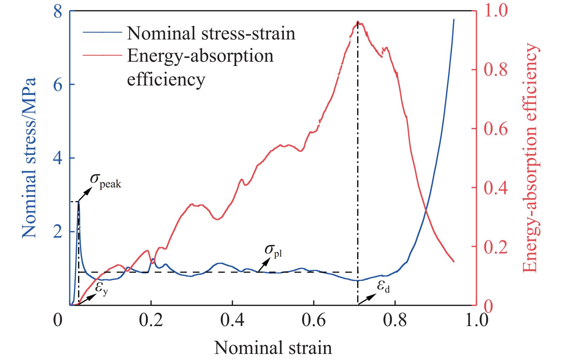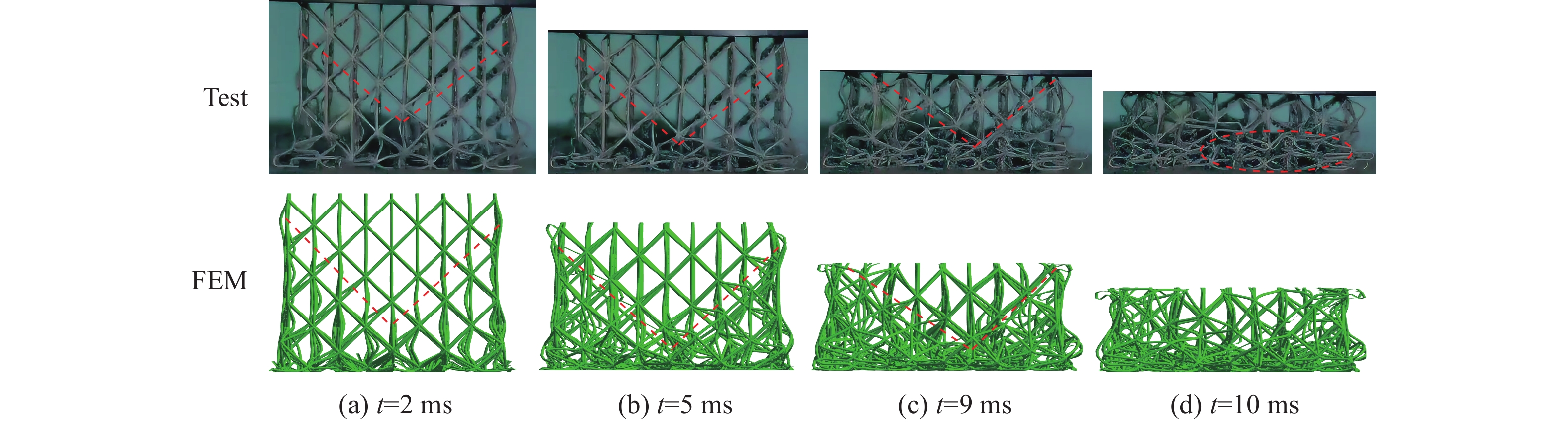 点阵力学超材料具有轻质、可设计和抗冲击等优点,在航空航天等许多领域具有广阔的应用前景。设计了一种米字形点阵力学超材料,采用选择性激光熔融技术制备了米字形点阵力学超材料试样,开展了落锤冲击试验和有限元数值模拟,研究了低速冲击载荷作用下点阵力学超材料的动态压溃行为和能量吸收机理,分析了冲击速度对米字形点阵力学超材料变形模式和能量吸收特性的影响规律。研究结果表明:冲击速度对米字形点阵力学超材料的变形模式有较大影响,在较低冲击速度下,点阵力学超材料的变形模式与准静态压缩下的变形模式相似,均以剪切带周围胞元的逐层压溃模式为主;在较高冲击速度下,点阵力学超材料的变形模式由X形剪切带转换为V形剪切带,最后演变为弧形剪切带;进一步研究发现,米字形点阵力学超材料呈现出一定程度的速率敏感性,随着冲击速度的增大,初始峰值应力、平台应力和比吸能增大。