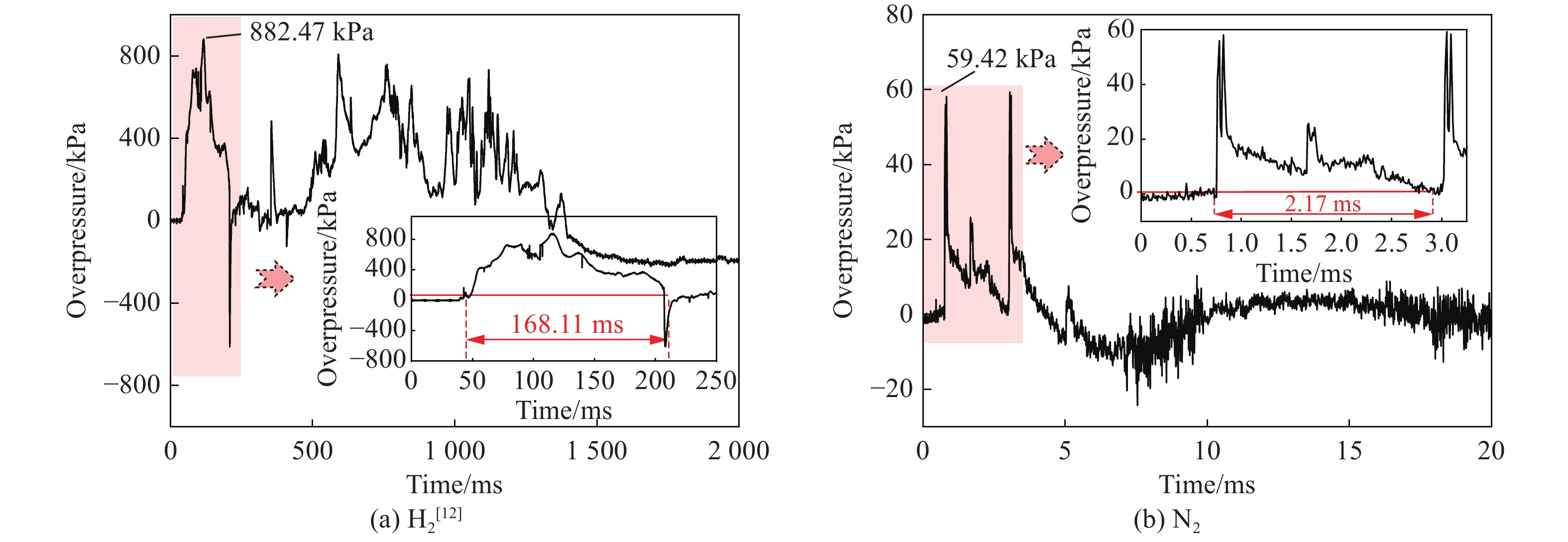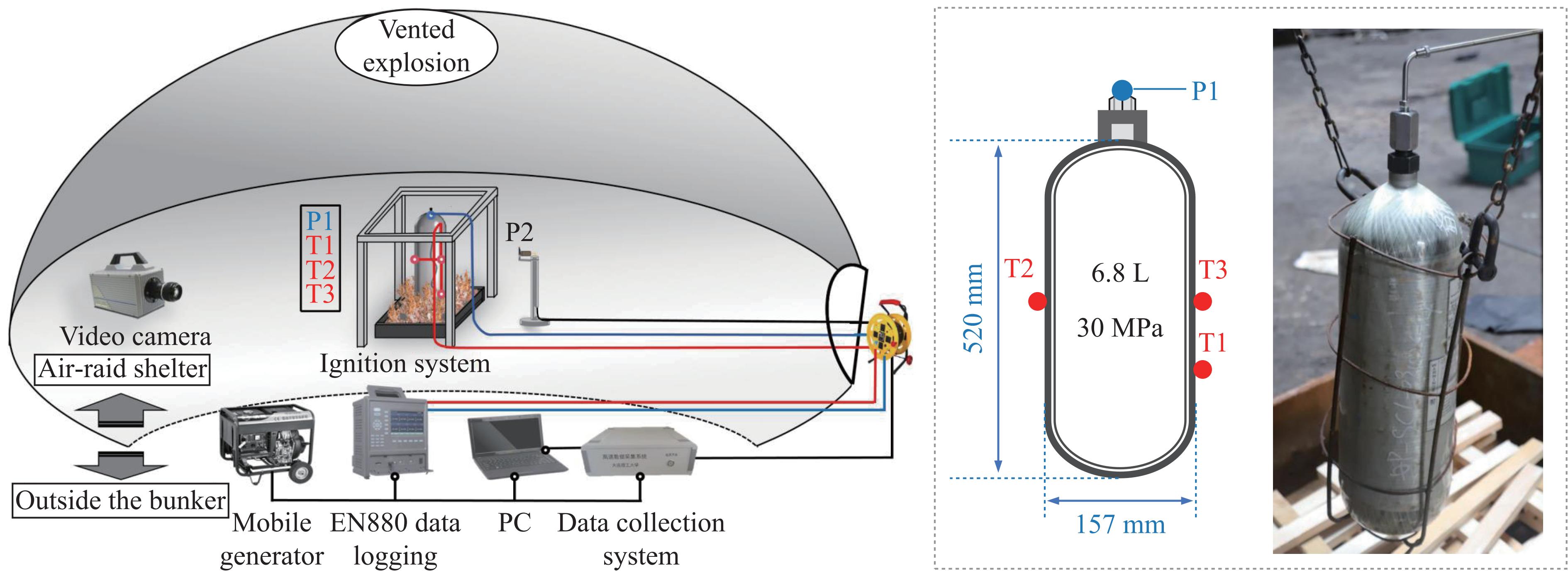 为掌握火灾环境下高压储氢气瓶爆炸能量产生、转化及耗散机制对气瓶爆炸的影响,以充装氢气和氮气的6.8L-30MPa Ⅲ型高压气瓶爆炸引发试验为基础,开展了气瓶极限承压判据、爆炸动力学行为及威力评估研究。结果表明:火灾可显著降低气瓶承压能力,气瓶的临界爆破压力由常温时的125.1 MPa降至火灾时的46.8 MPa,承压能力下降约62.6%。储氢气瓶爆炸呈现典型的物理-化学复合特征,产生了直径约9 m的火球,冲击波峰值压力在距离爆源2 m处达882.47 kPa,正压持续时间为168.11 ms;相同位置处的氮气瓶爆炸冲击波峰值为59.42 kPa,正压持续时间为2.17 ms,爆炸威力远小于氢气瓶。探讨了开敞环境下氢气瓶与氮气瓶爆炸能量的转化路径,建立了开敞环境下储氢气瓶爆炸威力评估方法,研究结果可为完善高压储氢气瓶爆炸事故风险评估提供参考。