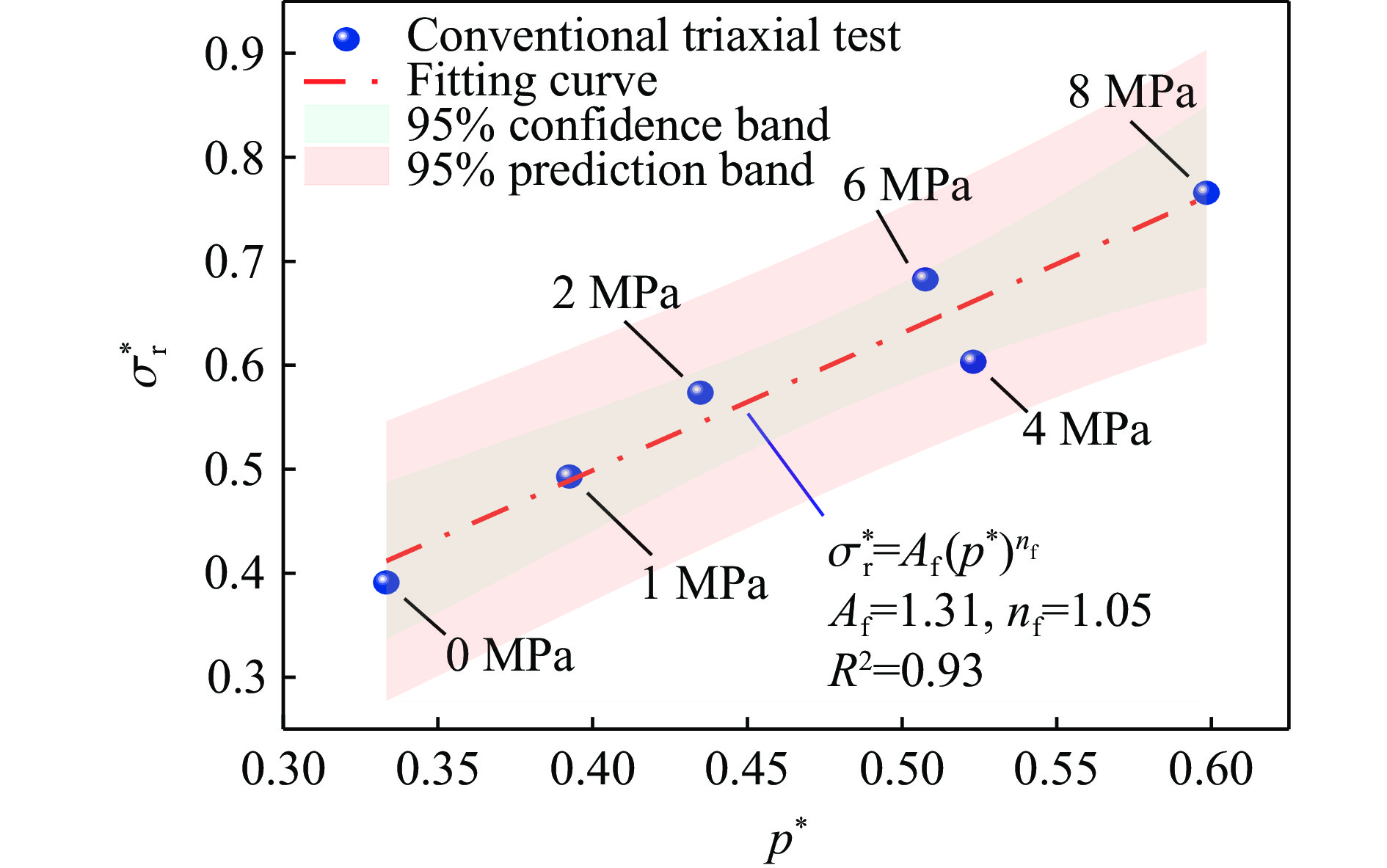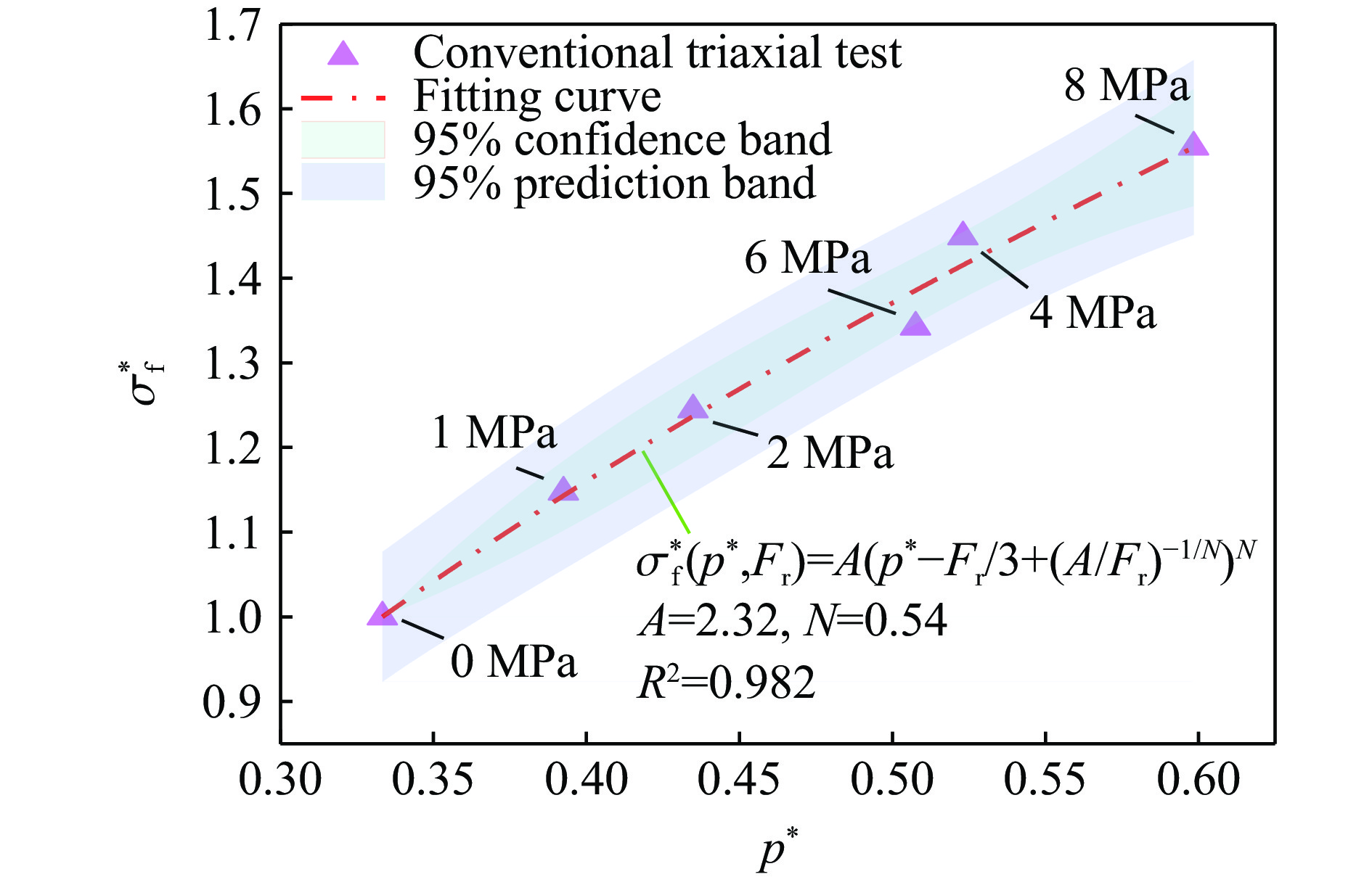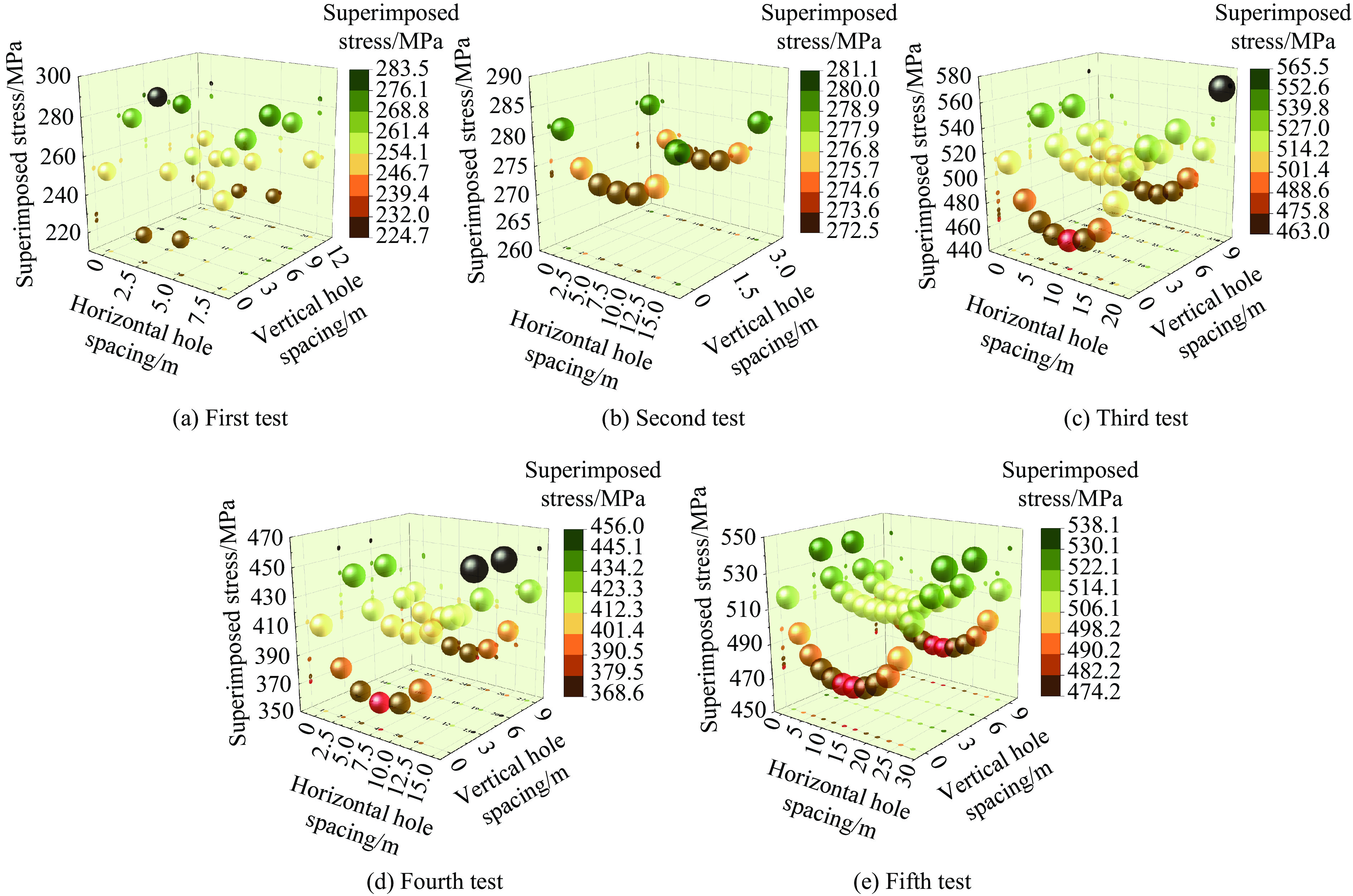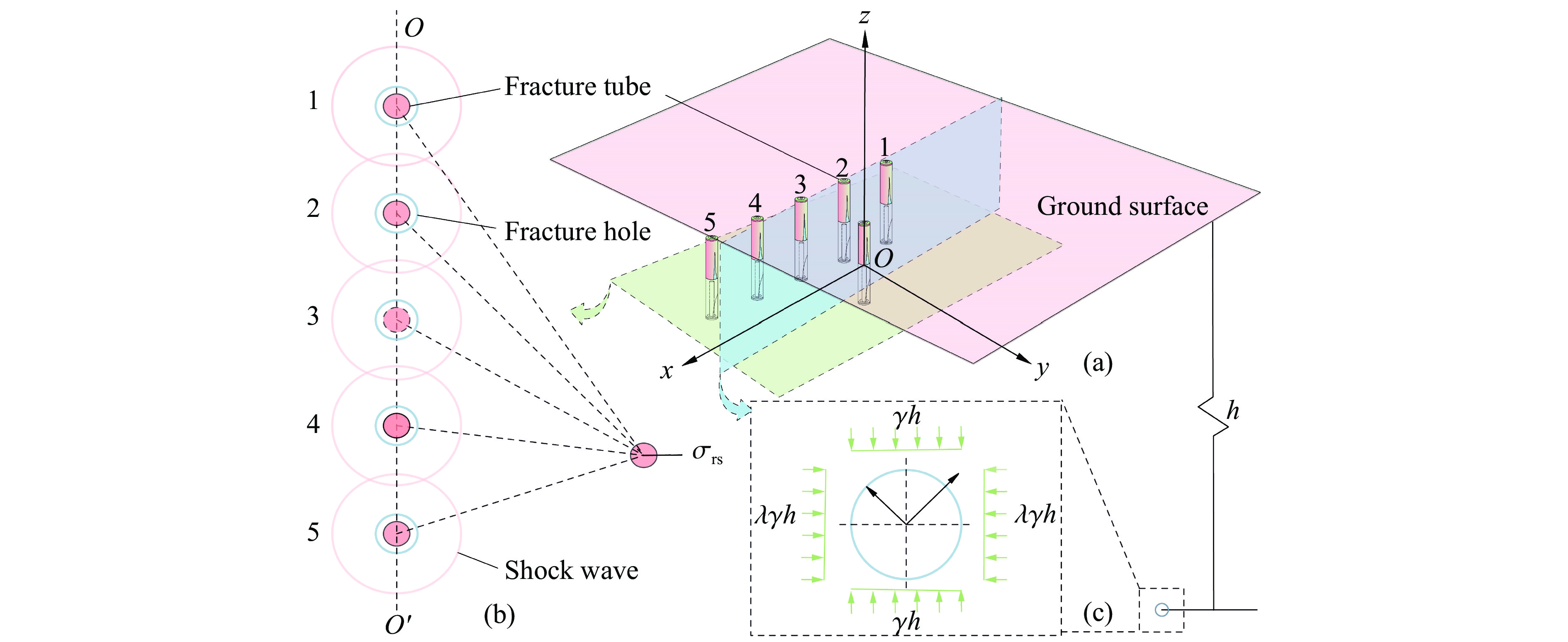 超临界CO2相变破岩是冲击波与高压气体协同作用下的动态破坏过程。为深入探究多孔同步激发与地应力耦合条件下的超临界CO2相变破岩机制,针对CO2现场破岩实际工况,基于薄壁圆筒理论解析了单孔初始破岩压力,结合一维爆生气体膨胀理论,构建了地应力作用下多孔冲击波与高压气体联合破岩半径预测模型,并通过现场多孔CO2相变破岩试验进行了对比验证。结果表明:当致裂管埋深较浅时,地应力对岩体应力分布的影响较微弱;当单孔压力一致时,致裂孔数量越多,各孔的叠加峰值应力越大;在垂直于测试孔布置方向,各孔的峰值应力均呈U形抛物线分布,两端的致裂孔的叠加应力最大;而在平行于测试孔布置方向,各孔的峰值应力均呈倒U形抛物线分布,中部致裂孔的叠加应力最大。此外,利用声波测试得到的现场多孔冲击下岩体损伤破坏范围呈三维漏斗状,竖向损伤破坏范围在5.05~5.73 m之间,平面损伤破坏范围在4.3~5.6 m之间,其中平面损伤破坏范围测试值与理论计算值的相对误差在5.0%~18.7%之间,计算误差多来自各致裂孔叠加应力的不均匀性。进一步分析可知:超临界CO2相变破岩半径随致裂孔叠加应力呈半抛物线式增长,随致裂孔深度呈对数式增长;当岩体抗压强度增大时,岩石断裂韧度近线性增长,对应破岩半径近线性下降。研究成果可为多孔超临界CO2相变破岩工程参数优化提供定量化设计依据。