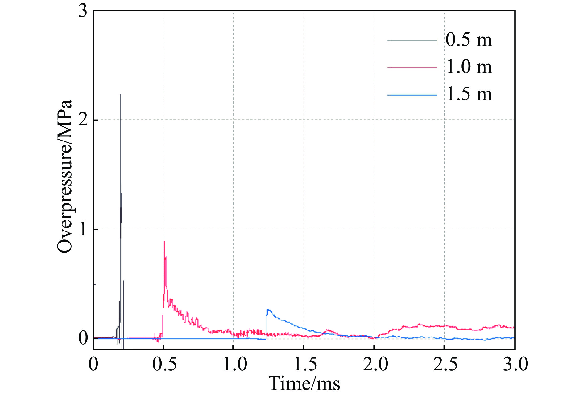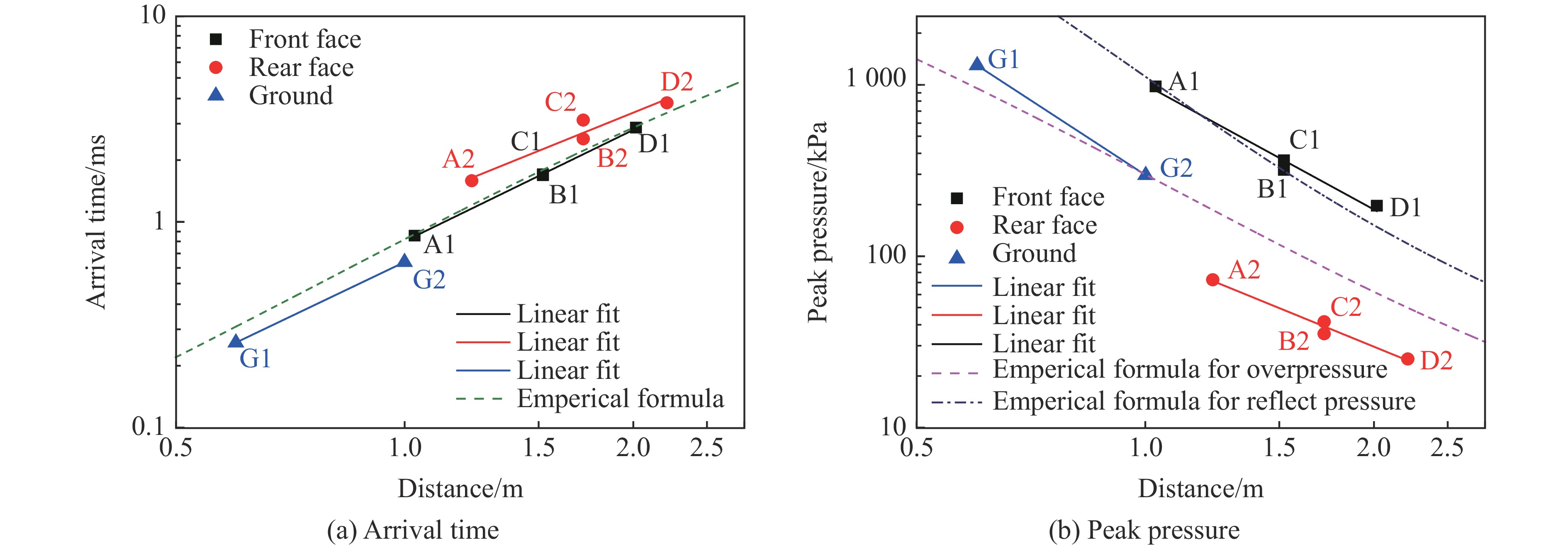 为深入研究触地爆下建筑表面冲击波载荷分布规律,首先开展了实验室环境下精细缩比实验,获取了球形炸药触地爆下缩比建筑模型表面测点冲击波压力时间曲线,得到了不同工况下冲击波特征参数分布规律;随后发展了冲击波传播数值模拟方法,并使用缩比实验数据对模拟方法进行校核,通过数值方法重点对建筑背爆面载荷分布及冲击波历程进行分析;最后发展了基于冲击波时程分析和叠加法则的理论分析方法,得到了建筑背爆面载荷分布的量化分析模型,并利用模拟结果进行验证。研究结果表明触地爆下建筑迎爆面最大冲击波载荷位于建筑底部,整体载荷分布较均匀;建筑背爆面载荷主要集中在顶角两侧及中轴线区域,由顶边和侧边绕射冲击波叠加形成,最大超压出现在不同绕射冲击波交汇位置,其位置和大小受建筑尺寸和爆心距影响。