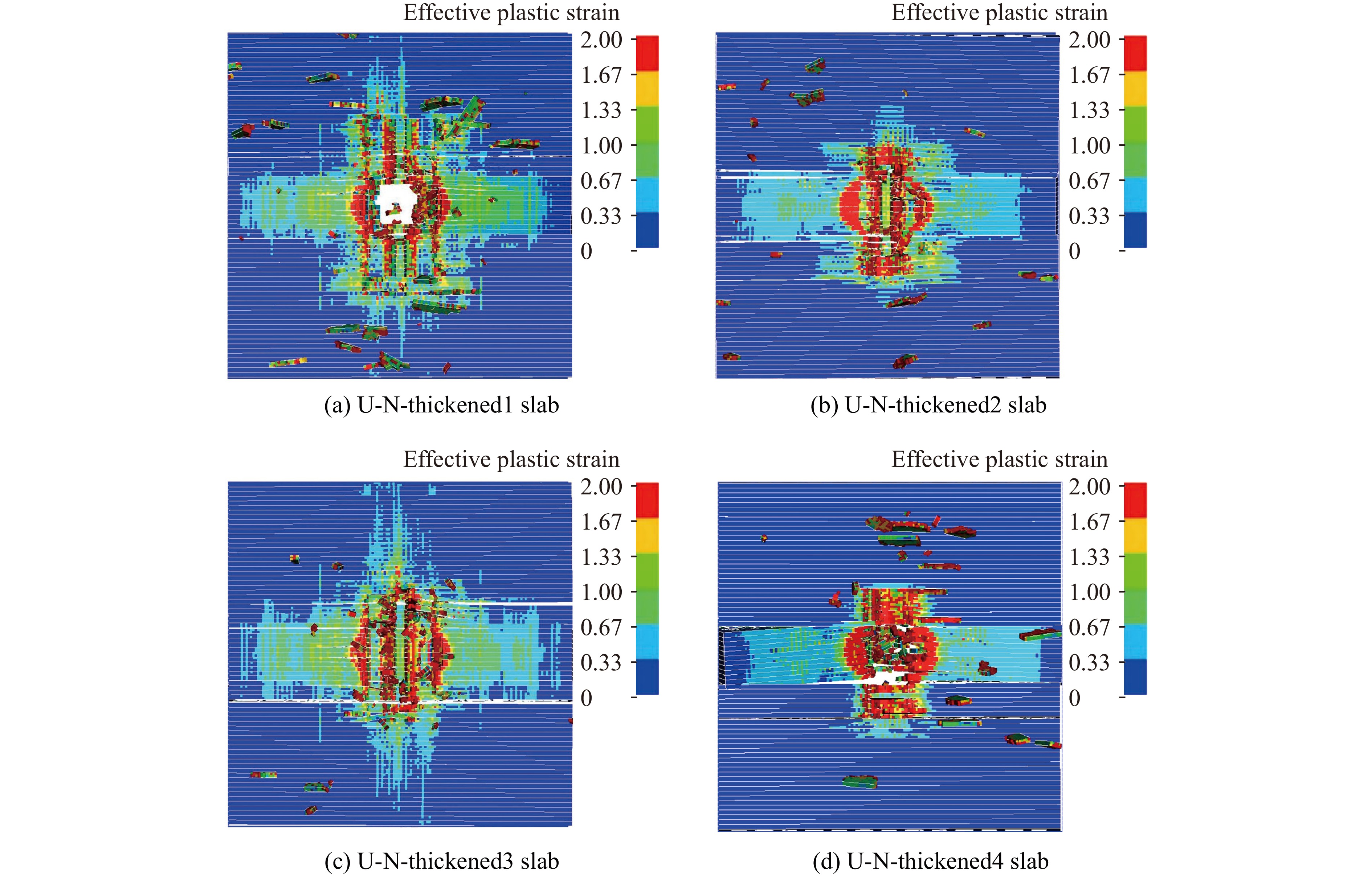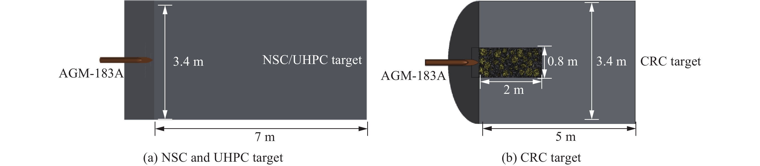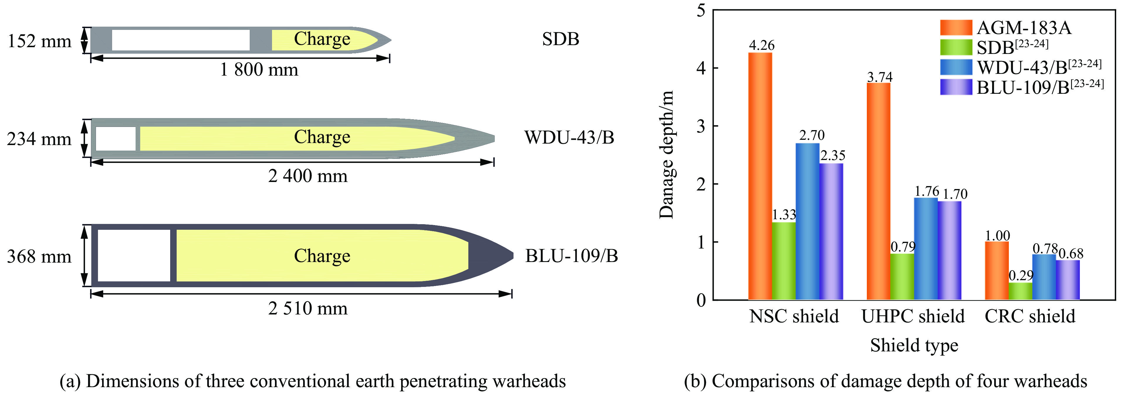 随着超高速武器的飞速发展,开展超高速武器战斗部侵彻混凝土遮弹层效能分析对于新建和已建防护结构的设计与安全评估具有重要意义。针对超高速武器战斗部打击普通强度混凝土(normal strength concrete, NSC)、超高性能混凝土(ultra-high performance concrete, UHPC)和刚玉块石混凝土(corundum rubble concrete, CRC)3种典型遮弹层问题,首先,通过对比钢/钨合金弹体侵彻3种靶体试验和数值仿真结果,验证有限元仿真分析方法中数值算法、网格尺寸和材料模型参数取值等的可靠性;然后,基于侵彻深度和弹体残余长度等效的网格过渡策略,建立了适用于原型工况分析的数值仿真分析方法;最后,在Ma为3~8工况下,开展了对AGM-183A超高速武器战斗部侵彻3种遮弹层的数值模拟。结果表明:AGM-183A超高速武器战斗部分别以Ma=4、Ma=4和Ma=3侵彻NSC、UHPC和CRC遮弹层的极限侵彻深度分别为4.26、3.74和1.00 m,侵彻速度继续增大时,弹体弧柱交接处因局部应力集中发生断裂等结构失稳现象,导致侵彻效能下降。与常规声速钻地武器战斗部SDB、WDU-43/B和BLU-109/B侵彻爆炸破坏深度相比,AGM-183A侵彻NSC遮弹层的深度分别达到3.2、1.6和1.8倍,侵彻UHPC遮弹层的深度分别达到4.7、2.1和2.2倍,侵彻CRC遮弹层的深度分别达到3.4、1.3和1.5倍。3种遮弹层抗AGM-183A超高速武器战斗部侵彻的建议设计厚度分别为8.01、7.03和1.88 m,UHPC相对NSC遮弹层的抗超高速侵彻能力提升不明显,CRC遮弹层可以有效兼顾抵抗常规声速和超高速战斗部打击,建议设计时优先采用。