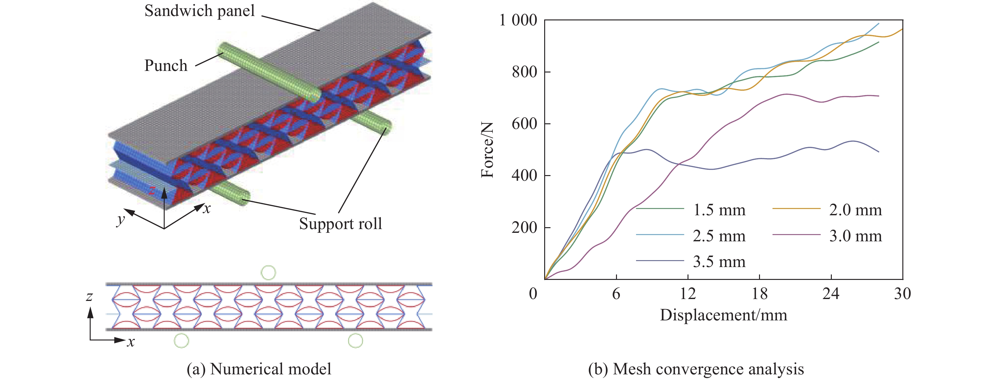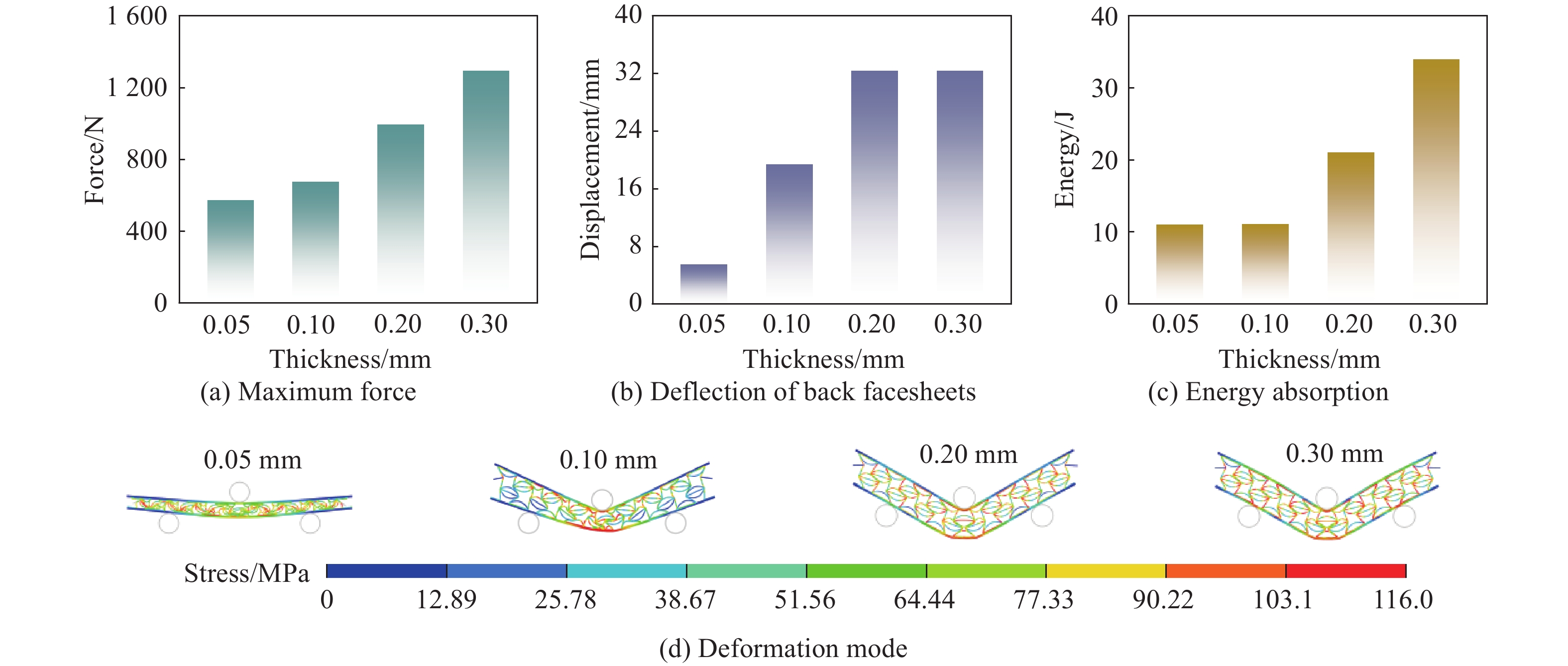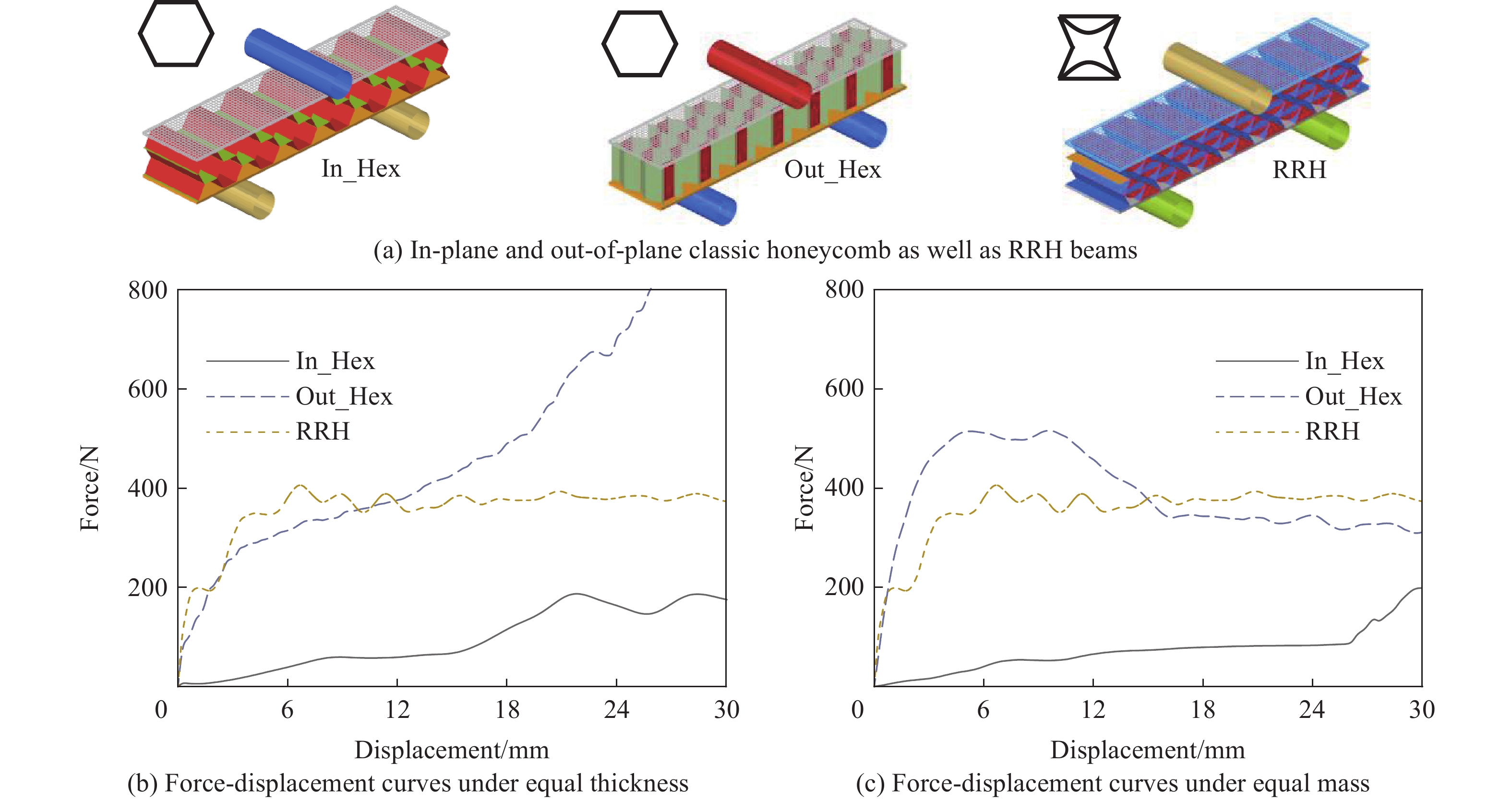 内凹蜂窝的悬链线增强方法通过同步改善中空结构提升承载、增强负泊松比效应、改善变形模式、利用悬链线结构高承载实现耐撞性的显著提升,在此基础上提出增强内凹蜂窝夹层梁。采用“冲压+粘接”方法分别制造传统、增强内凹蜂窝夹层梁金属样件开展三点弯曲实验,结果显示:悬链线结构通过抑制传统内凹蜂窝侧胞壁绕节点的旋转变形将其初始塑性变形后承载力的下降比例由29.3%减小至6.6%。相较于传统内凹蜂窝夹层梁,等相对密度增强内凹蜂窝夹层梁的最大承载力、能量吸收分别提高26.7%、8.9%。开展参数化研究确定面板、芯层壁厚对夹层梁三点弯曲力学行为均具有显著影响。基于参数化研究结果开展以面板、芯层壁厚为变量的夹层梁抗冲击性能多目标优化,相较于夹层梁初始结构,优化后夹层梁最大承载力和能量吸收分别提高64.9%和46.9%。与面内、面外传统蜂窝夹层梁分别进行等壁厚、等质量下的抗冲击性能对比,证明提出增强内凹蜂窝夹层梁更优异的吸能防护性能。研究结果可为传统蜂窝夹层结构的强化设计提供有益指导。